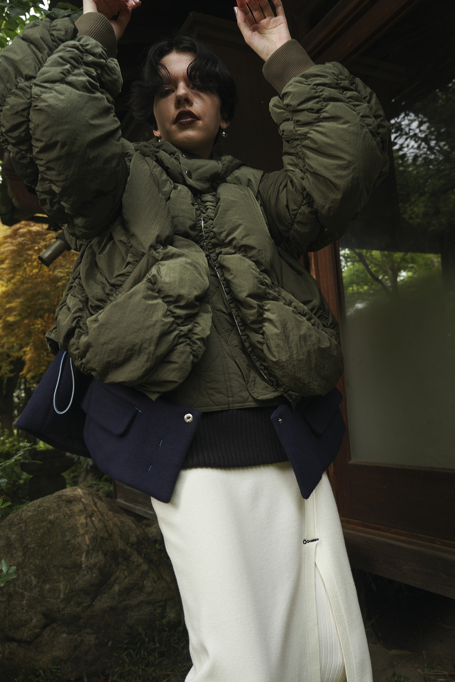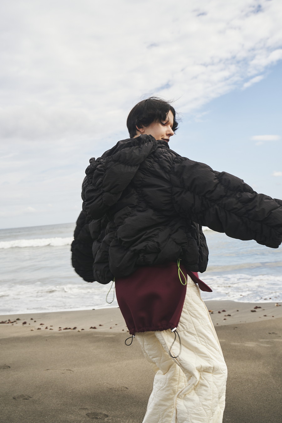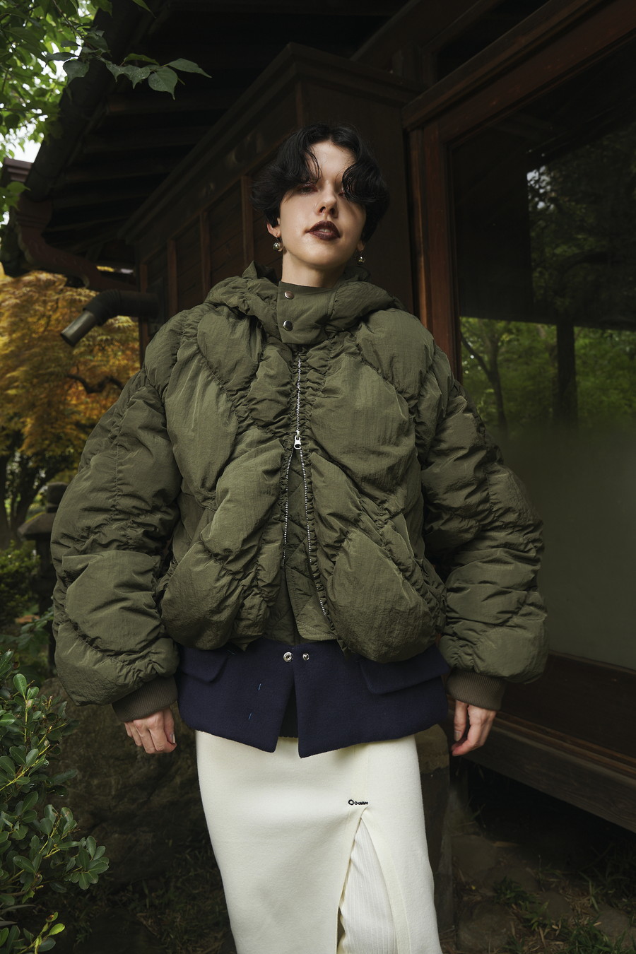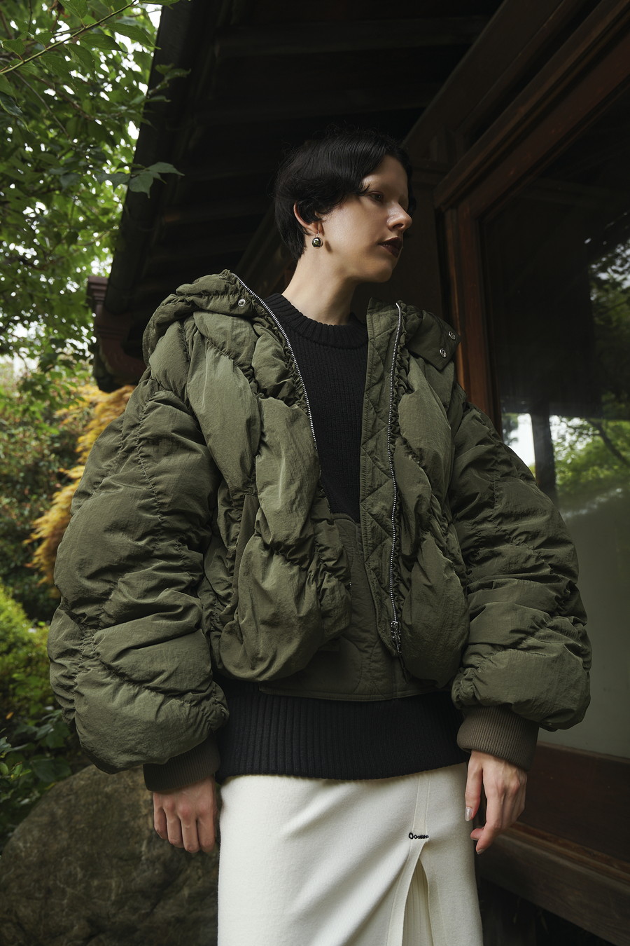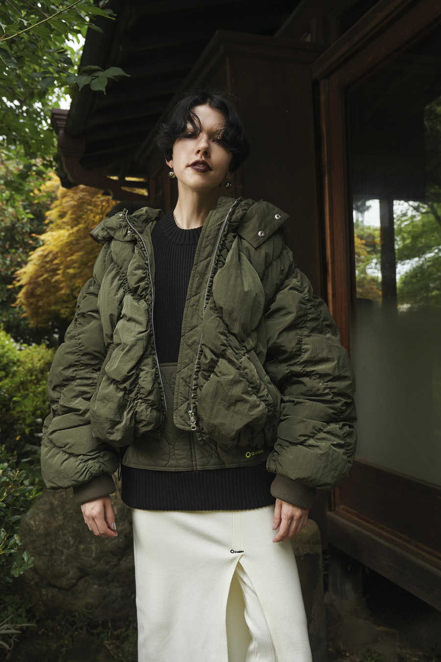 変形したキルティング柄にシャーリングを施した、OMMOらしい1着。