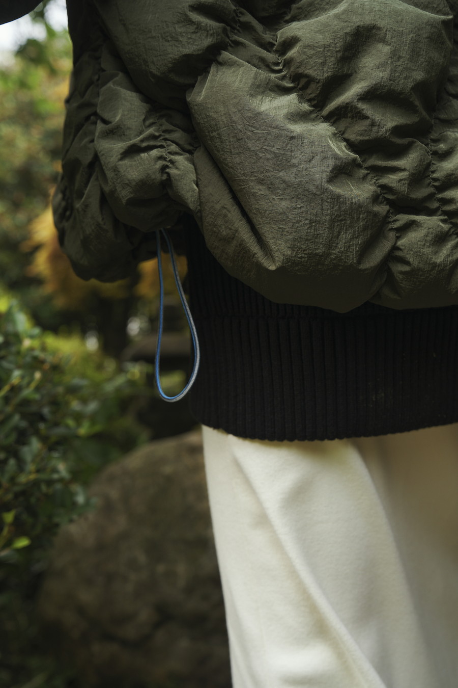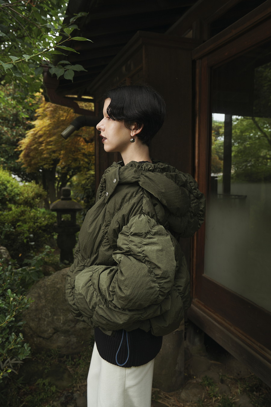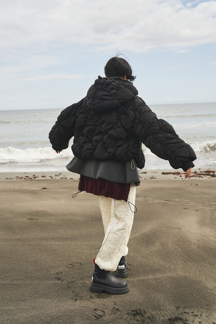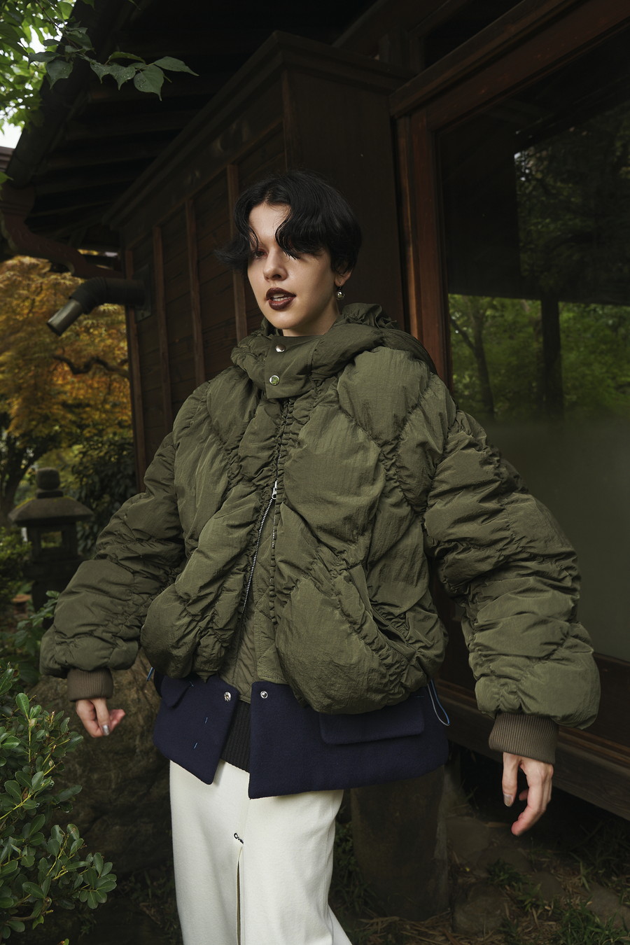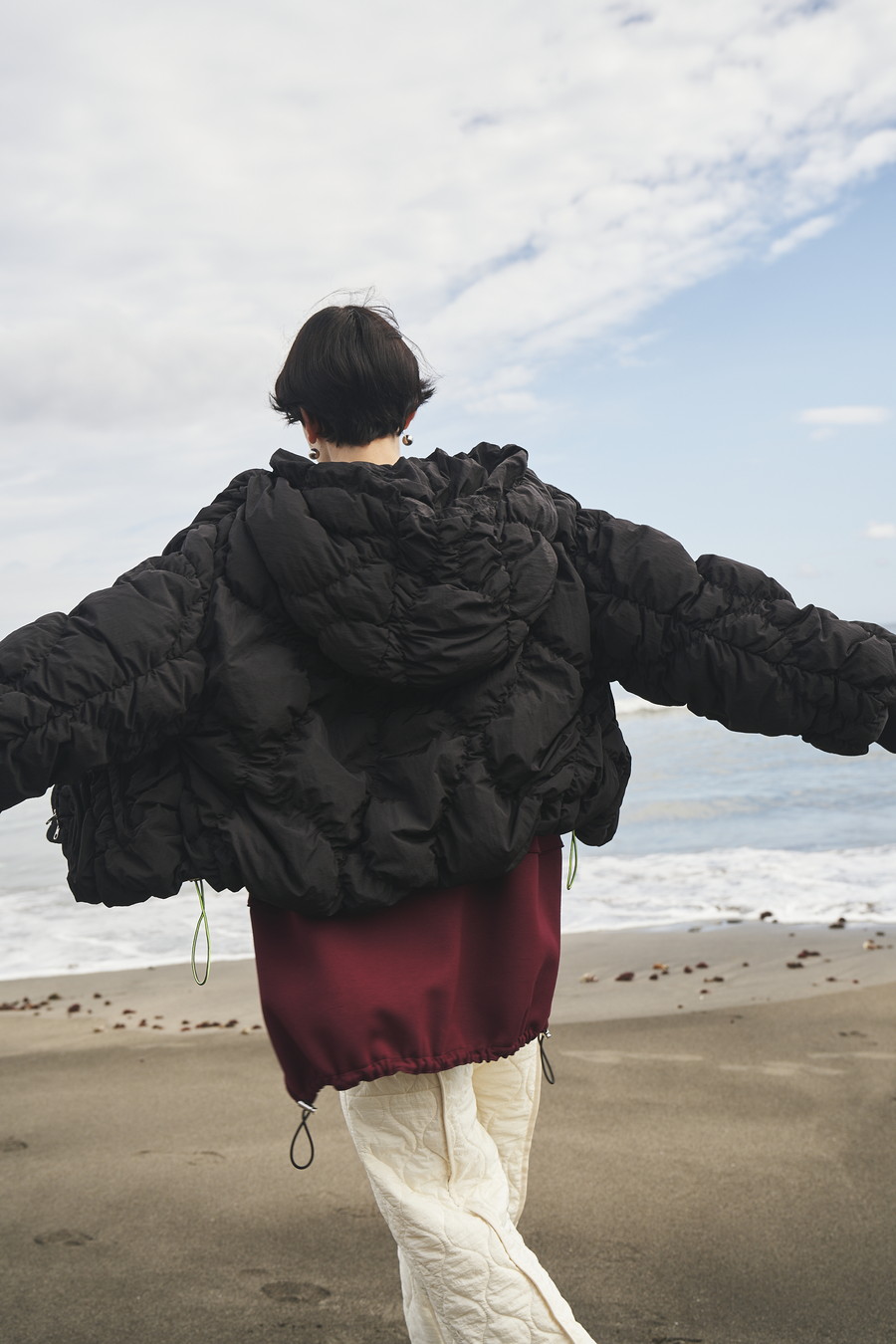 変形したキルティング柄にシャーリングを施した、OMMOらしい1着。
