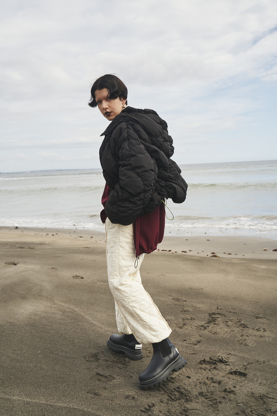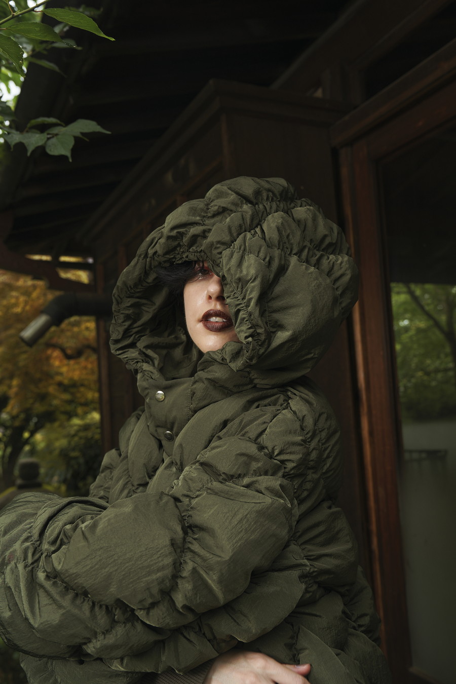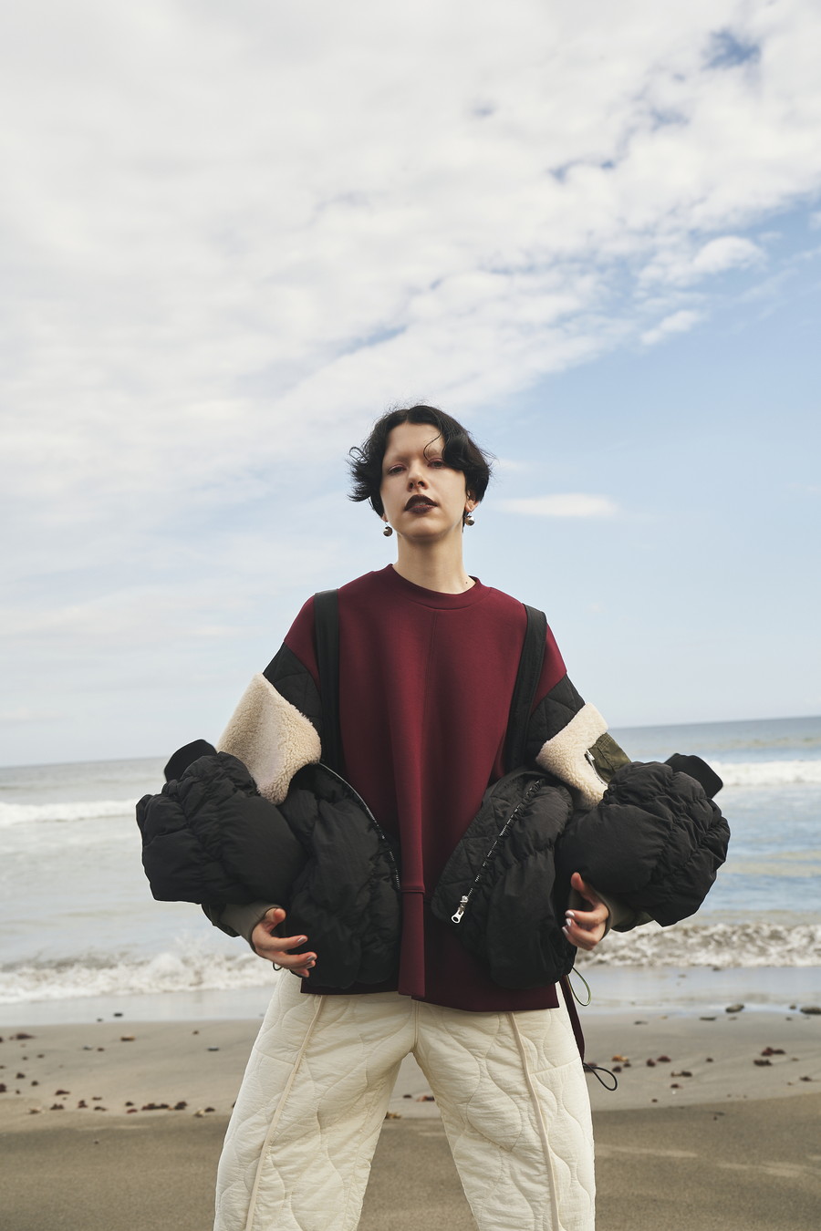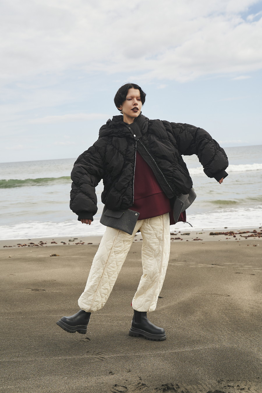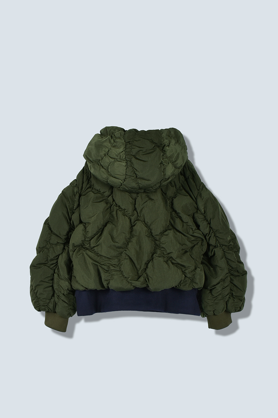 変形したキルティング柄にシャーリングを施した、OMMOらしい1着。
