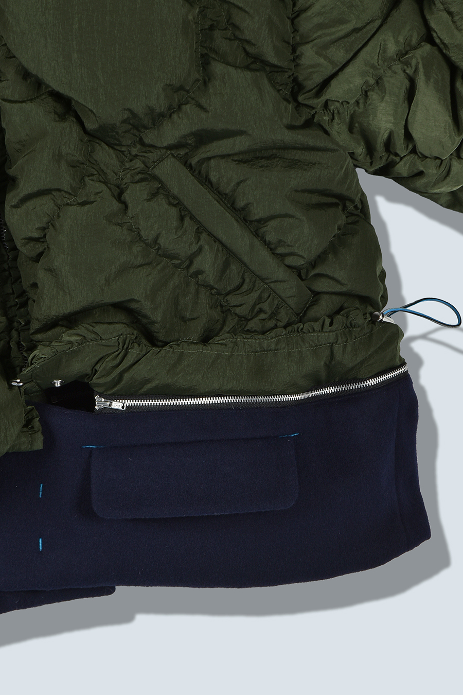 ウールコートをレイヤードしたようなデザインが目を引くダウンコート。裾にはファスナーで取り外せるウールパーツがあり、スタイリングの変化を楽しめる仕様です。