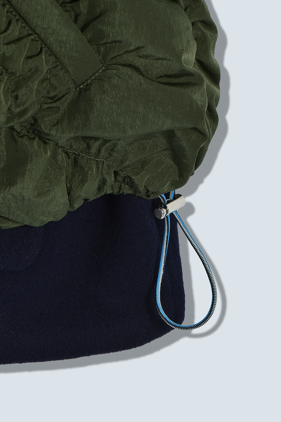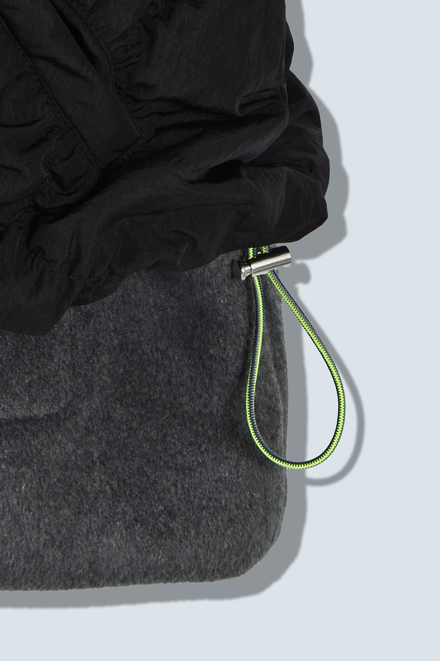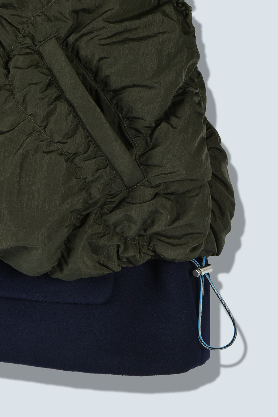 裾のドローコードでシルエットを調整でき、ミドル丈なのでバランスも取りやすいのが魅力。