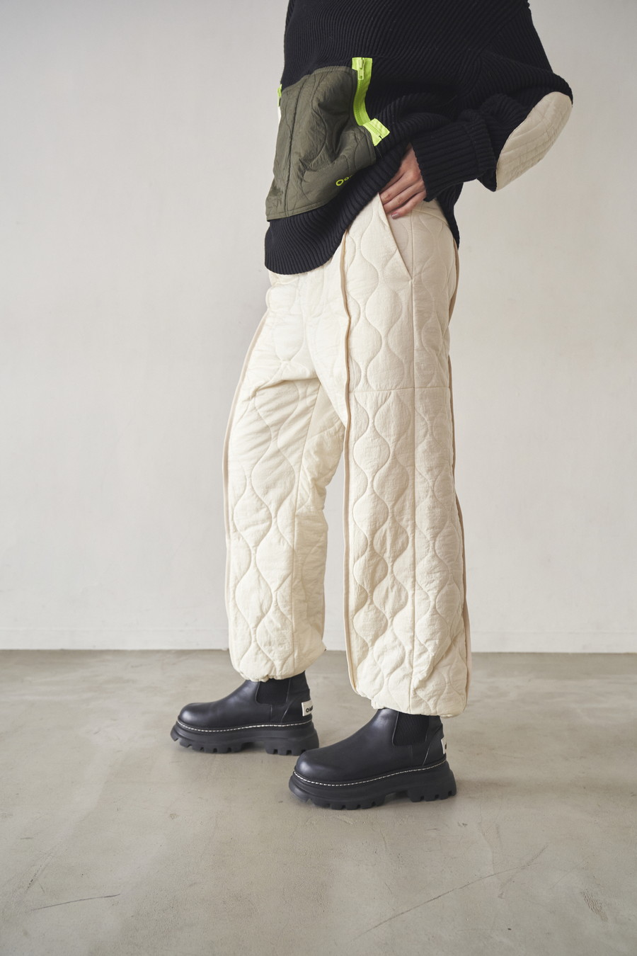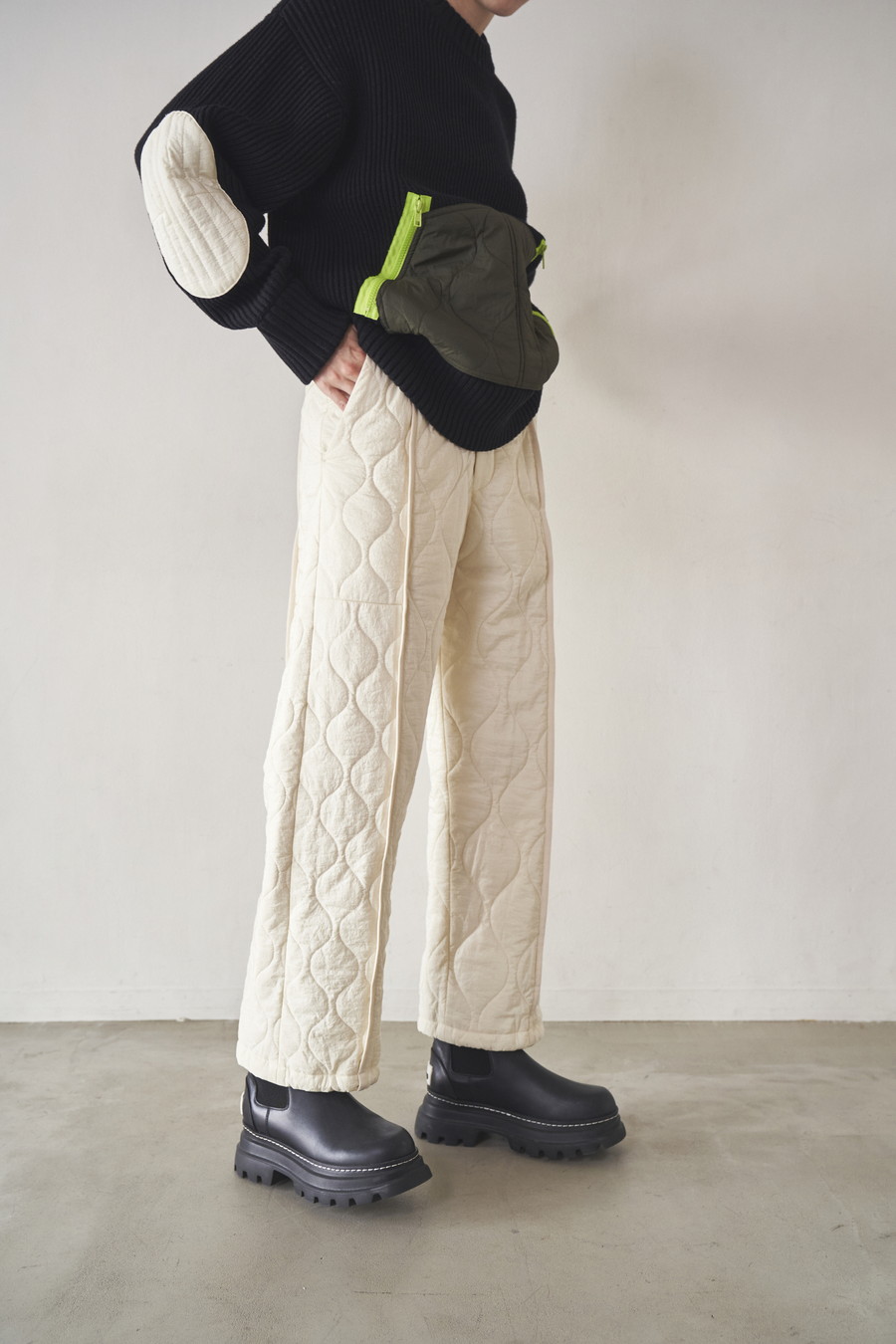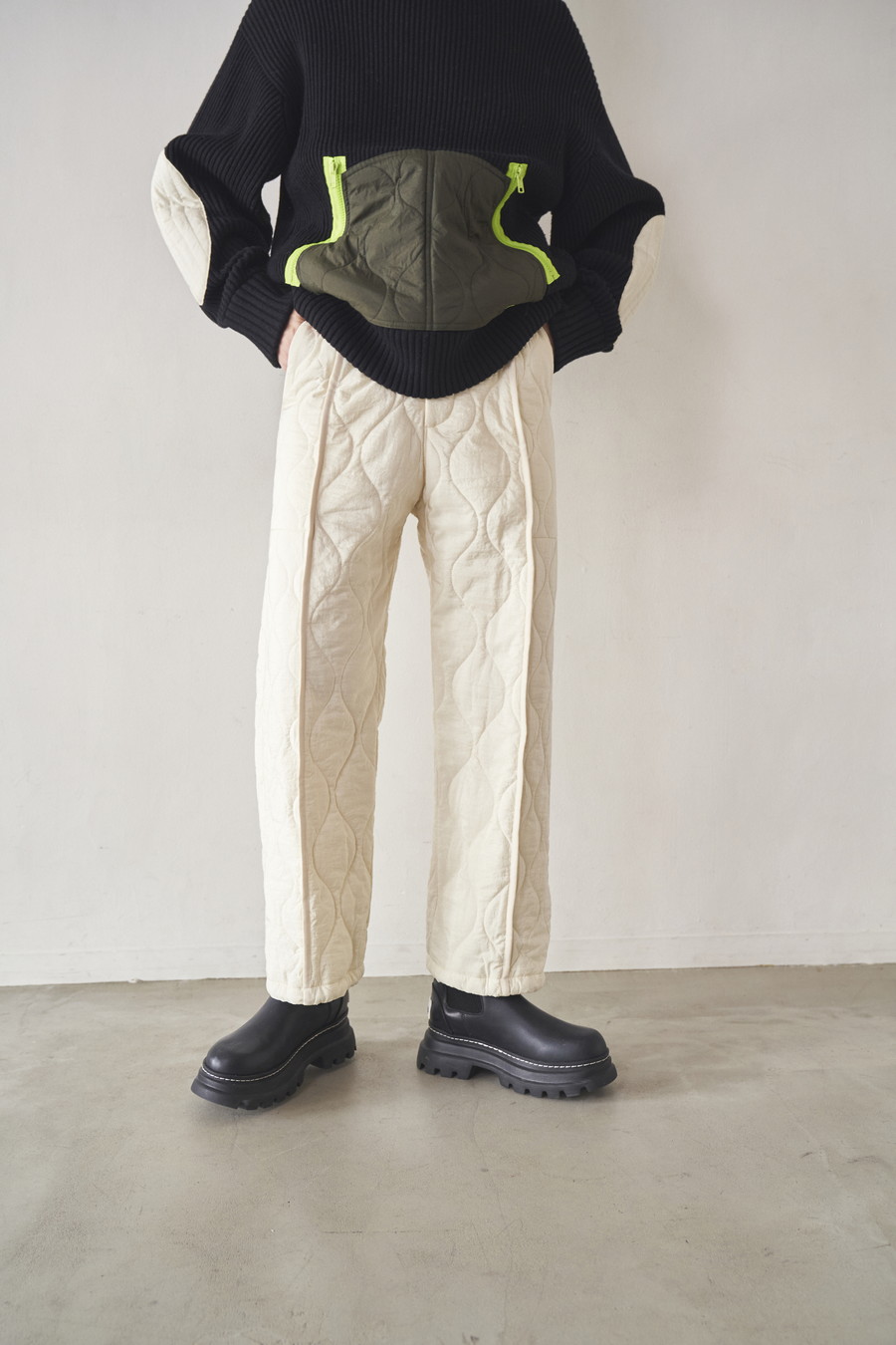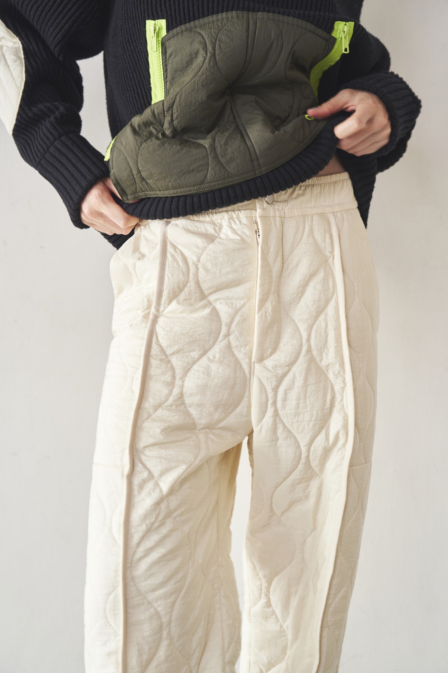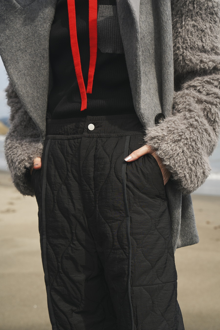 異なるサイズのキルティングを組み合わせた、シンプルながら立体感のある中綿入りキルティングパンツ。太すぎず細すぎない、すっきりとしたシルエットで、どんなトップスともバランスよく決まります。