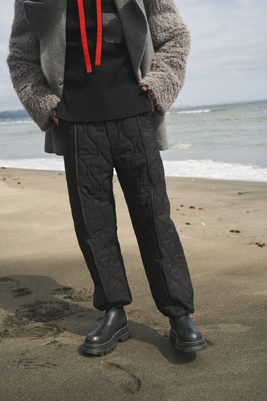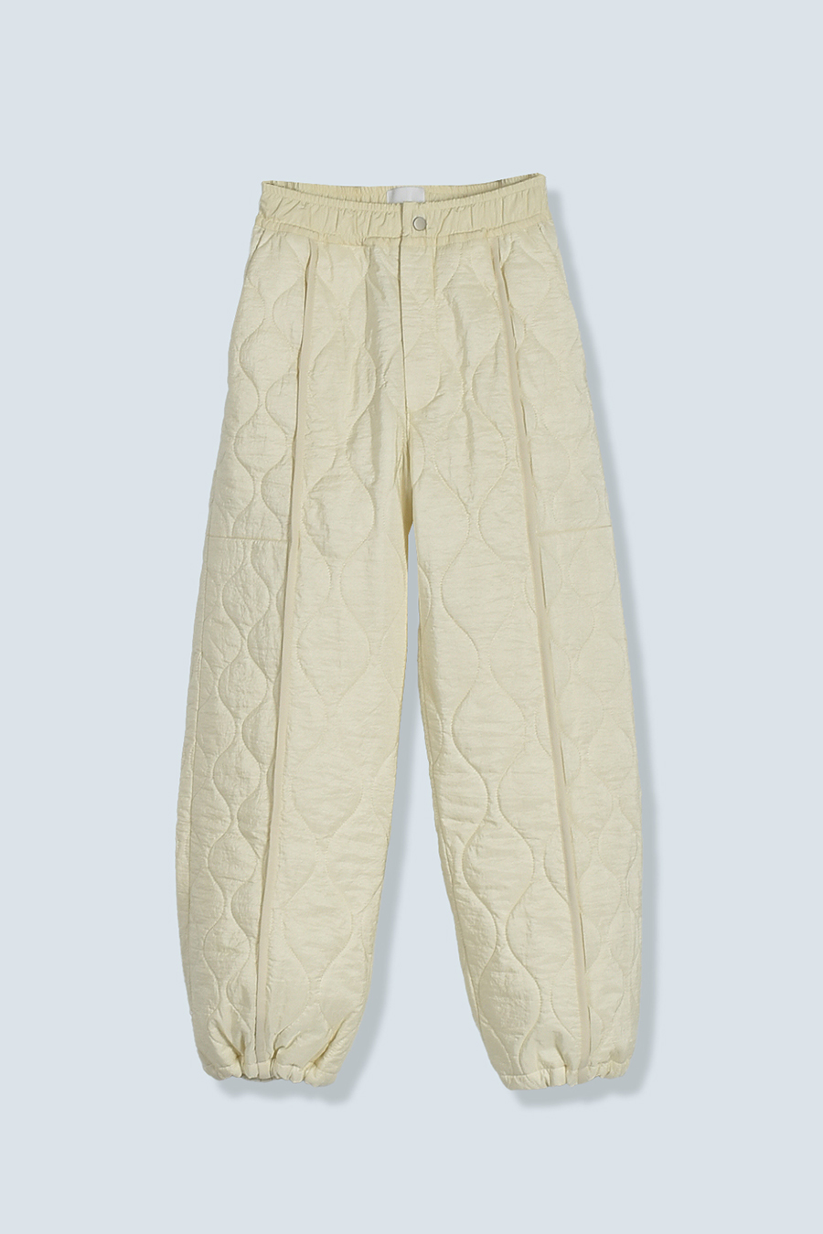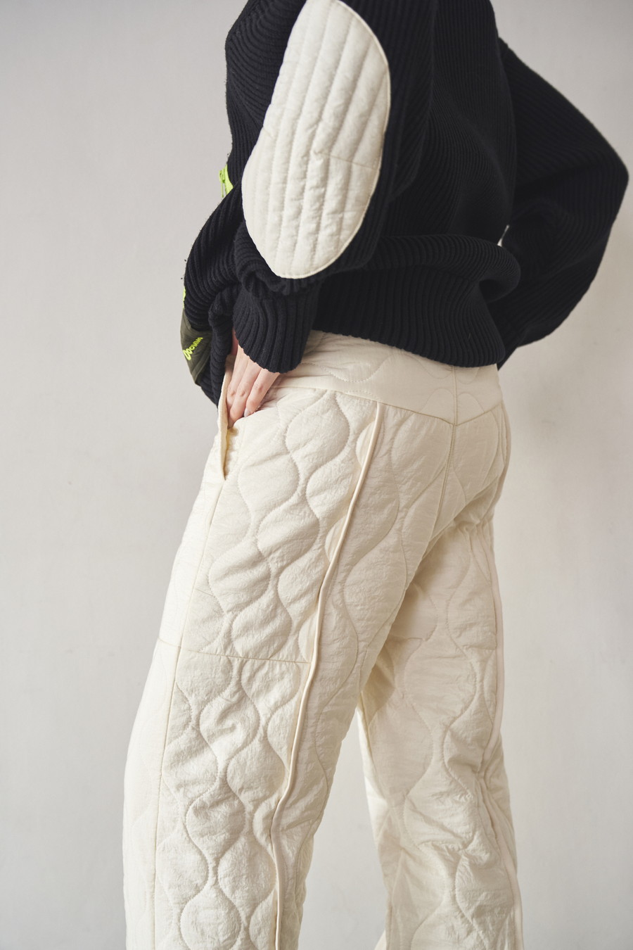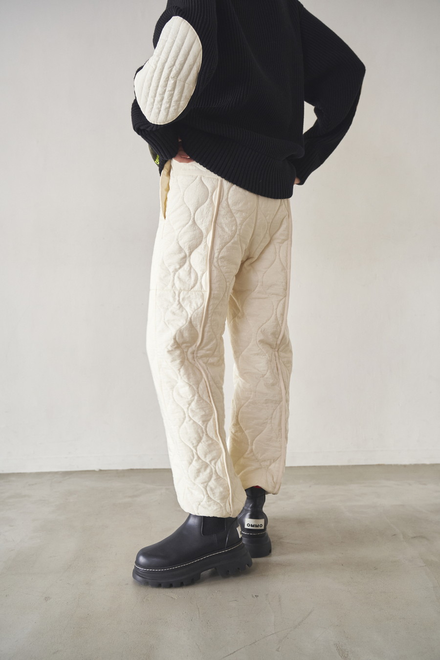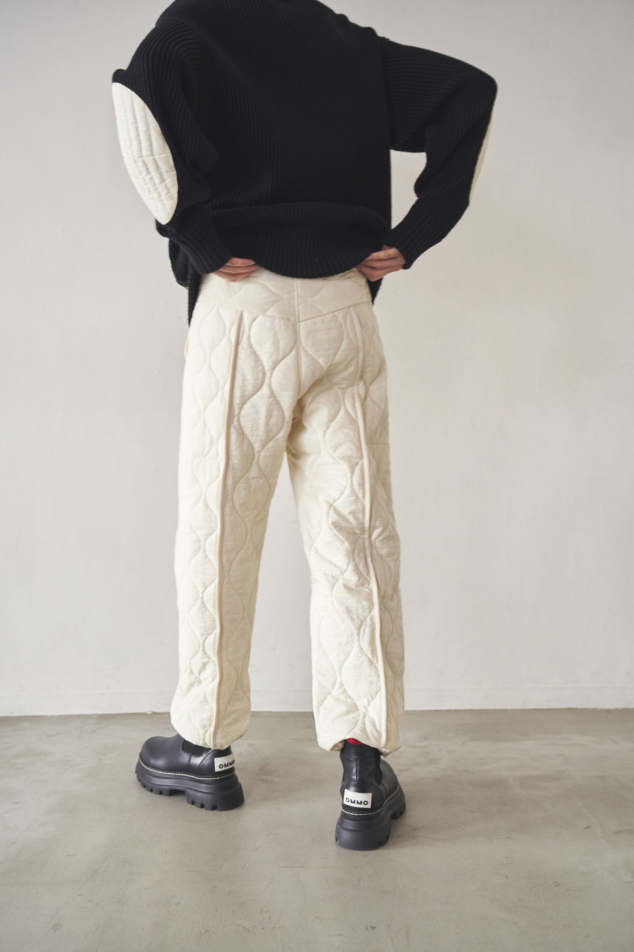 異なるサイズのキルティングを組み合わせた、シンプルながら立体感のある中綿入りキルティングパンツ。太すぎず細すぎない、すっきりとしたシルエットで、どんなトップスともバランスよく決まります。