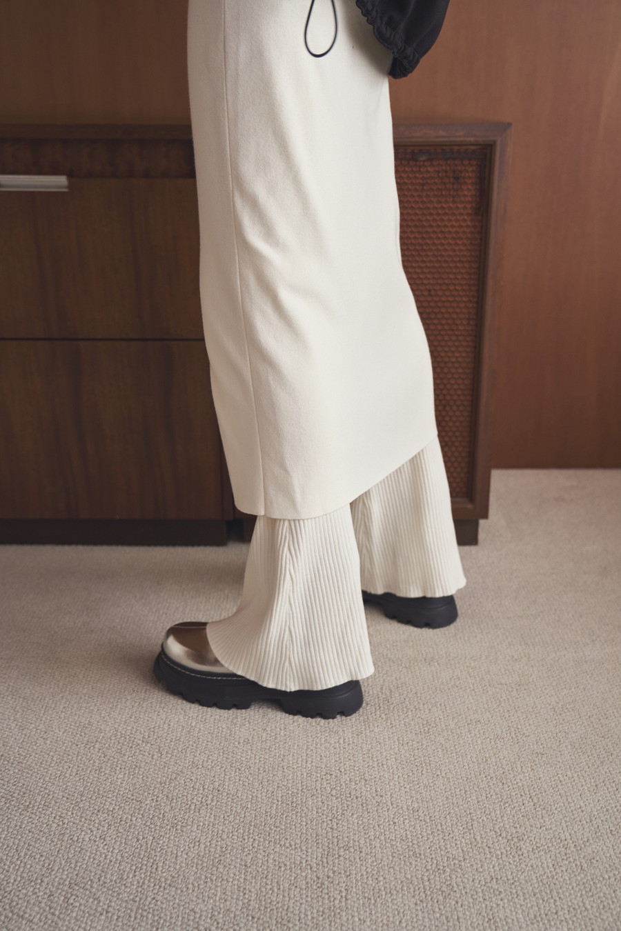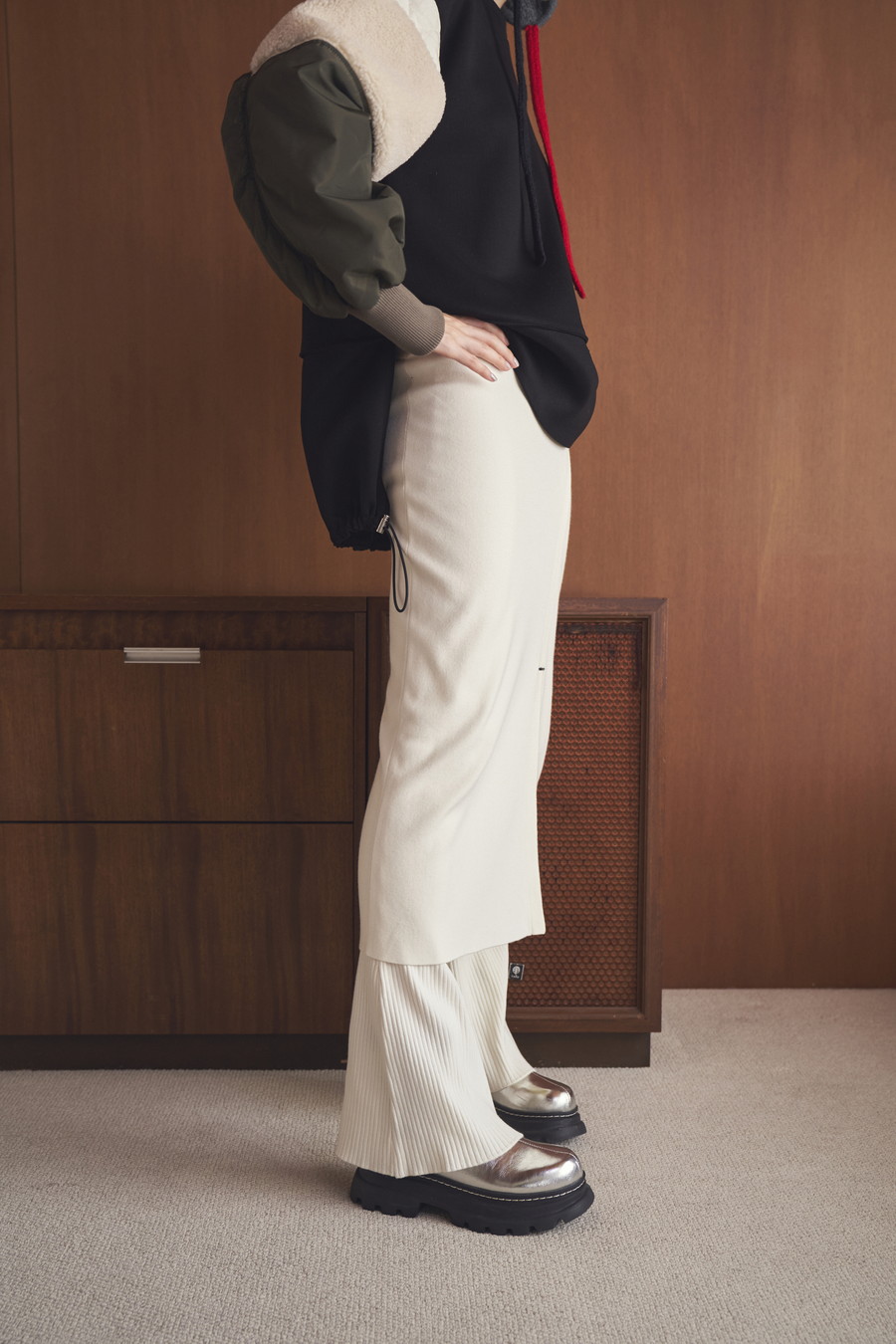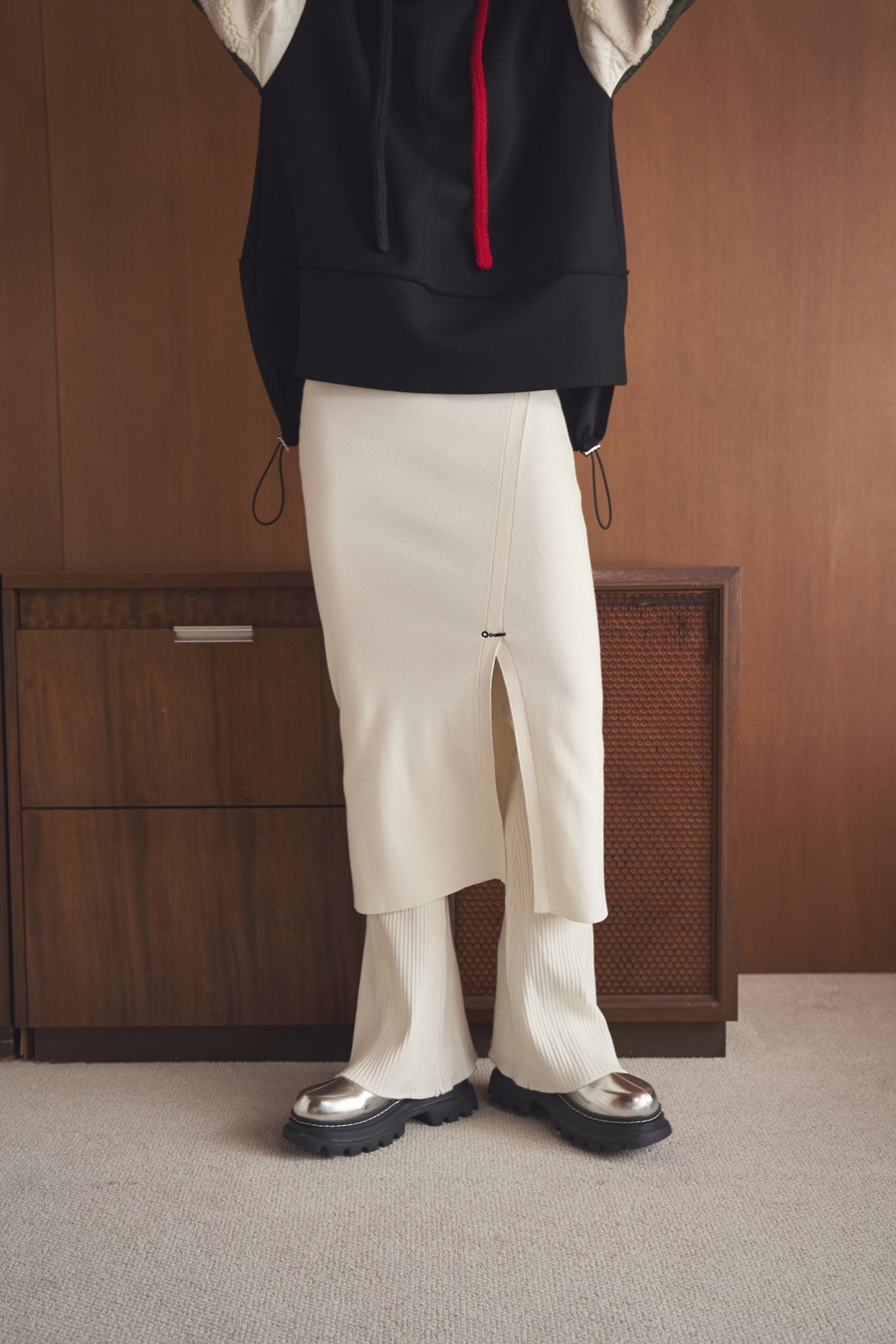 ひざ下丈のスカート部分が気になる太もも周りをしっかりカバーし、スリットから覗くフレアーシルエットのパンツが脚のラインをすっきりと見せてくれます。
