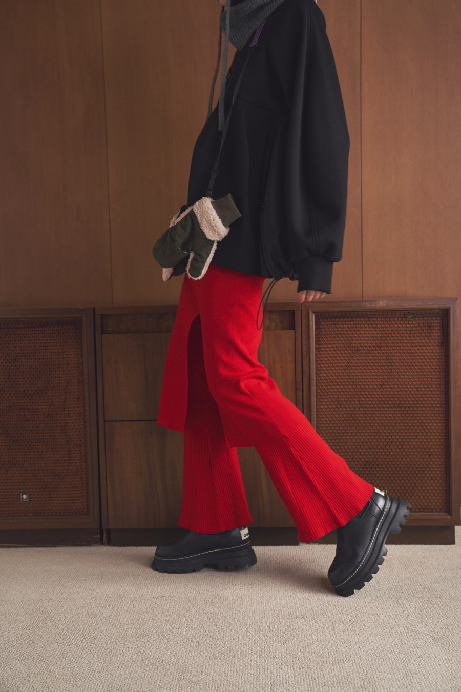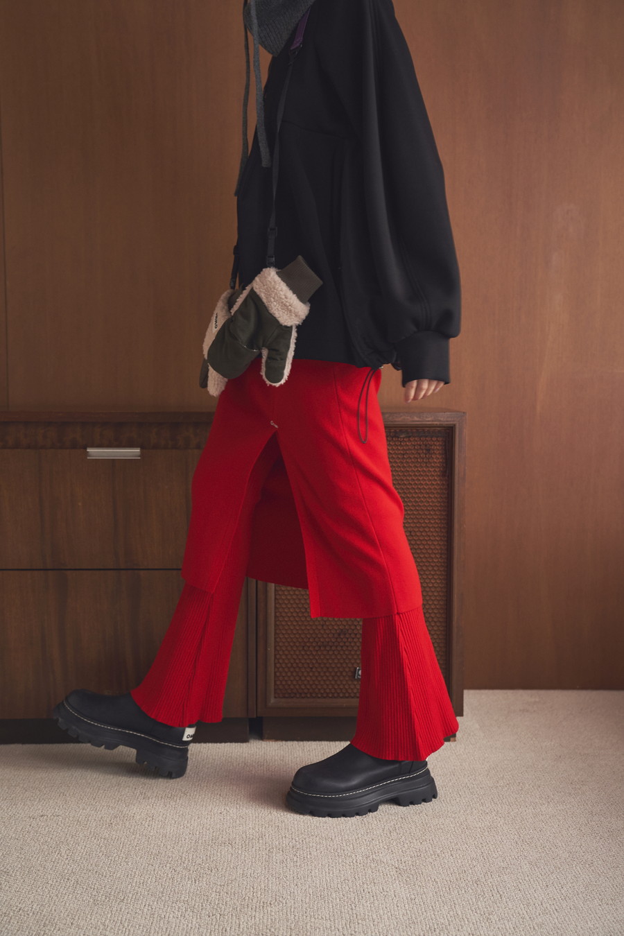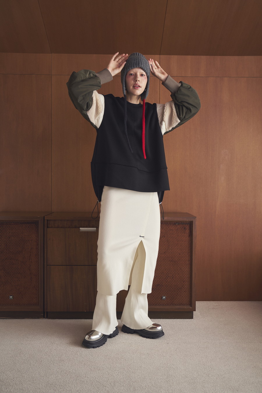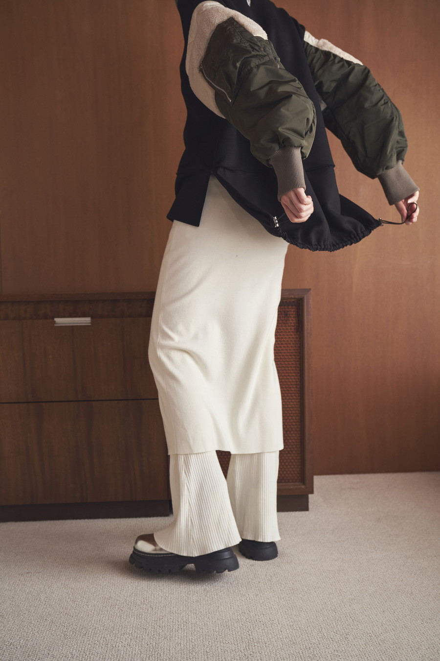 ひざ下丈のスカート部分が気になる太もも周りをしっかりカバーし、スリットから覗くフレアーシルエットのパンツが脚のラインをすっきりと見せてくれます。
