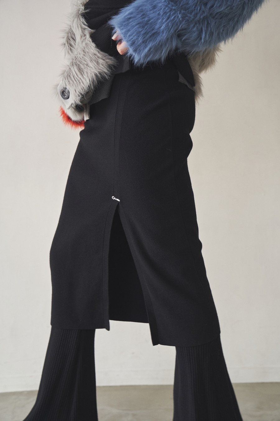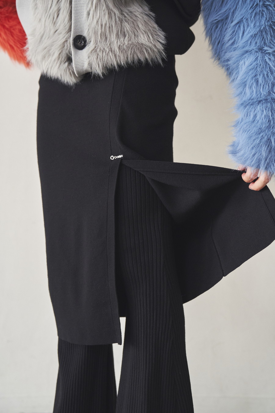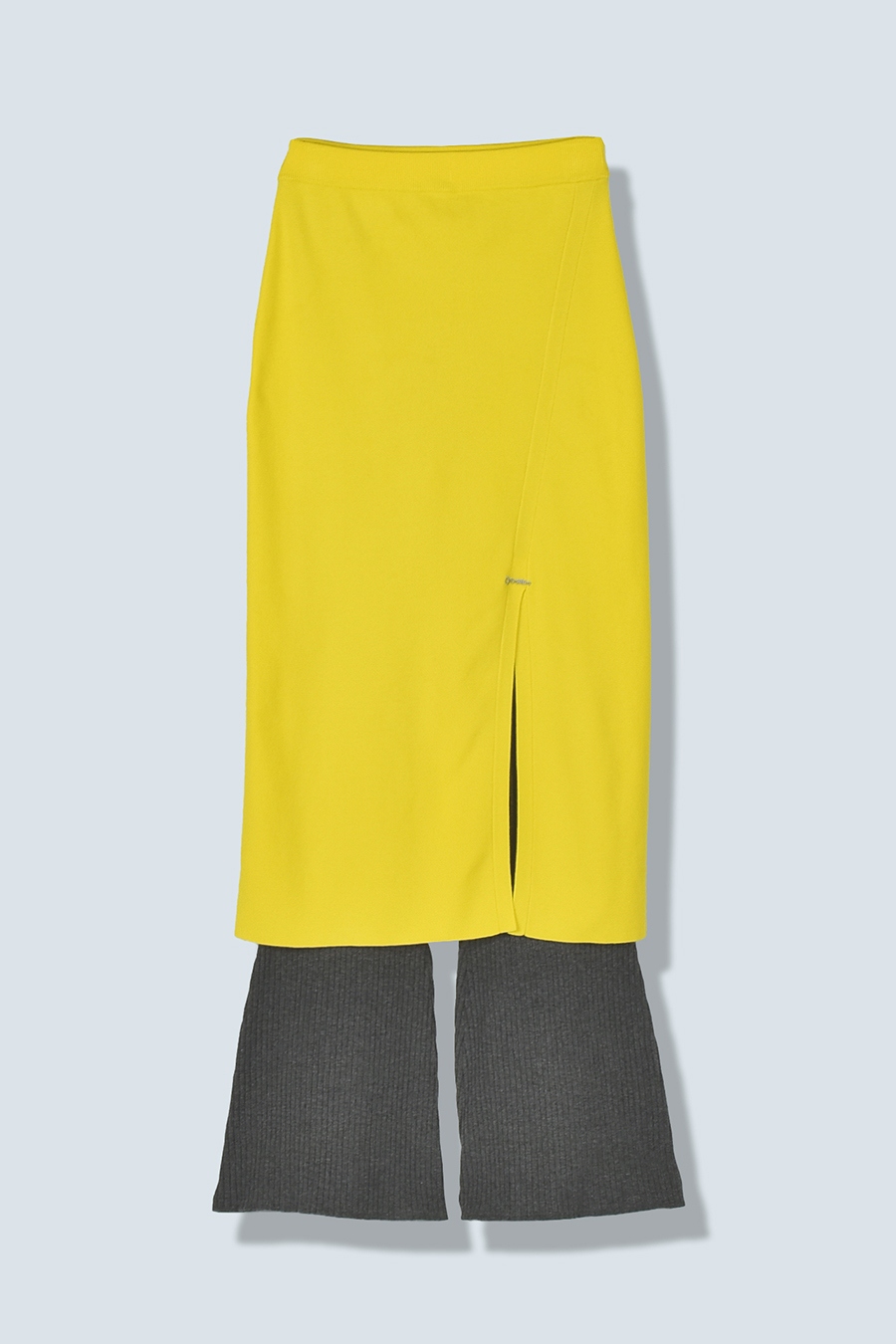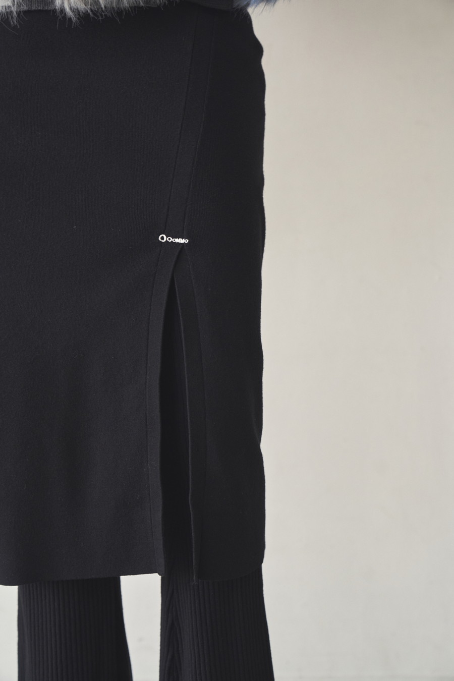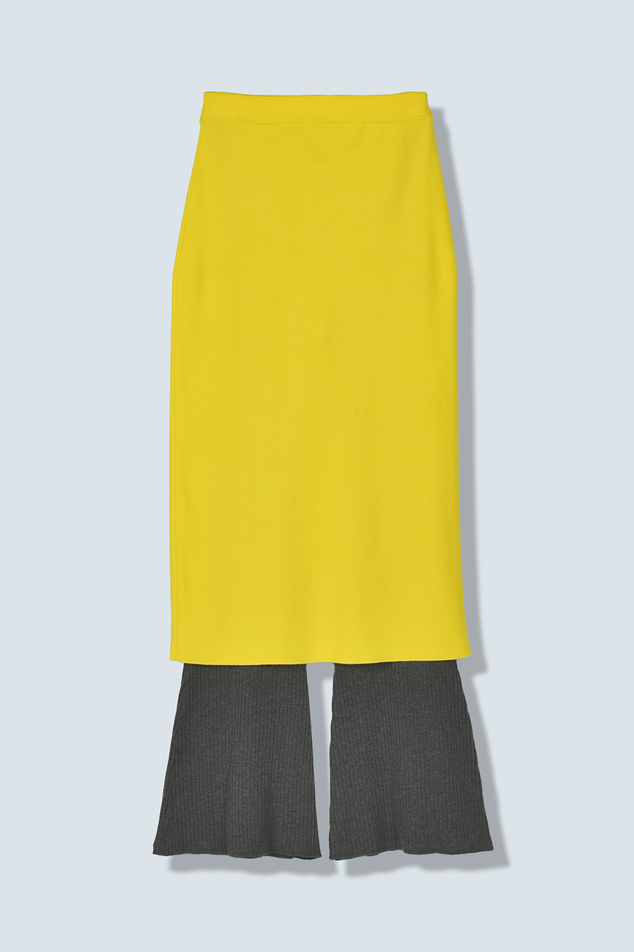 ニット素材を使用したスカートとフレアーパンツのレイヤードボトム。肌馴染みの良いレーヨン混の糸を使用しており、滑らかな肌触りとストレスフリーな着心地が魅力です。