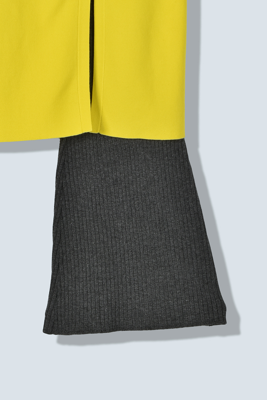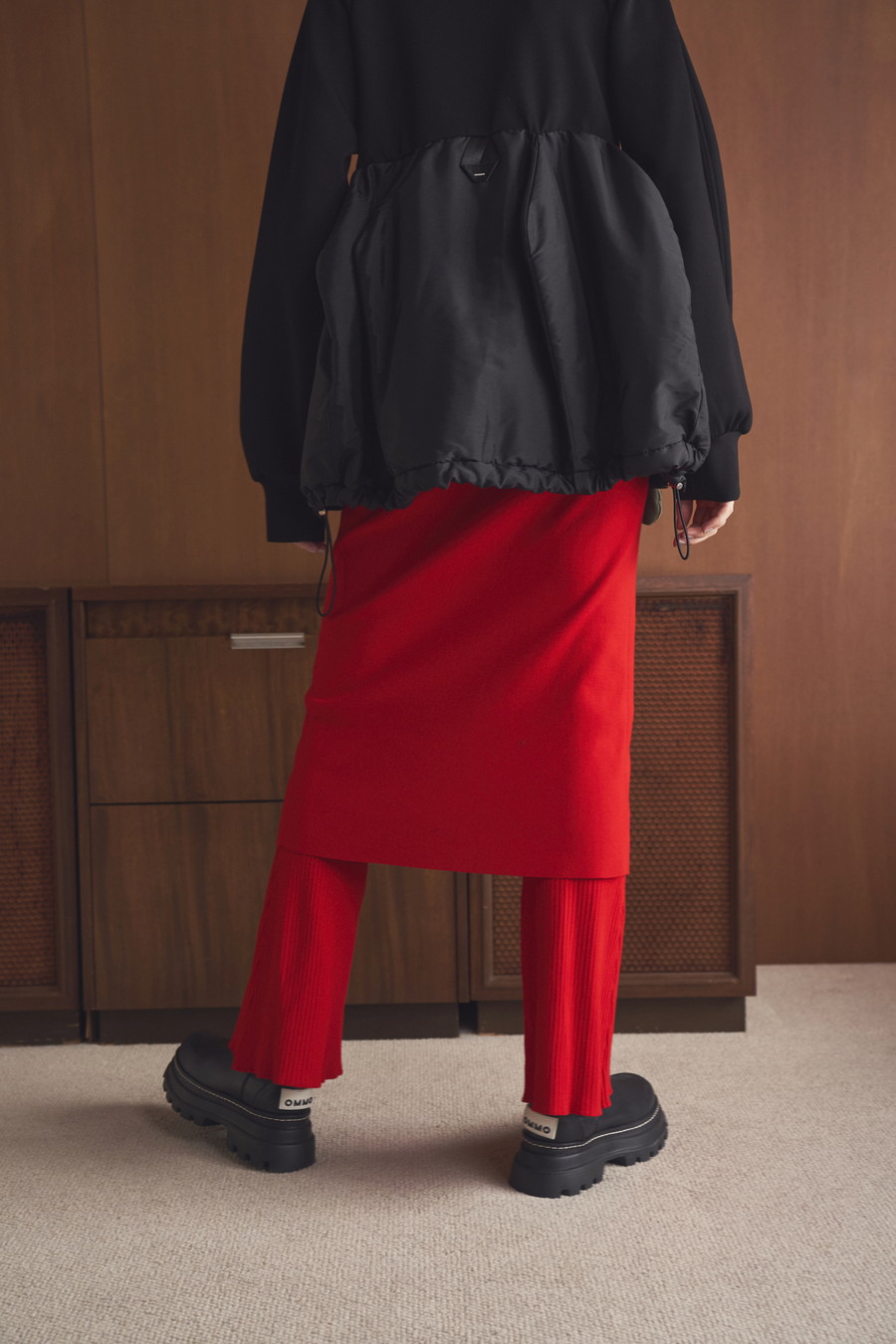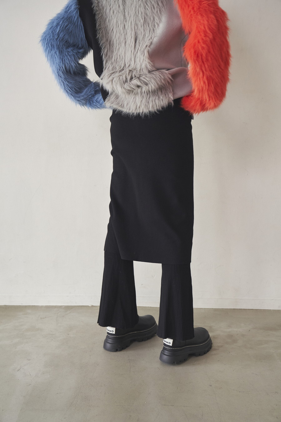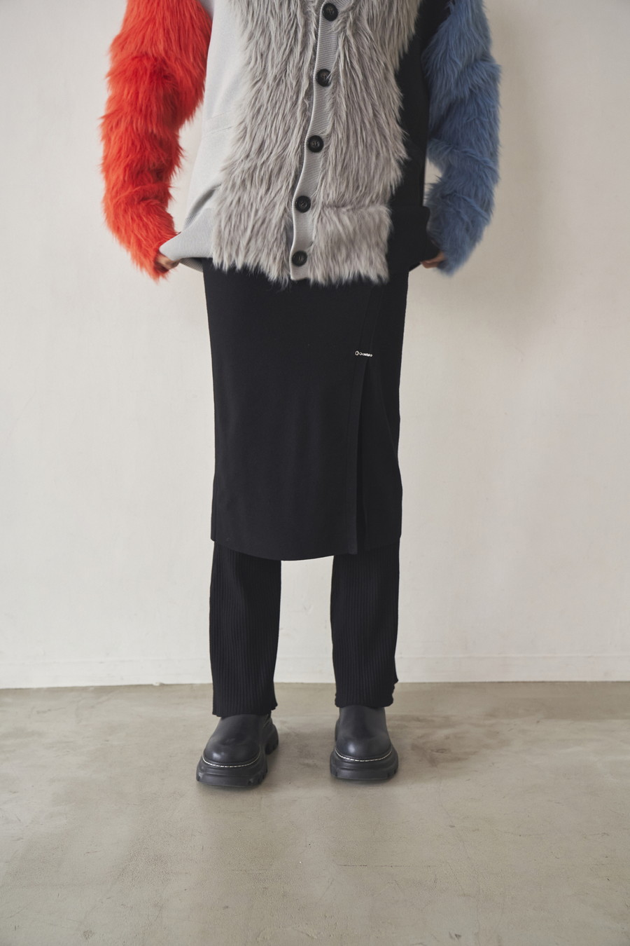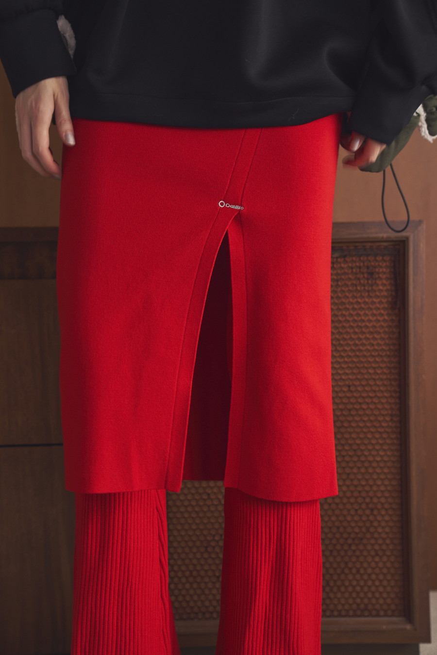 ニット素材を使用したスカートとフレアーパンツのレイヤードボトム。肌馴染みの良いレーヨン混の糸を使用しており、滑らかな肌触りとストレスフリーな着心地が魅力です。