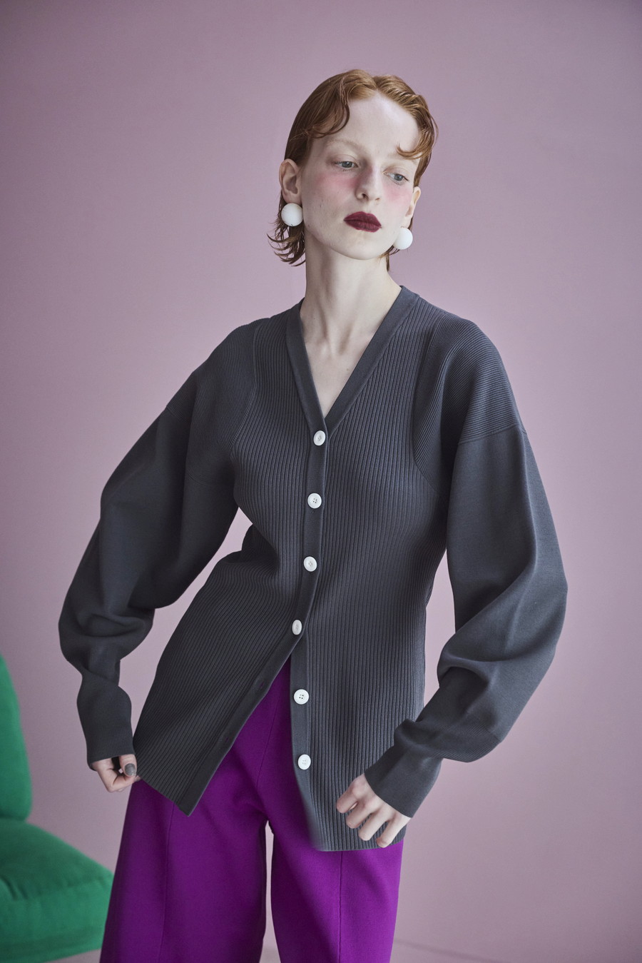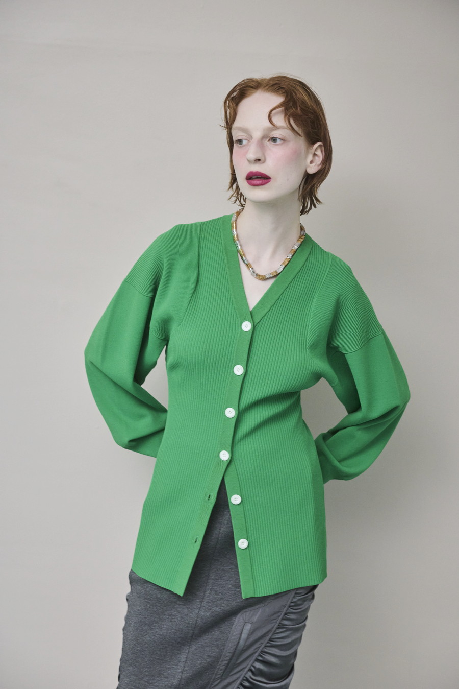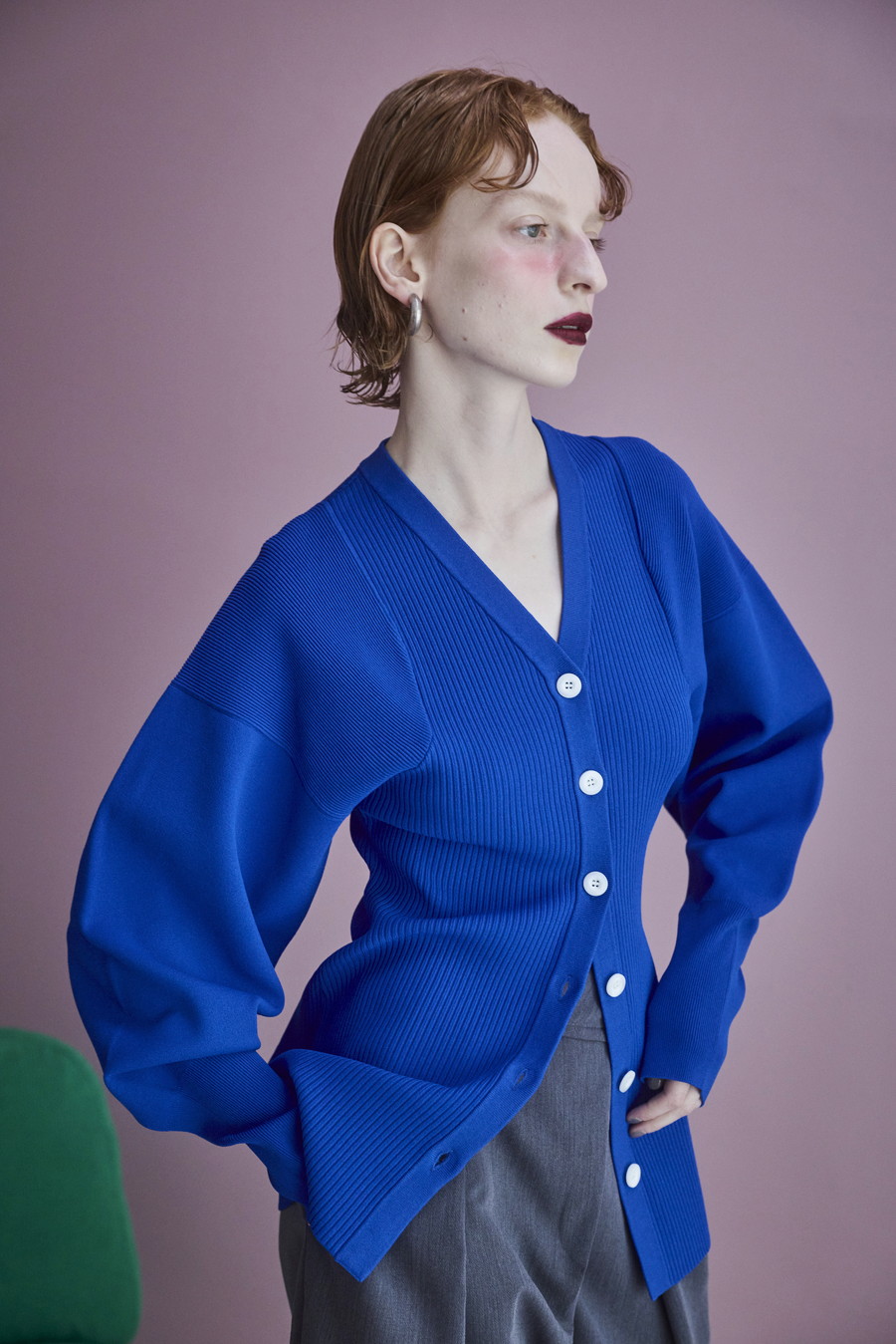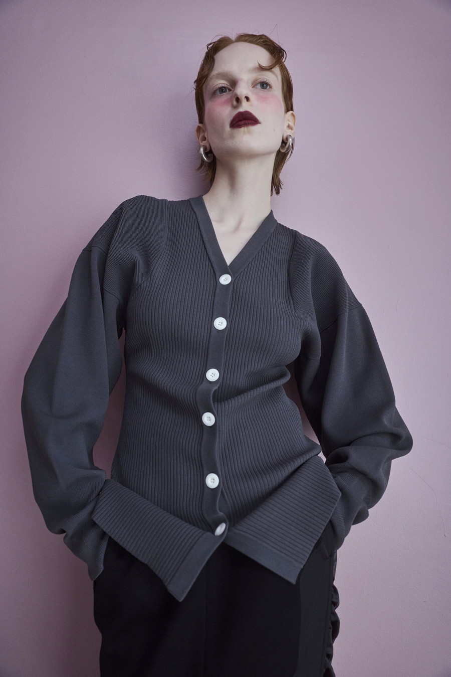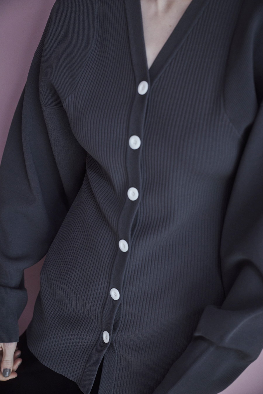 ボリュームのある袖が印象的なニットカーディガン。Vネックデザインと身頃のリブ編みが、すっきりとしたシルエットを叶えます。