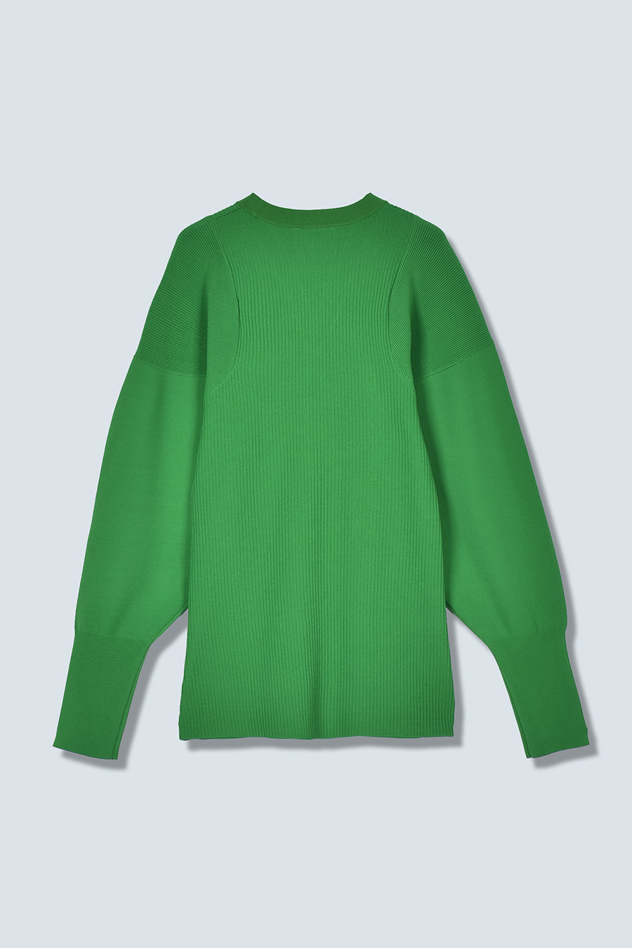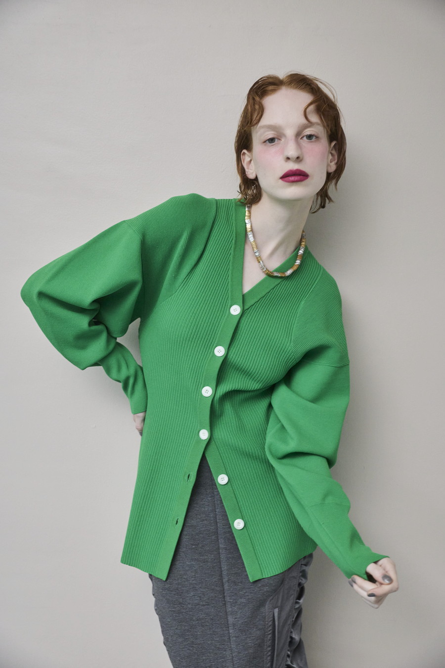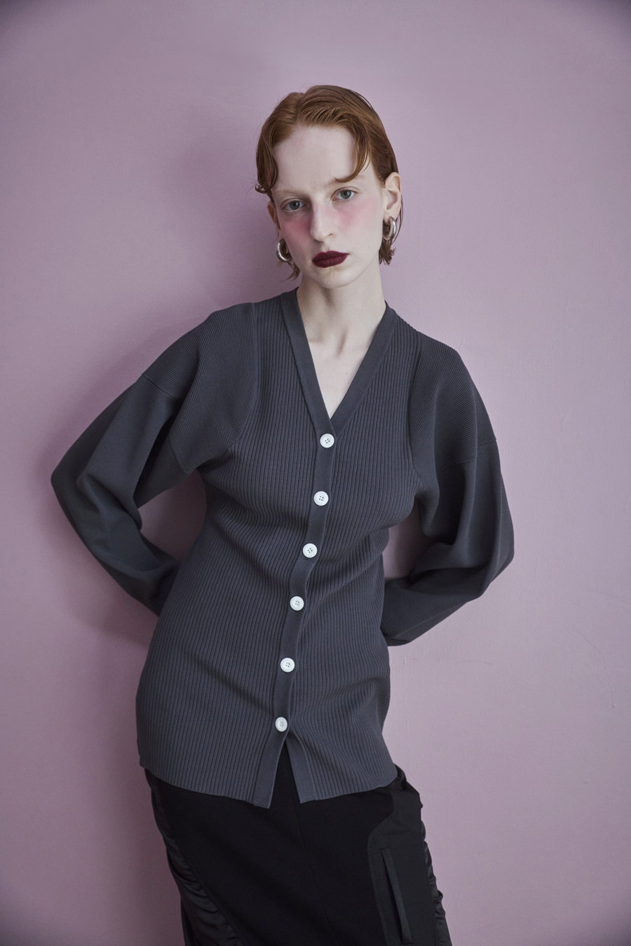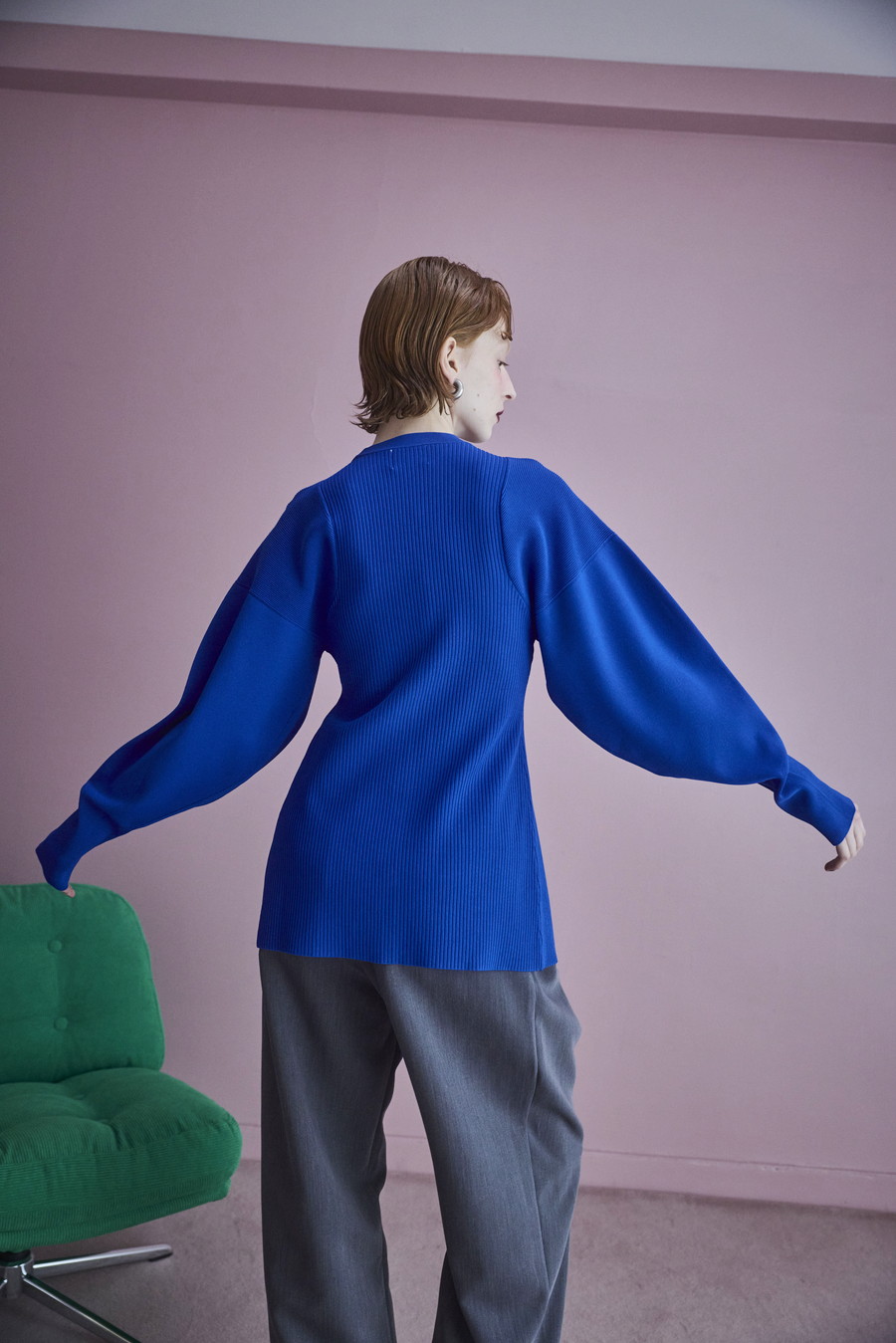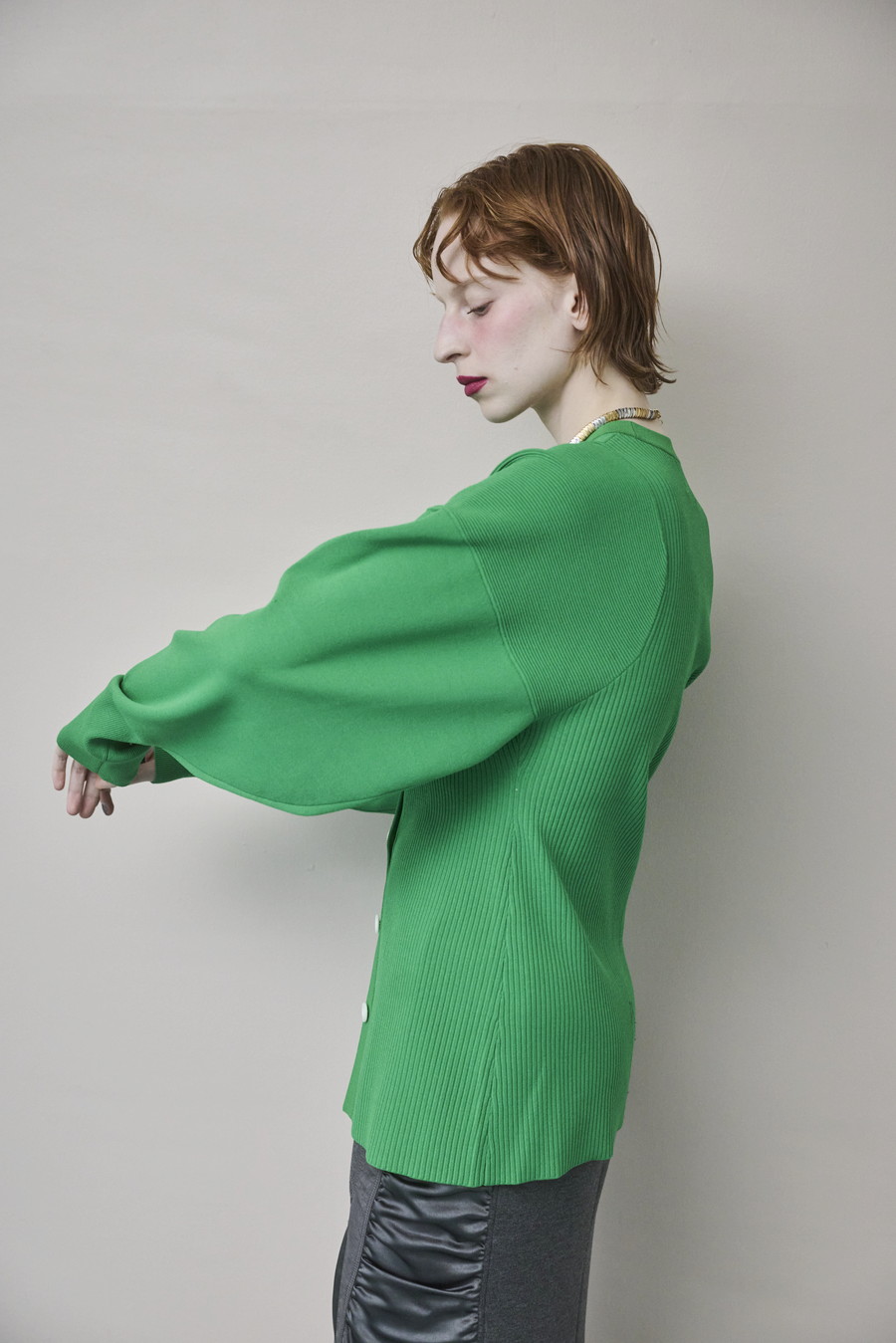 ボリュームのある袖が印象的なニットカーディガン。Vネックデザインと身頃のリブ編みが、すっきりとしたシルエットを叶えます。