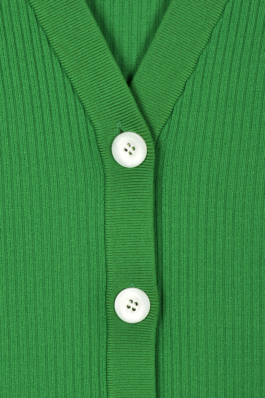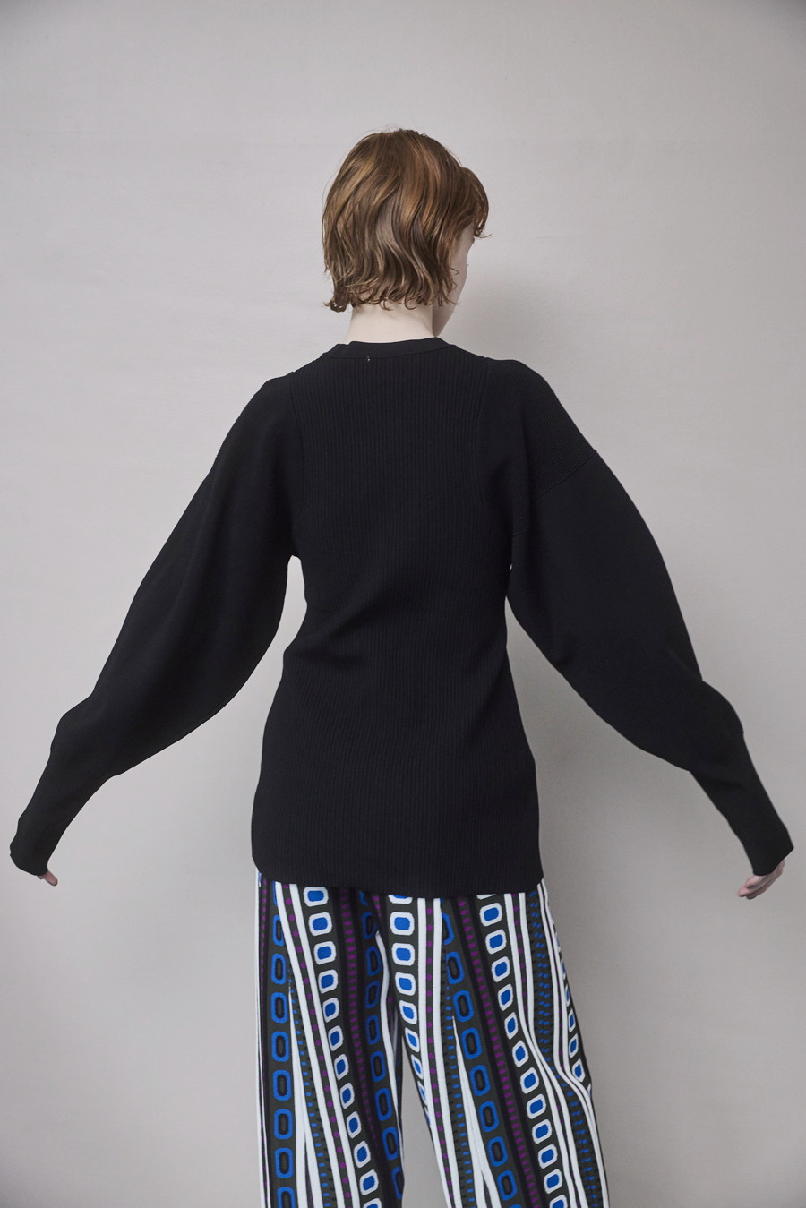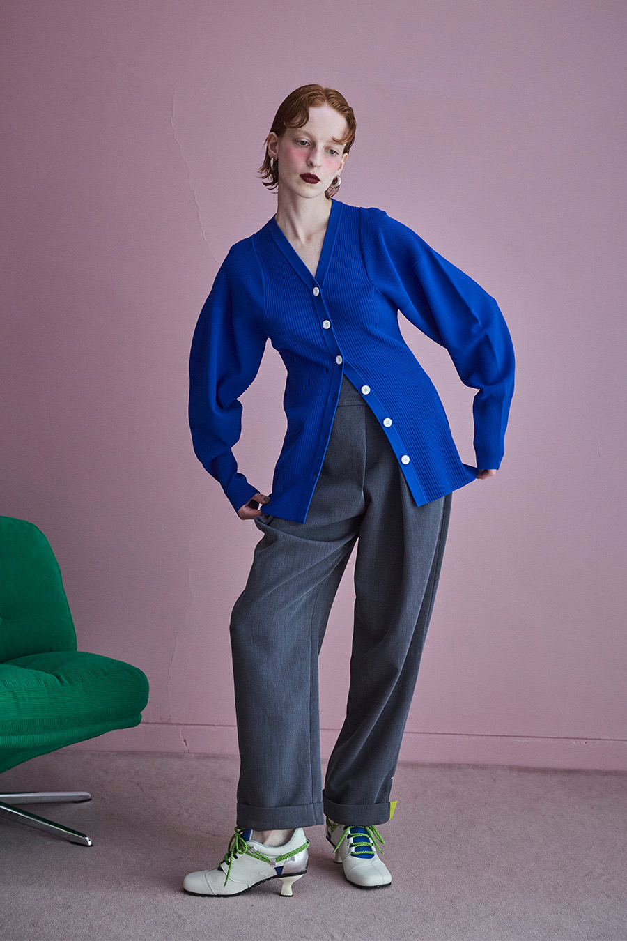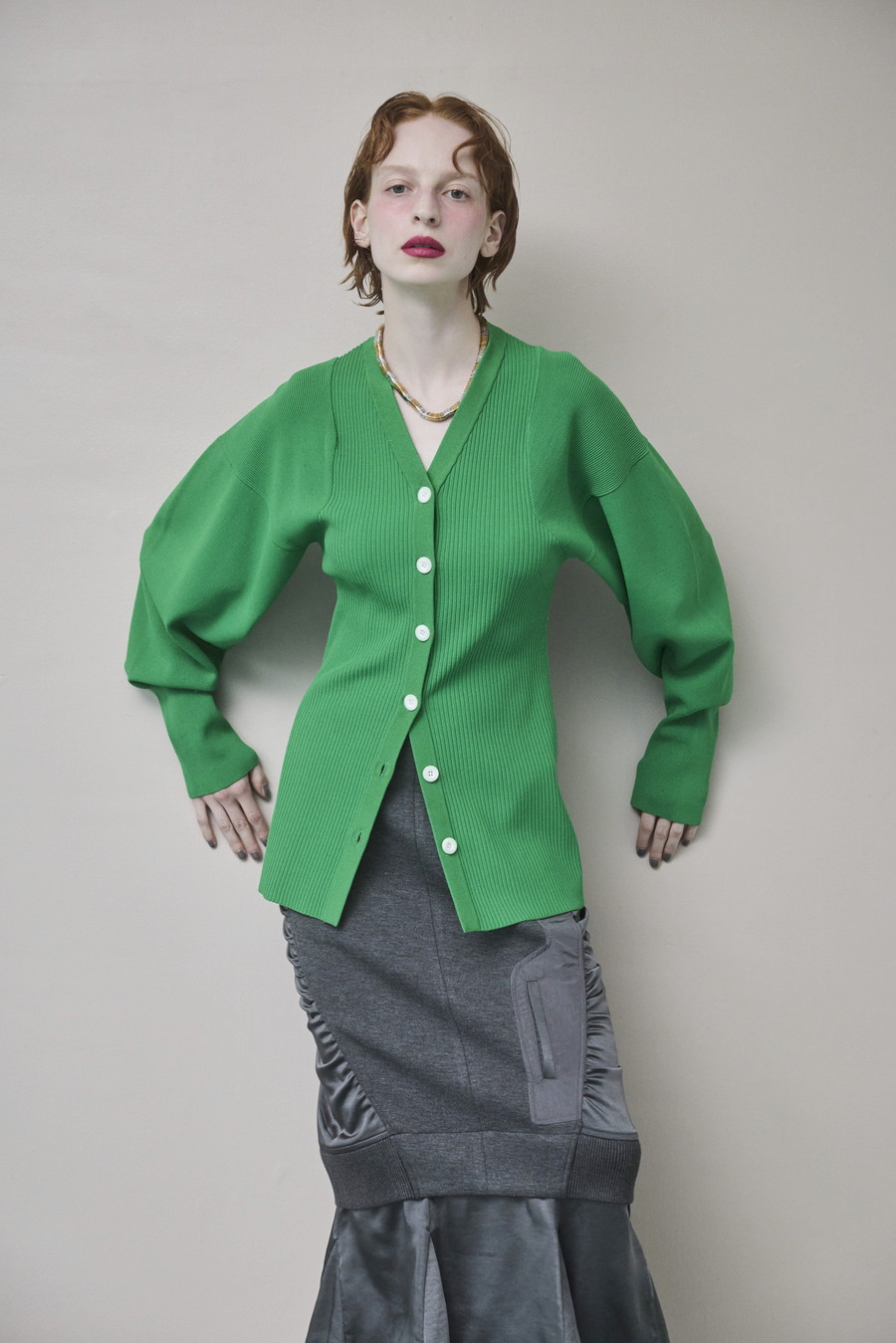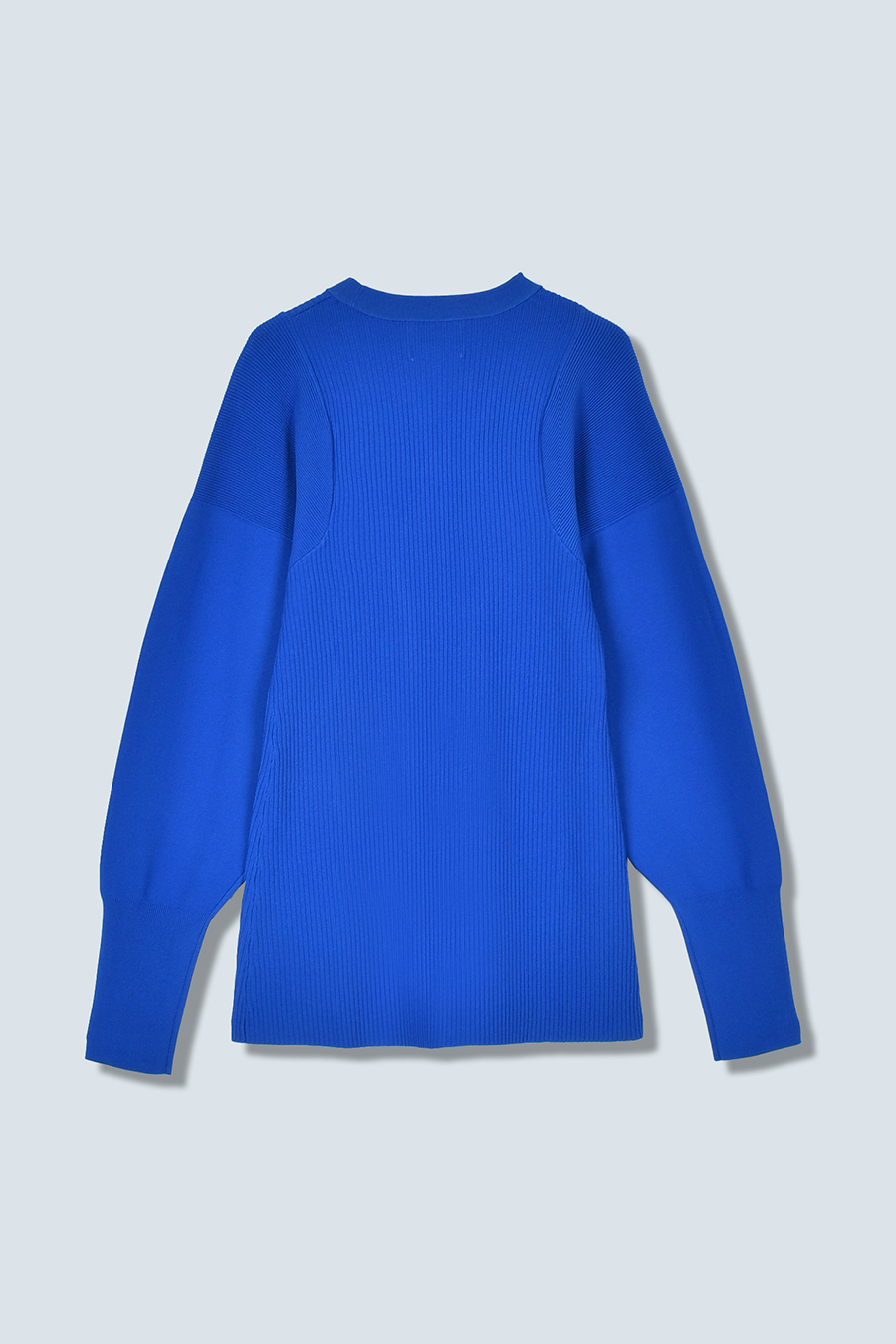 ボリュームのある袖が印象的なニットカーディガン。Vネックデザインと身頃のリブ編みが、すっきりとしたシルエットを叶えます。
