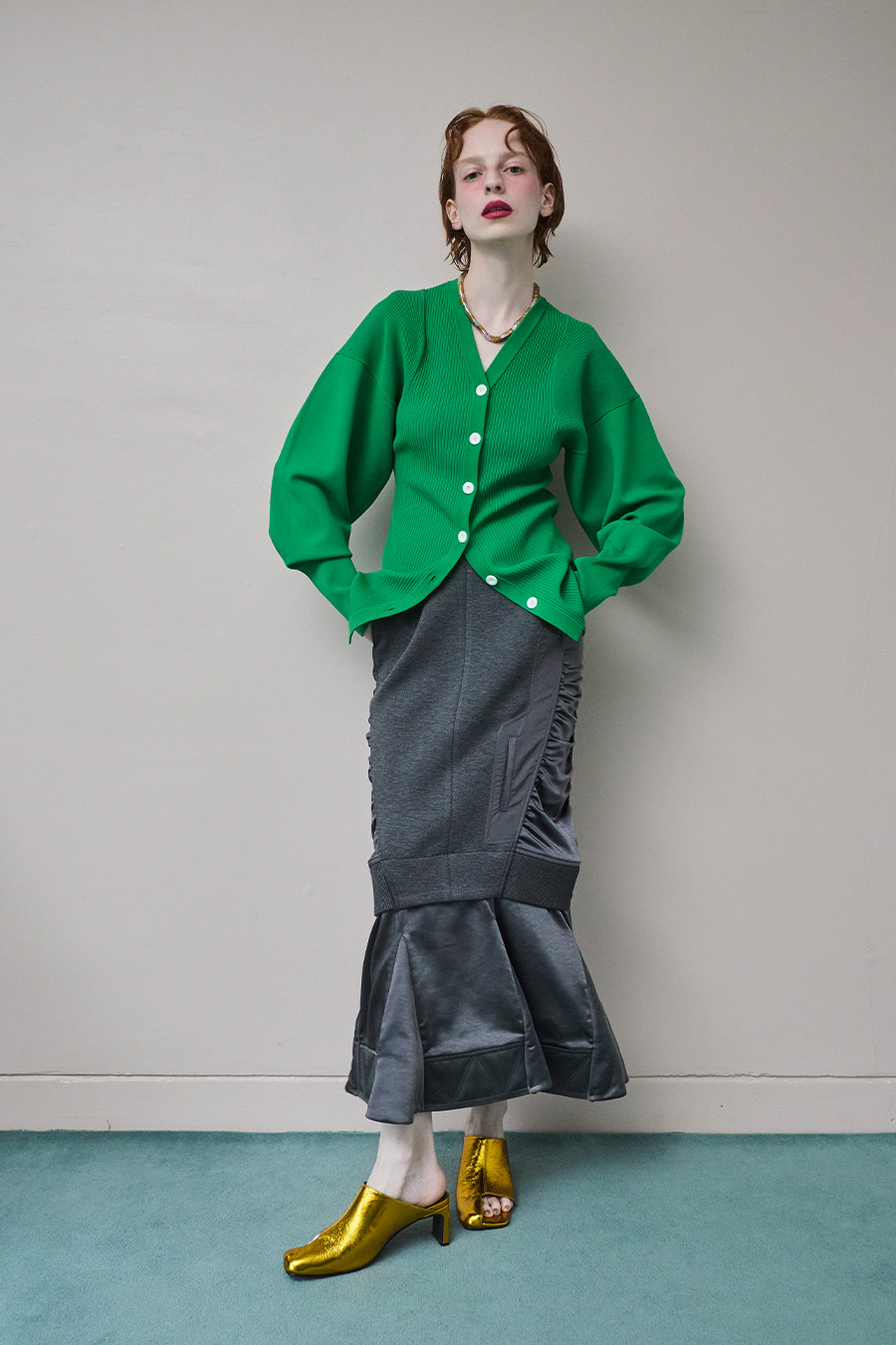丈感はパンツにもスカートにも合わせやすく、幅広いスタイリングで活躍します。