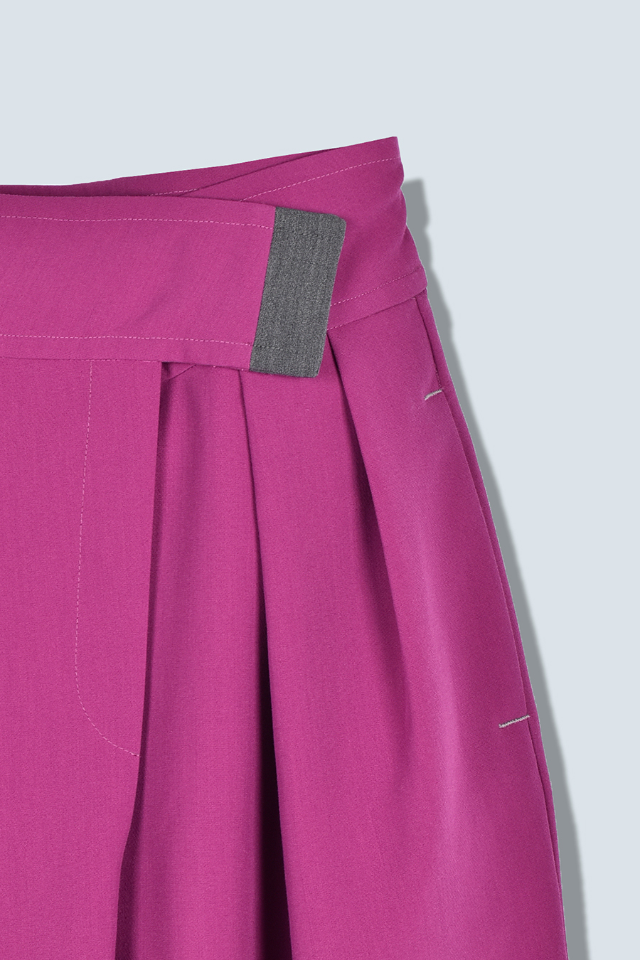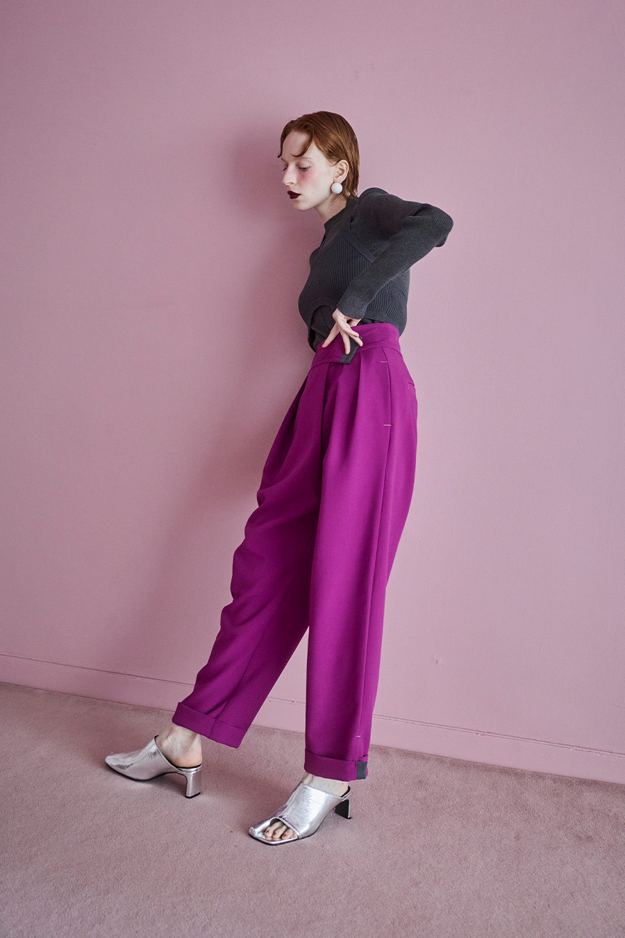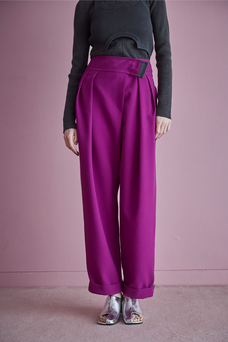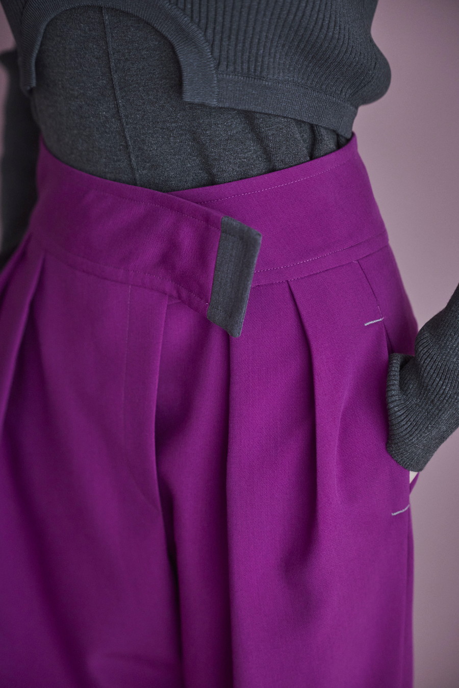 ウエストの太めベルトとラップデザインが目を引くテーパードパンツ。腰まわりに入れたタックが体型をカバーし、すっきりとしたラインに仕上げています。