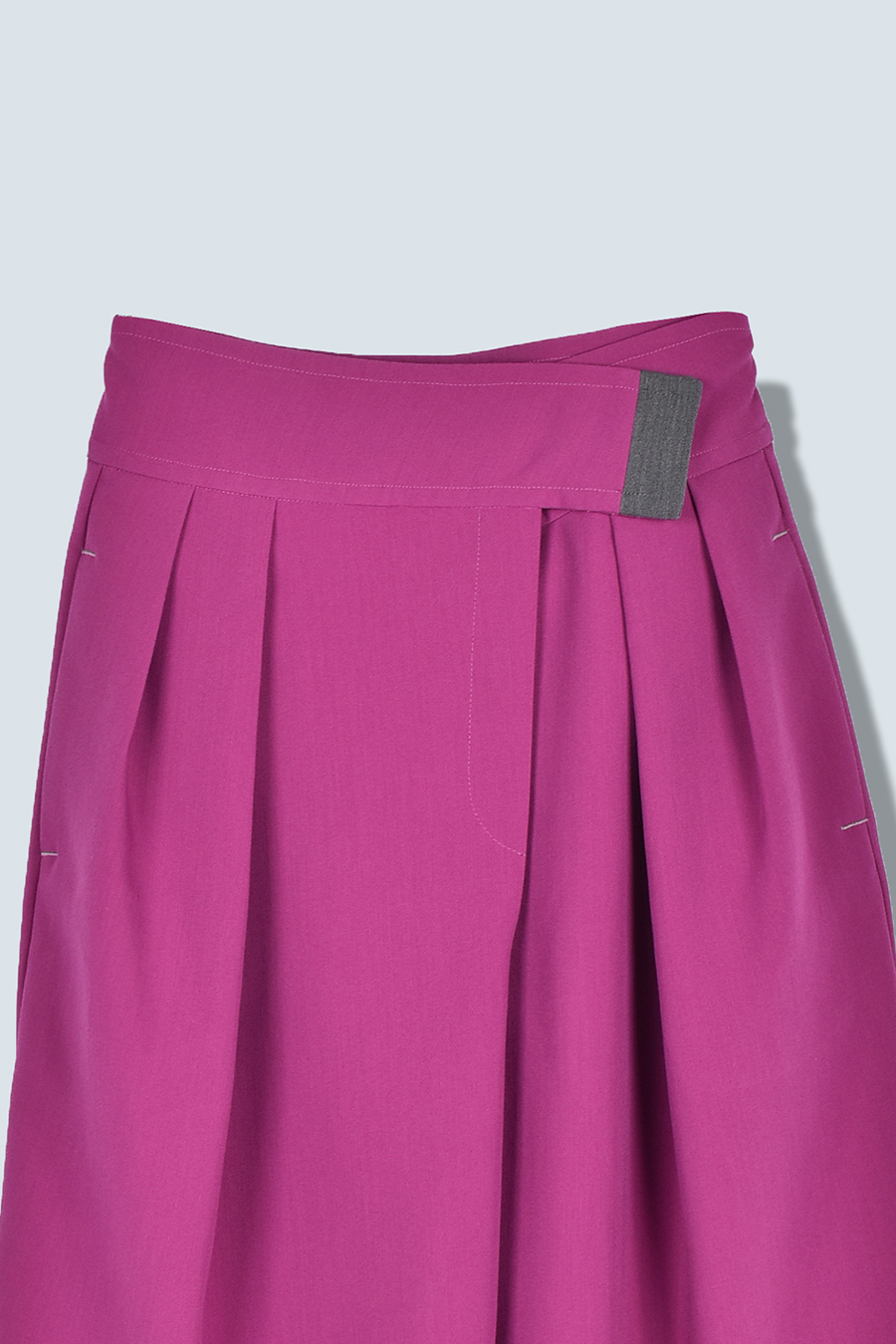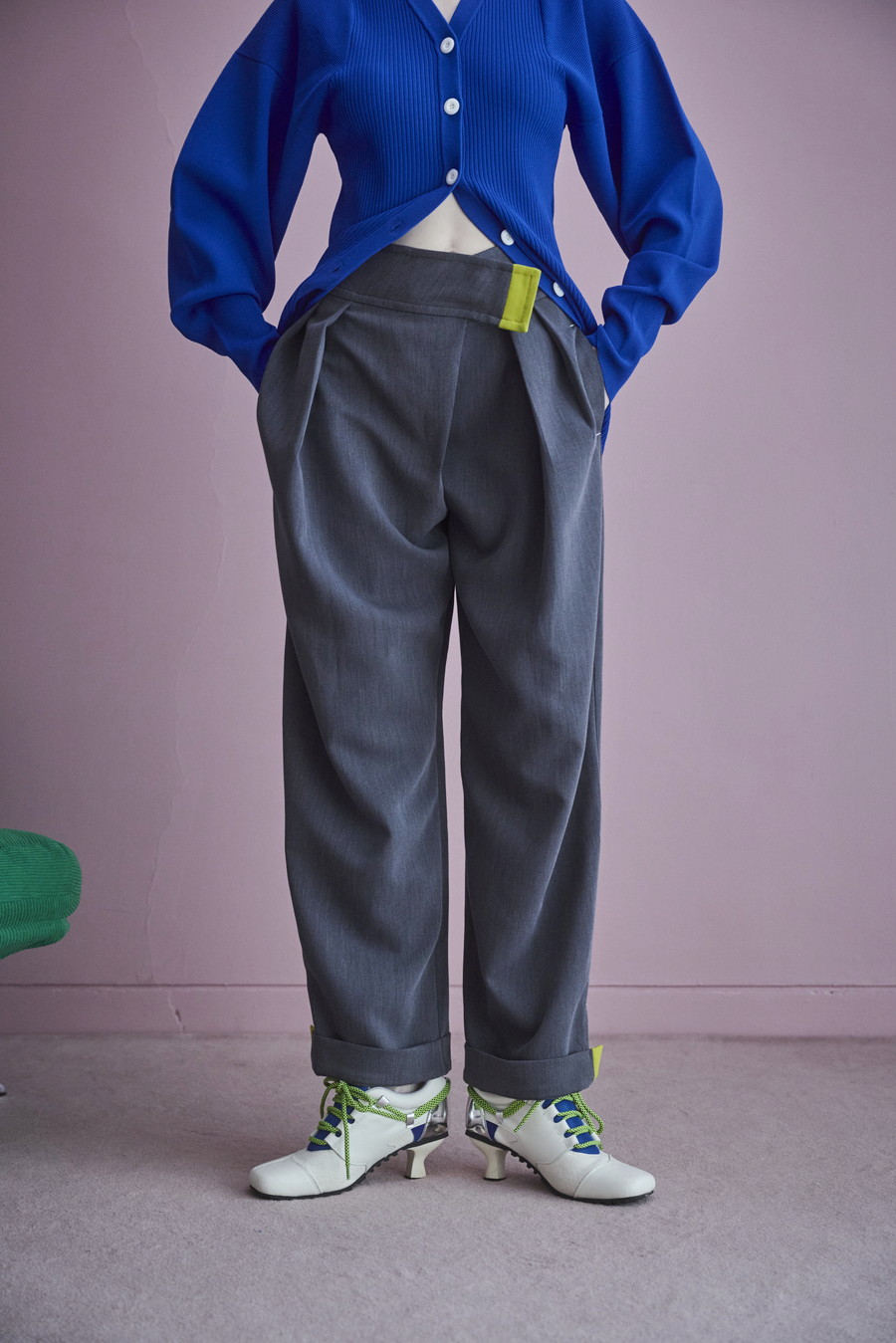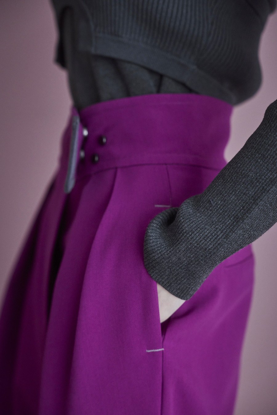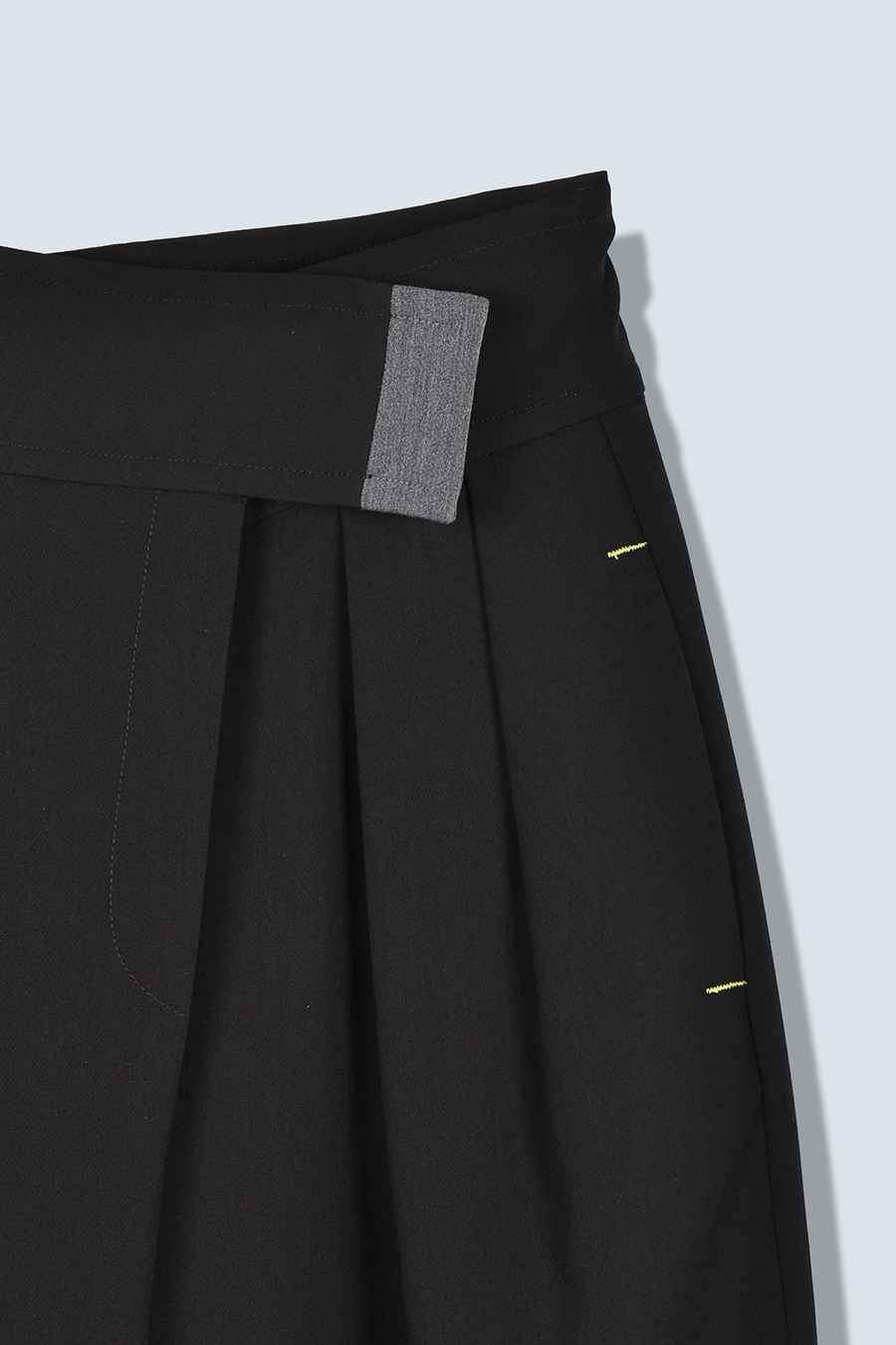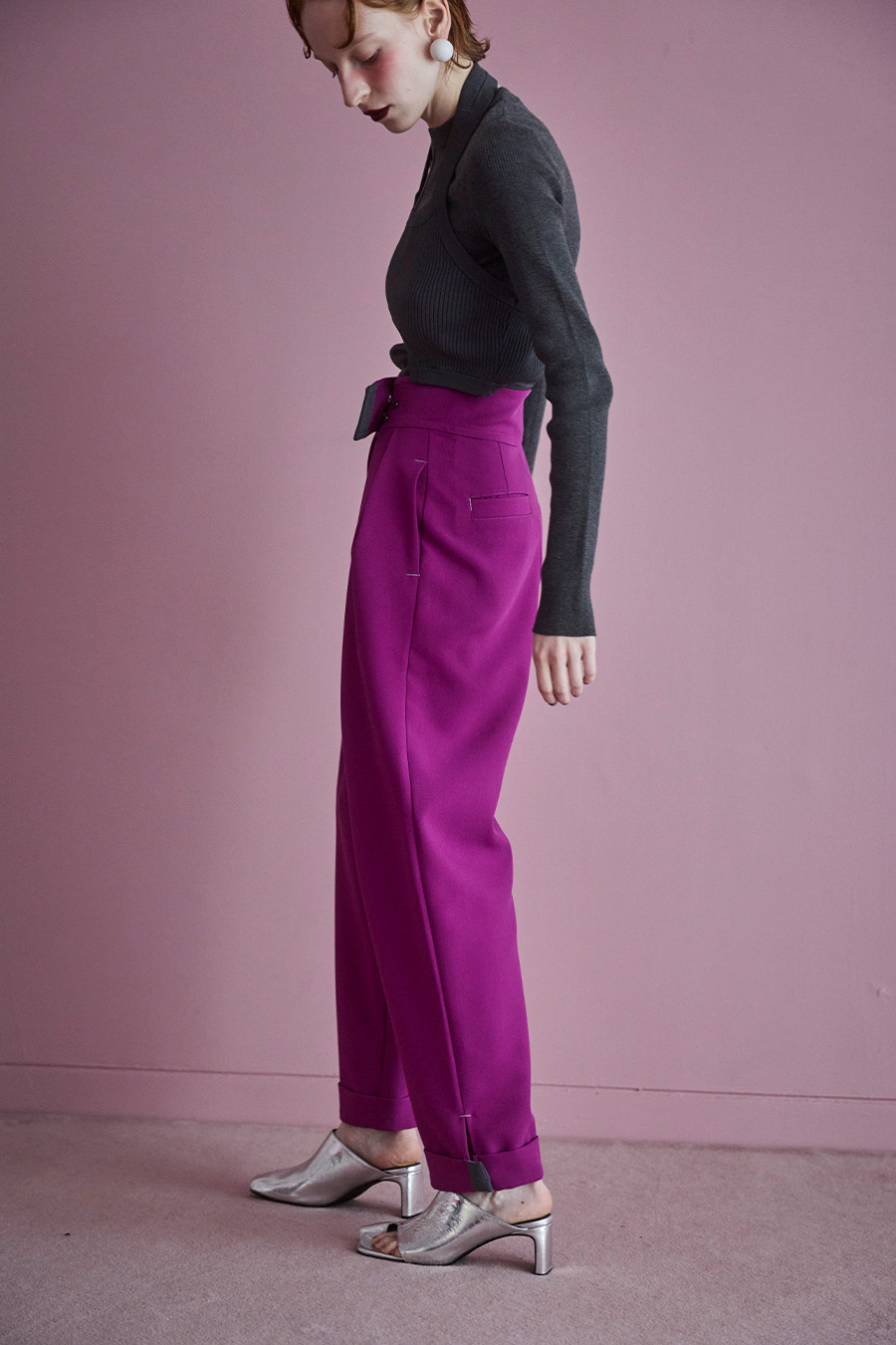 ウエストの太めベルトとラップデザインが目を引くテーパードパンツ。腰まわりに入れたタックが体型をカバーし、すっきりとしたラインに仕上げています。