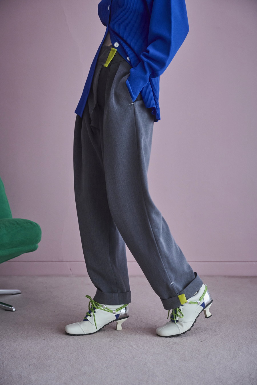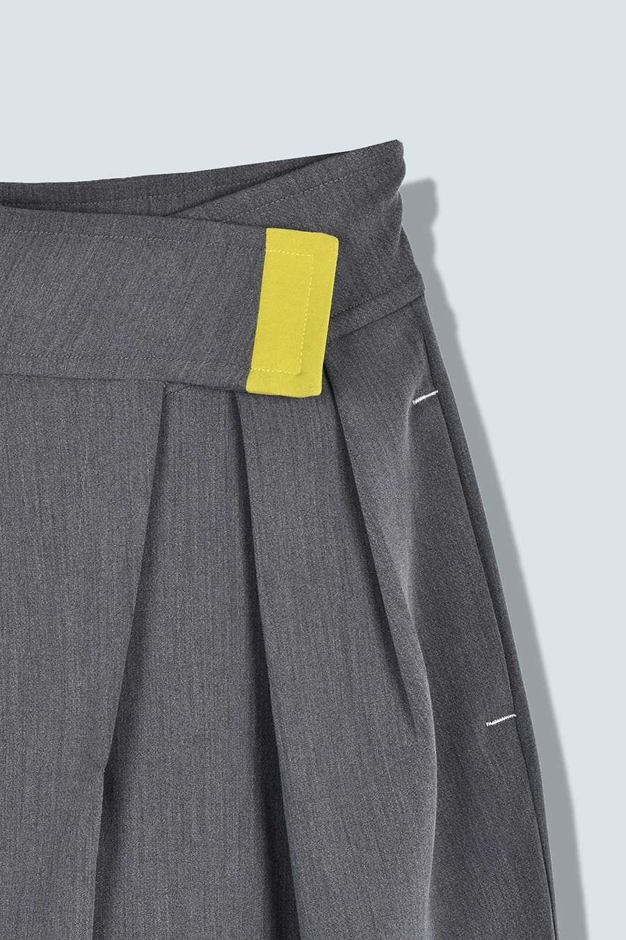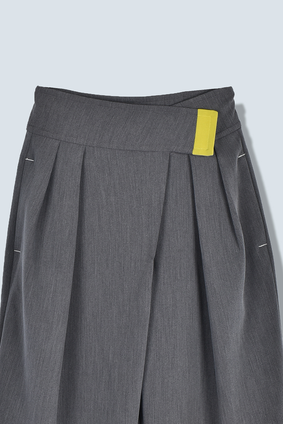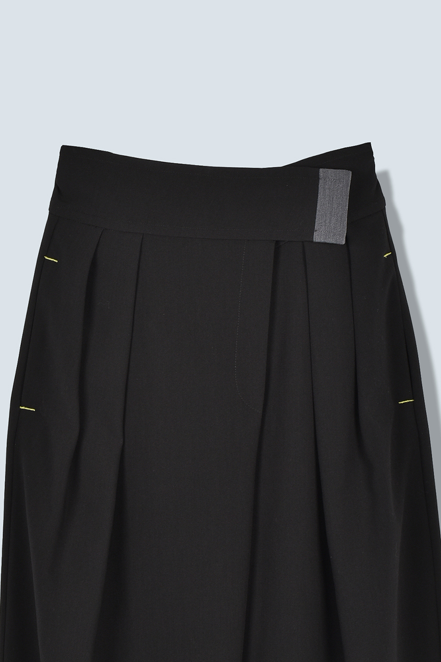 ウエストの太めベルトとラップデザインが目を引くテーパードパンツ。腰まわりに入れたタックが体型をカバーし、すっきりとしたラインに仕上げています。