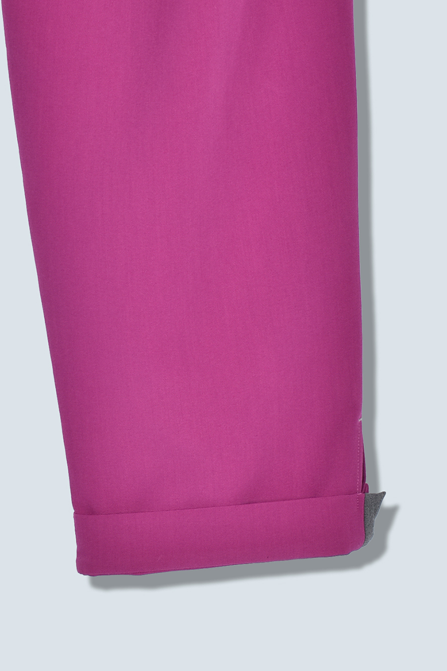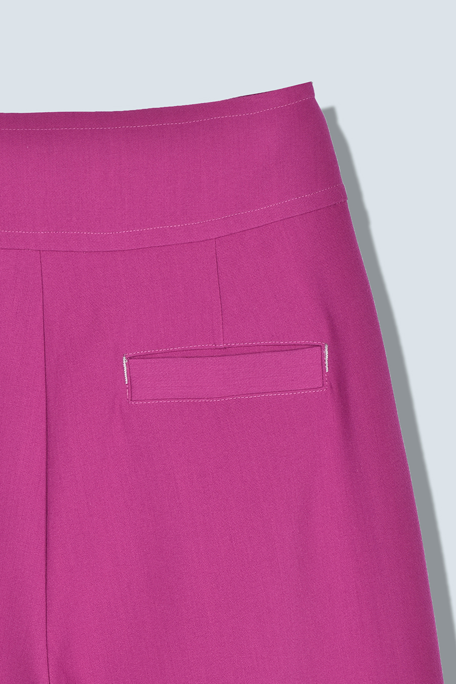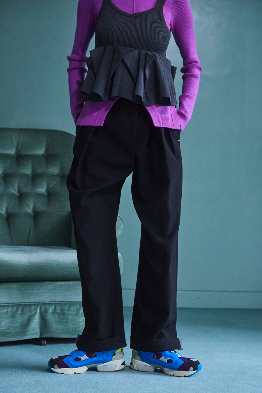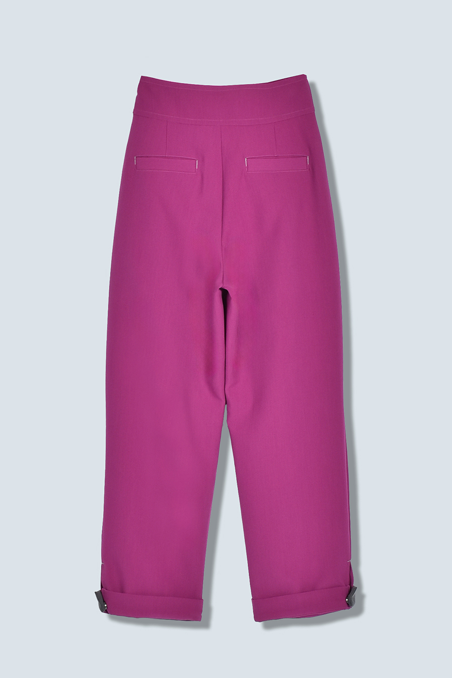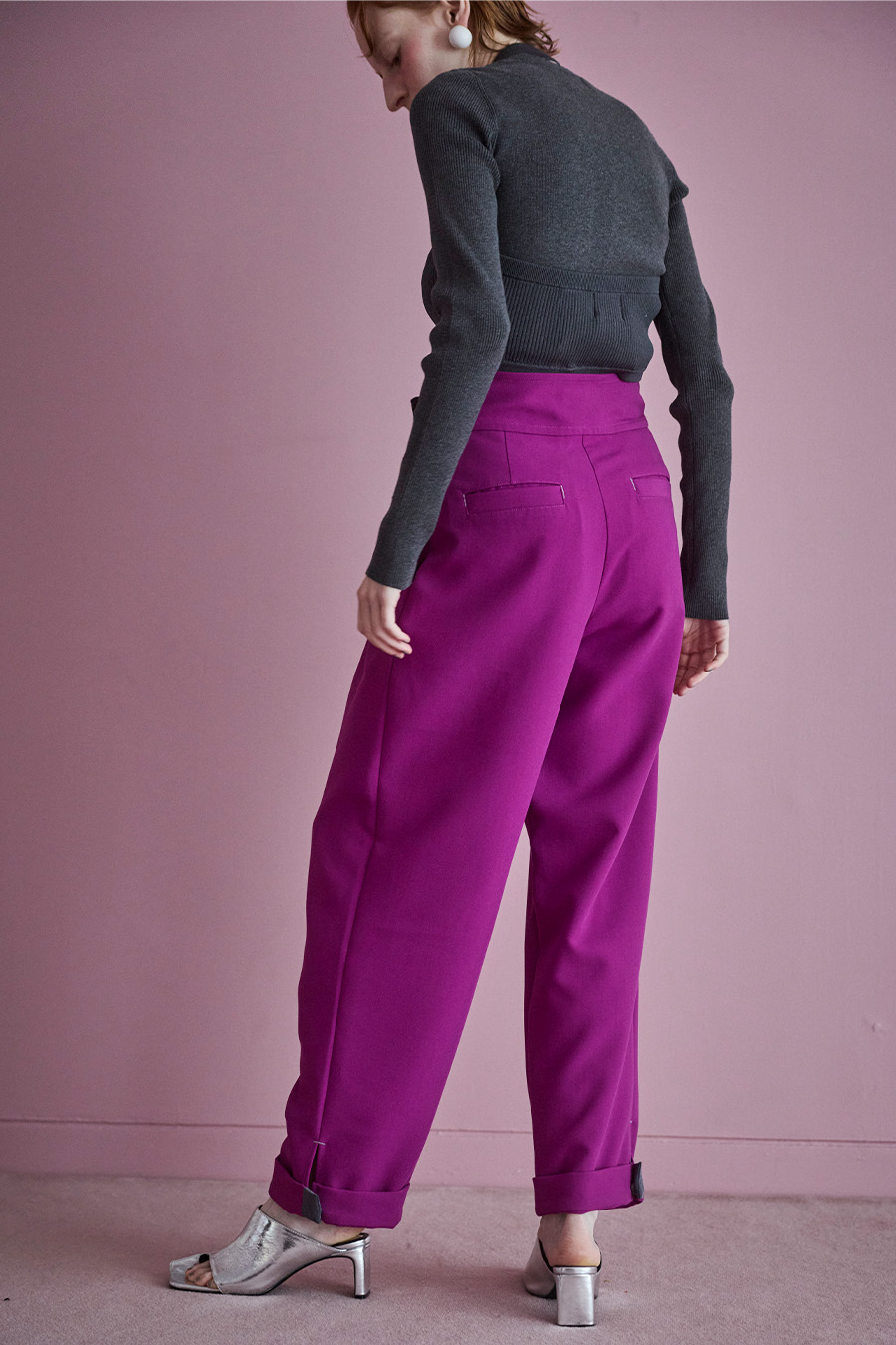 ウエストの太めベルトとラップデザインが目を引くテーパードパンツ。腰まわりに入れたタックが体型をカバーし、すっきりとしたラインに仕上げています。