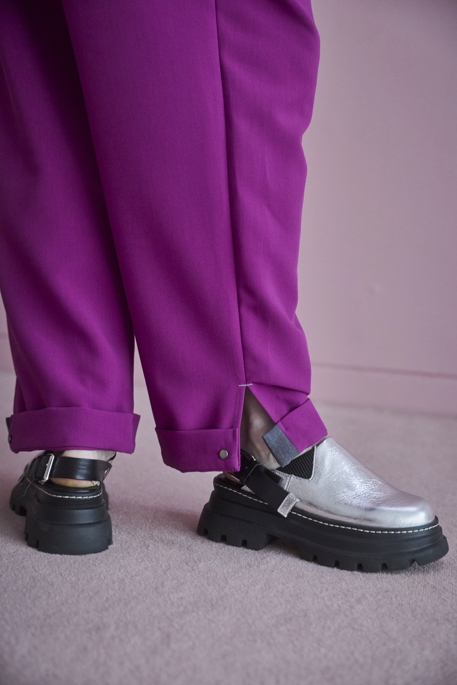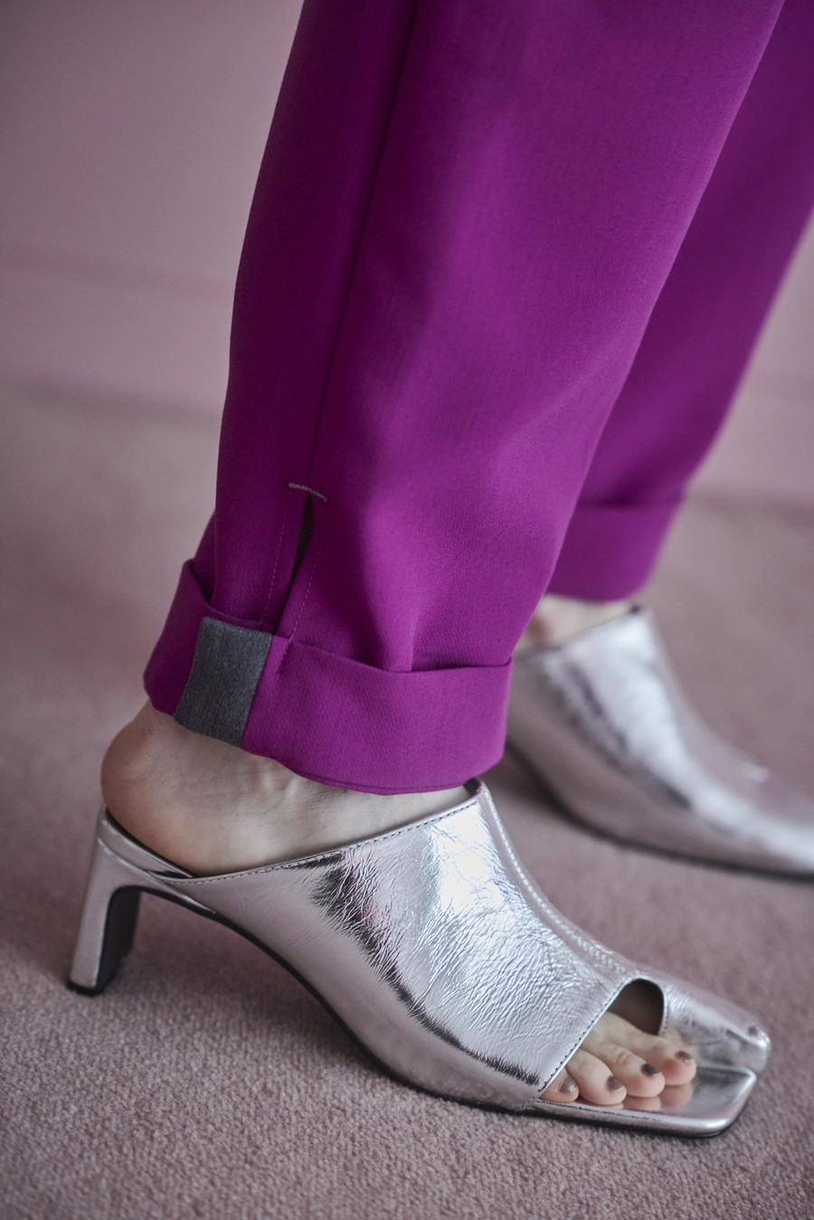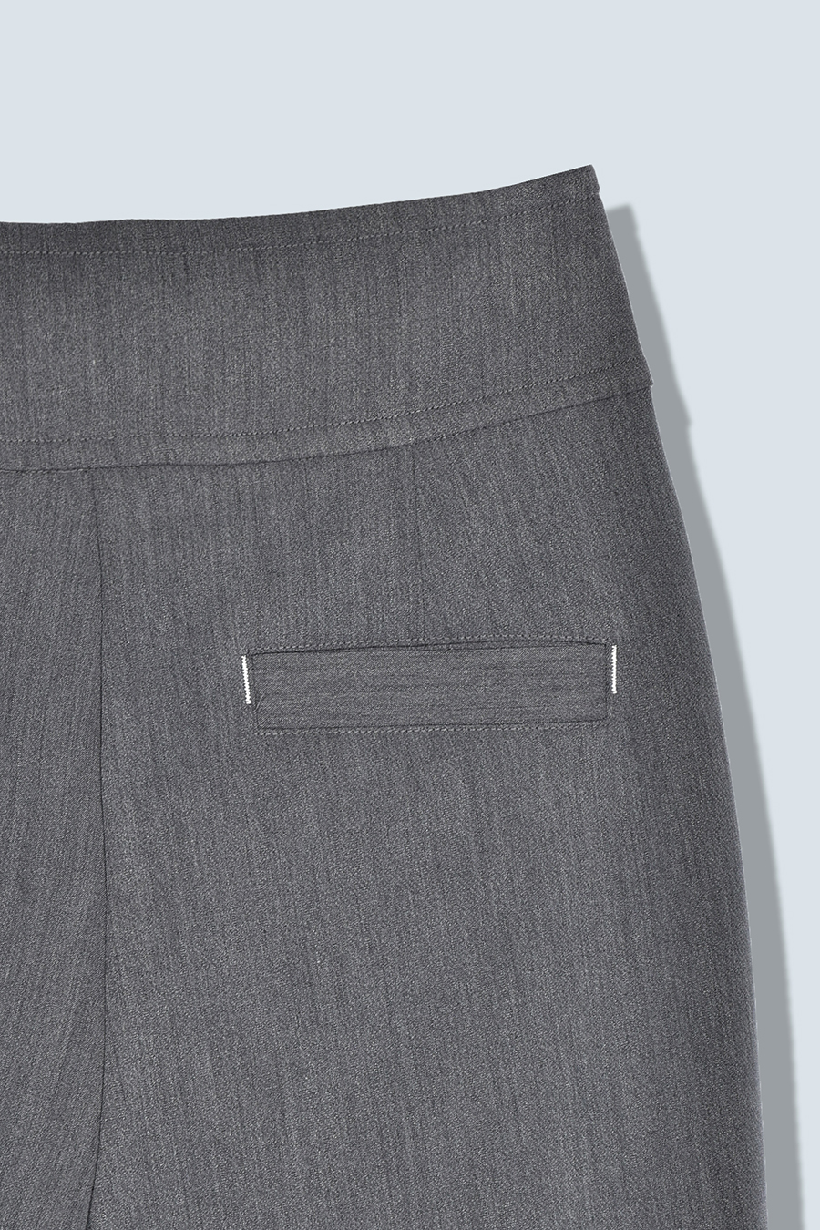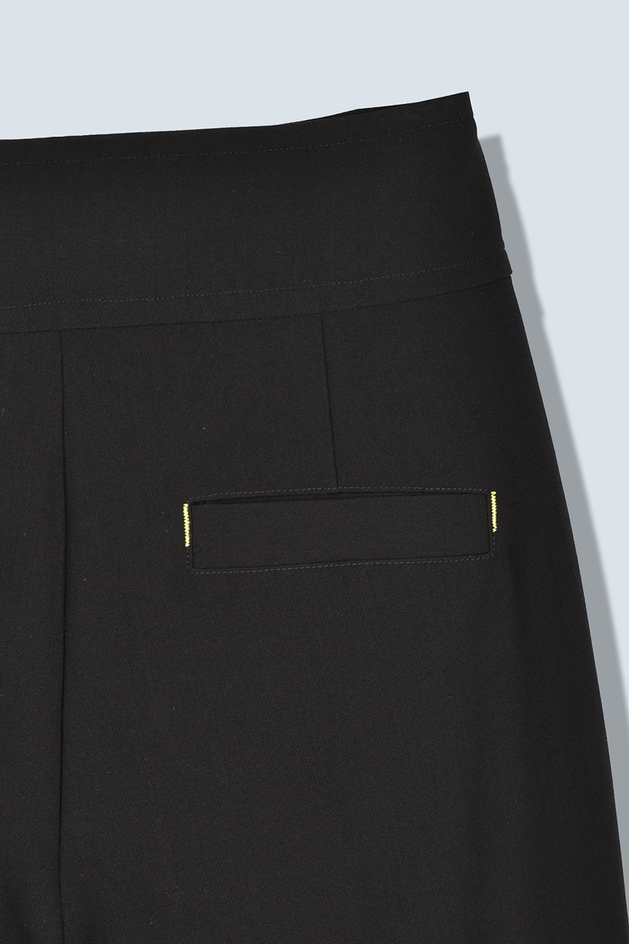 ウエストの太めベルトとラップデザインが目を引くテーパードパンツ。腰まわりに入れたタックが体型をカバーし、すっきりとしたラインに仕上げています。