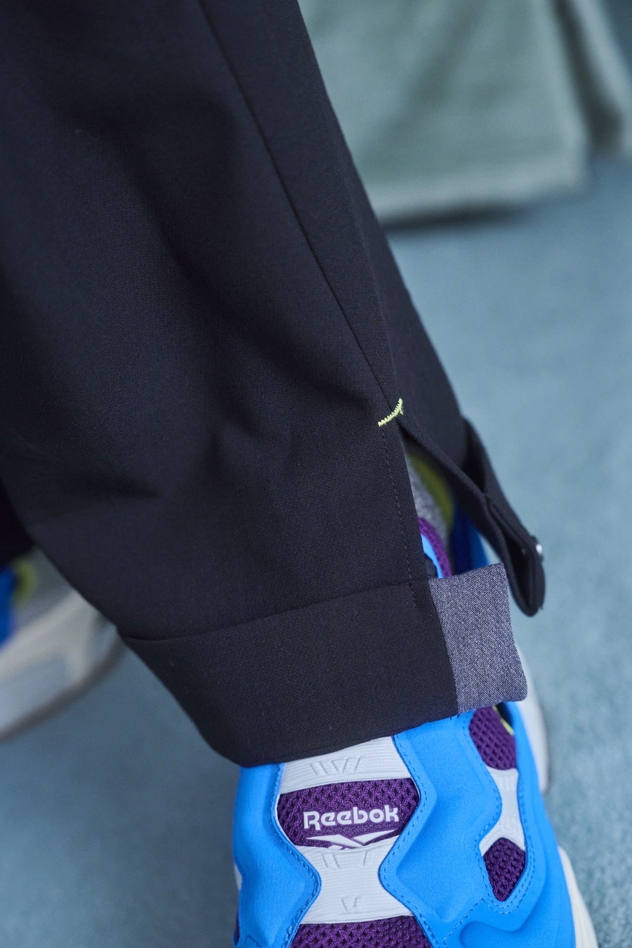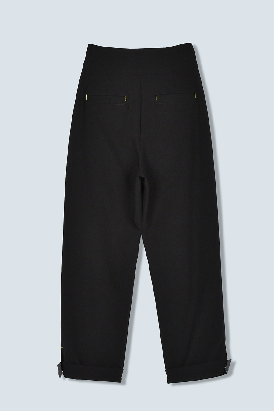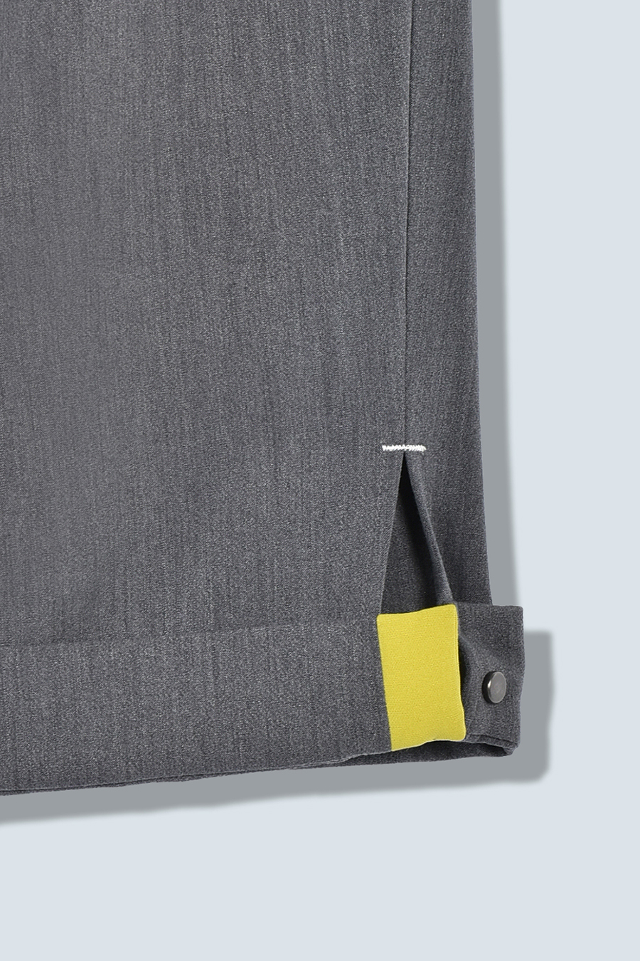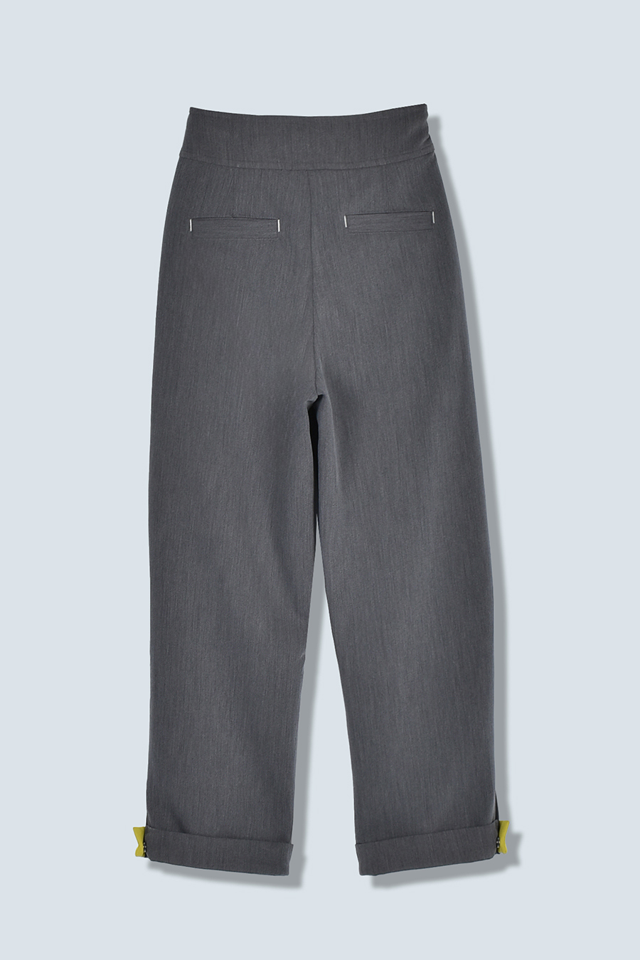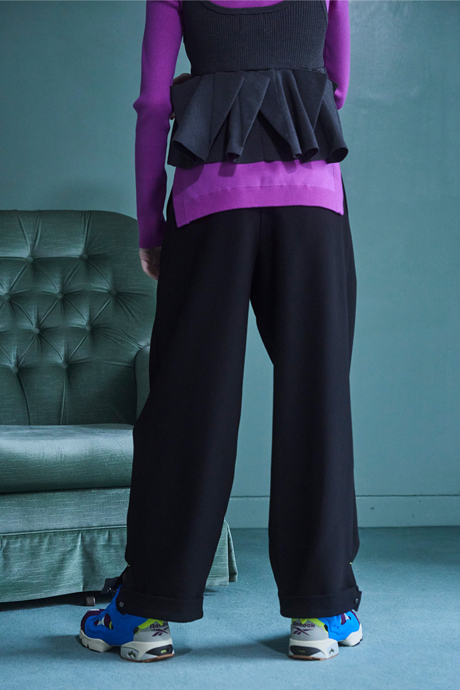 ウエストはドットボタンで3段階に調整でき、裾にもドットボタンを配して開閉が可能。