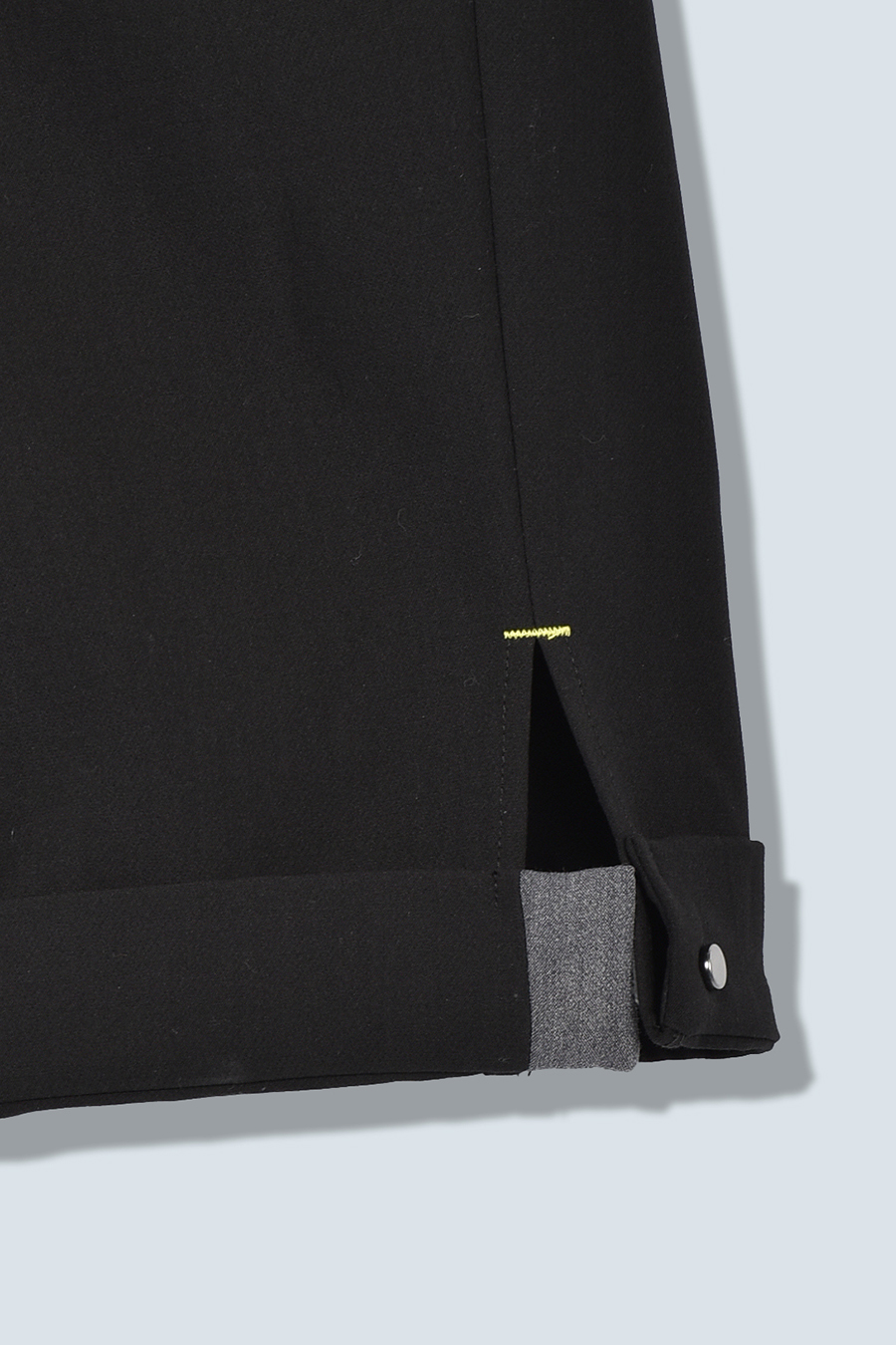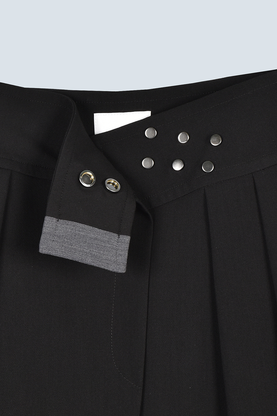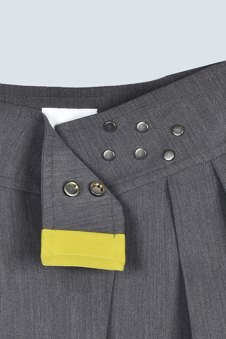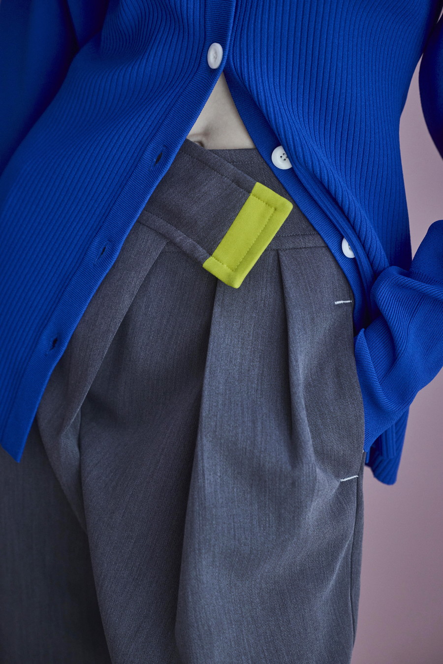 ウエストはドットボタンで3段階に調整でき、裾にもドットボタンを配して開閉が可能。