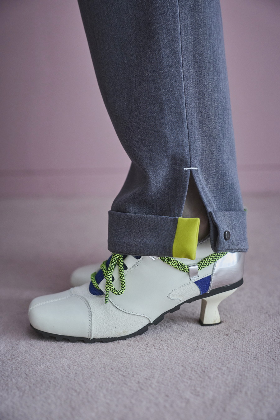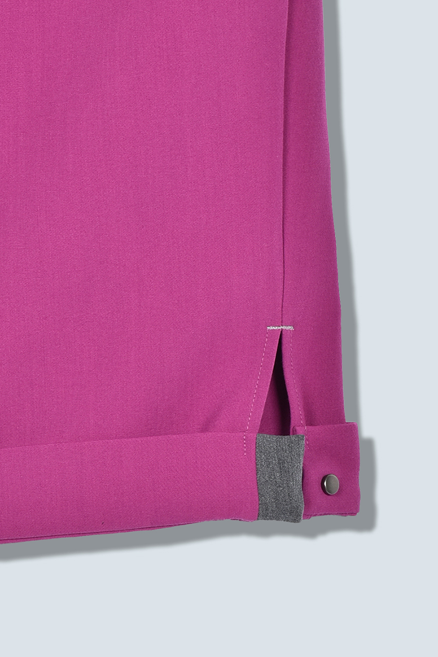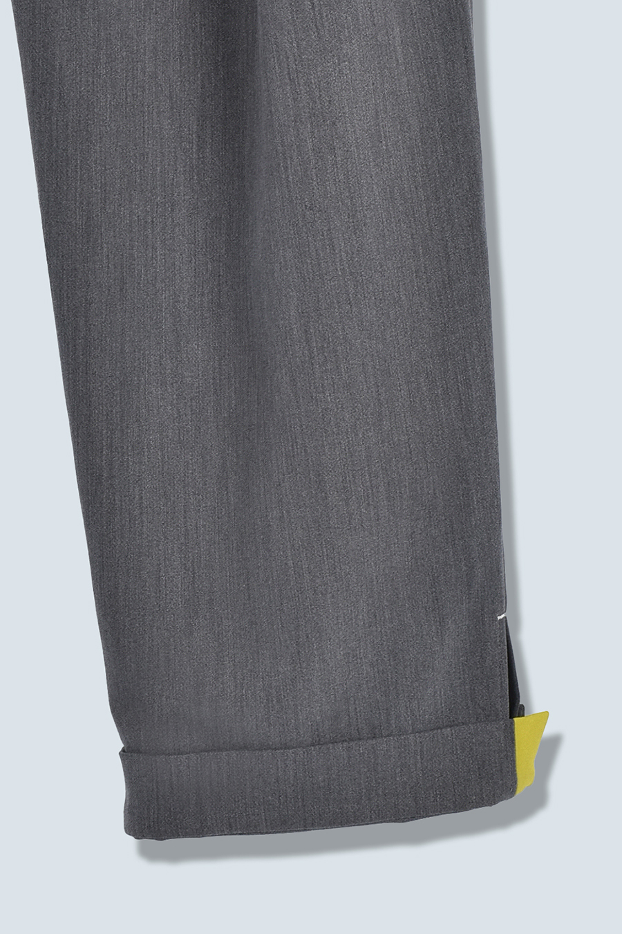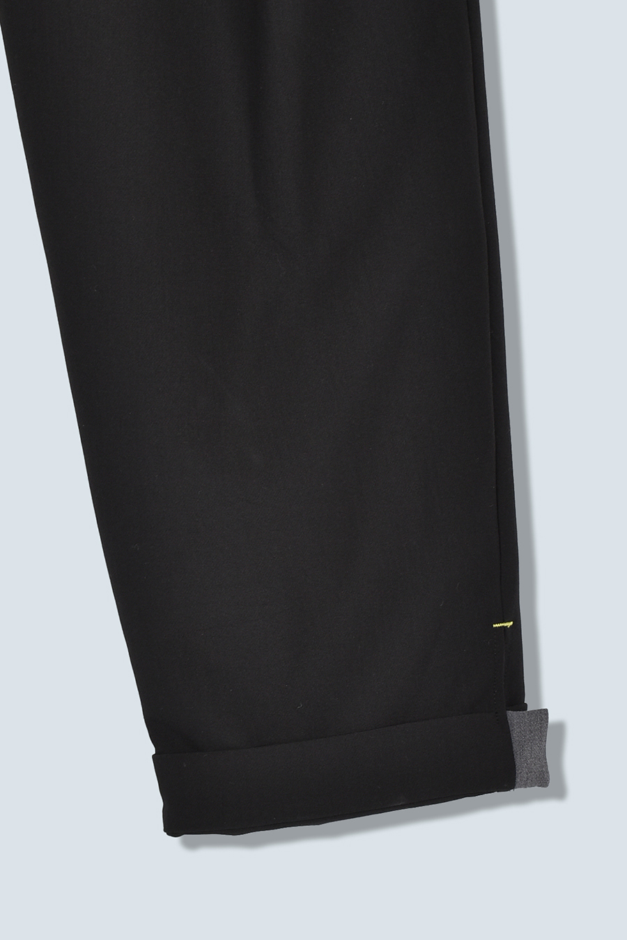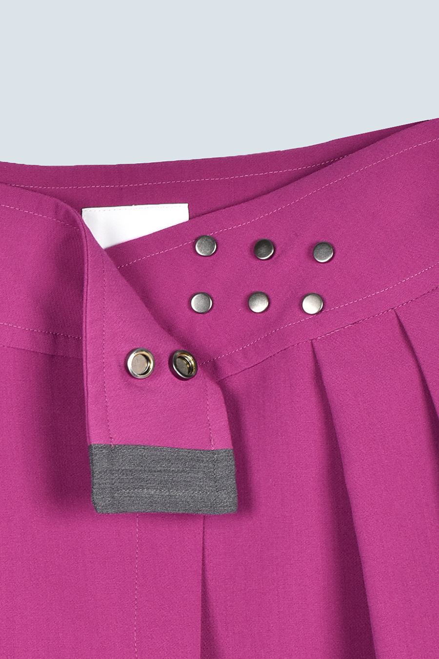 ウエストはドットボタンで3段階に調整でき、裾にもドットボタンを配して開閉が可能。