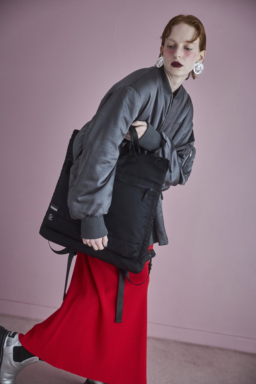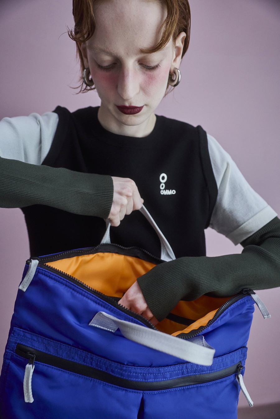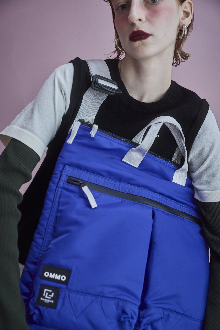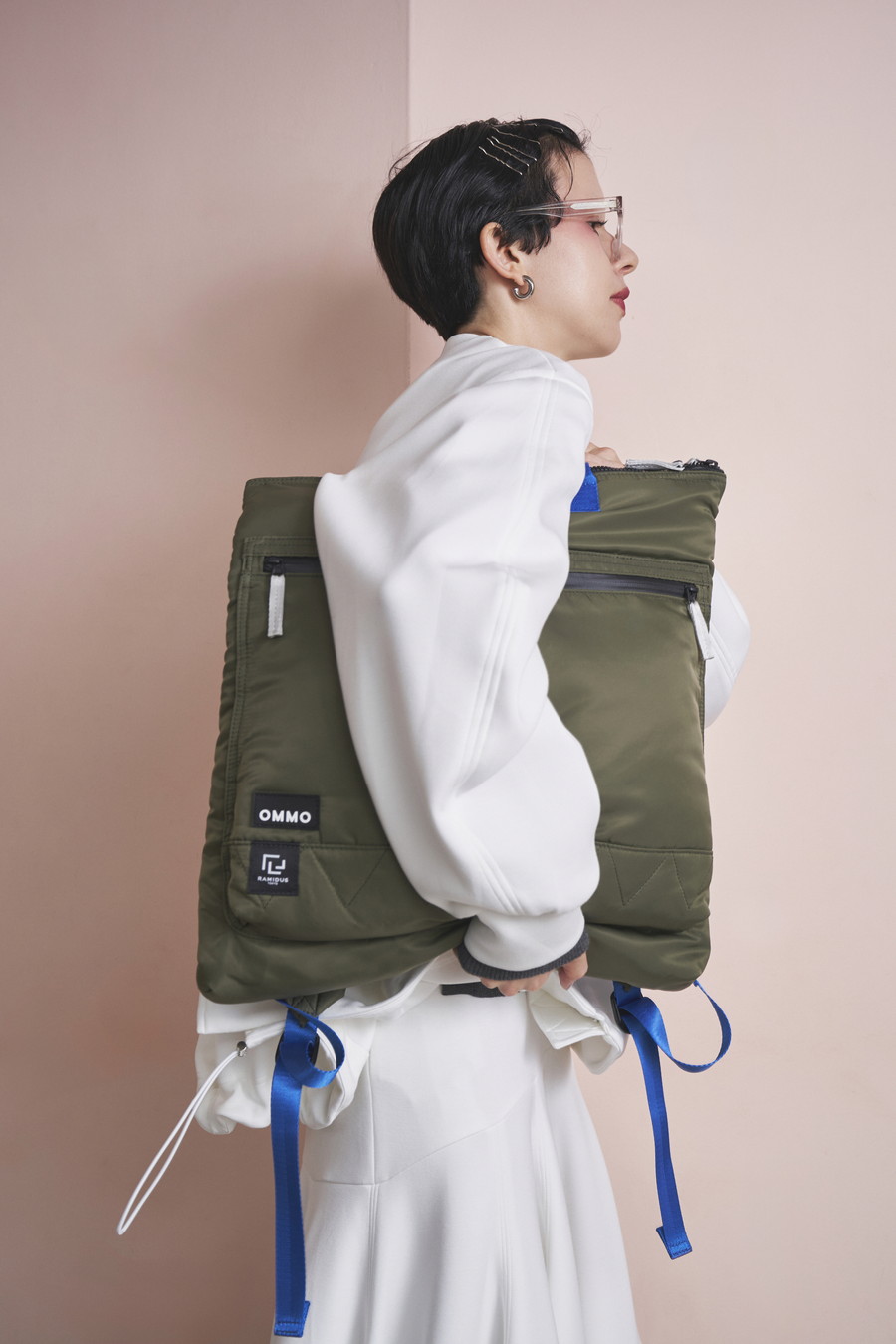 フロントポケットにはMA-1らしいステッチや、OMMOらしいカラーがポイントに。