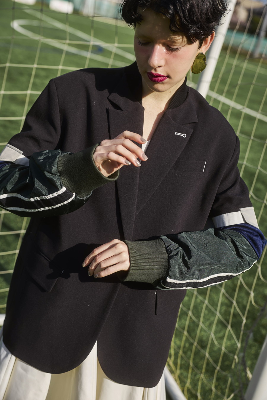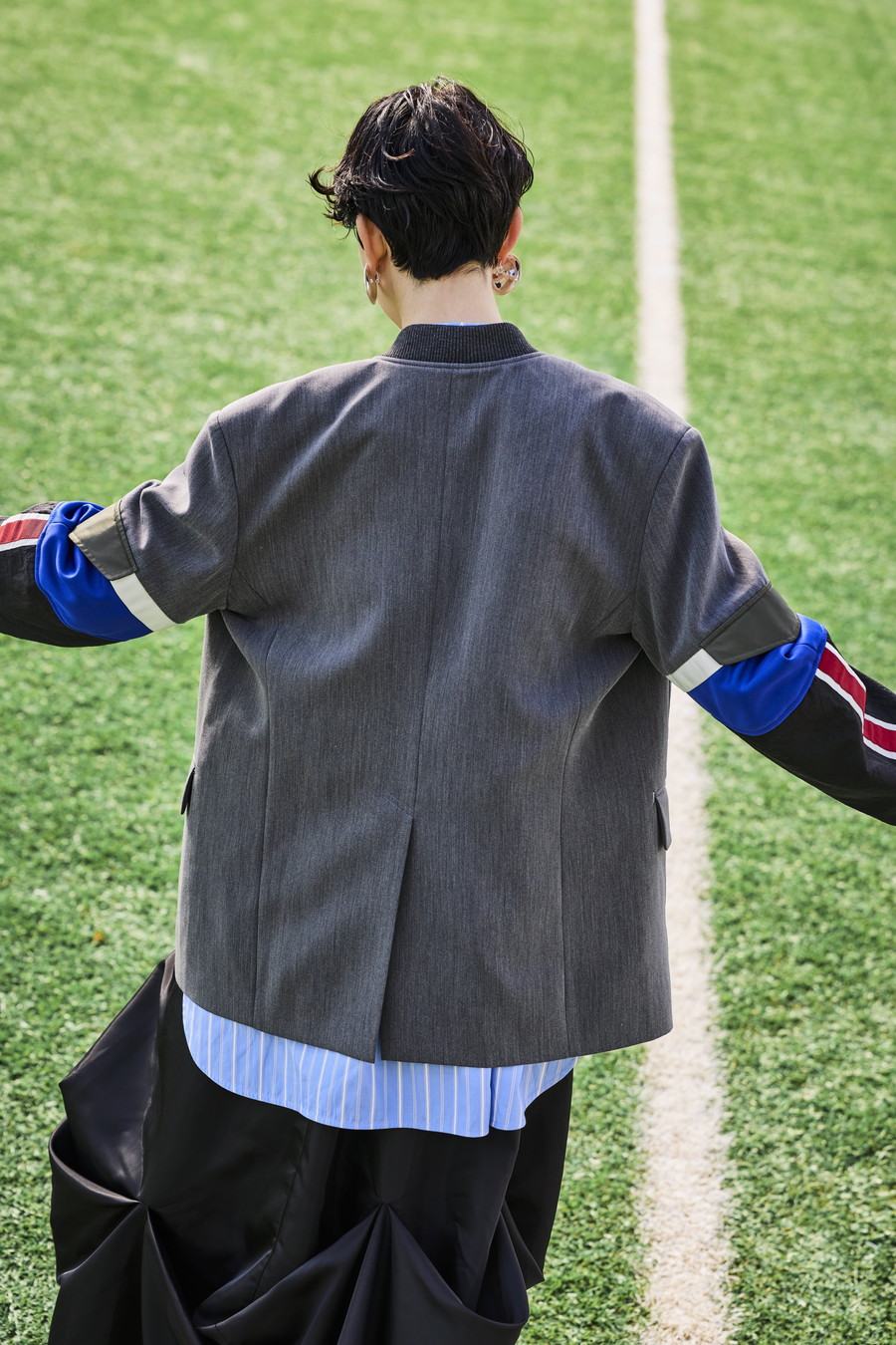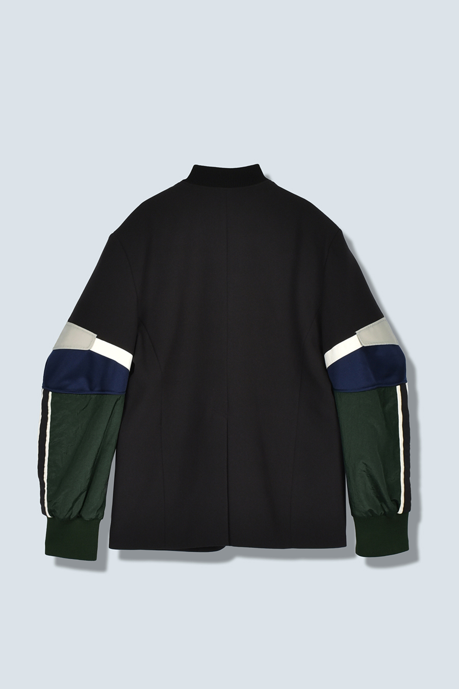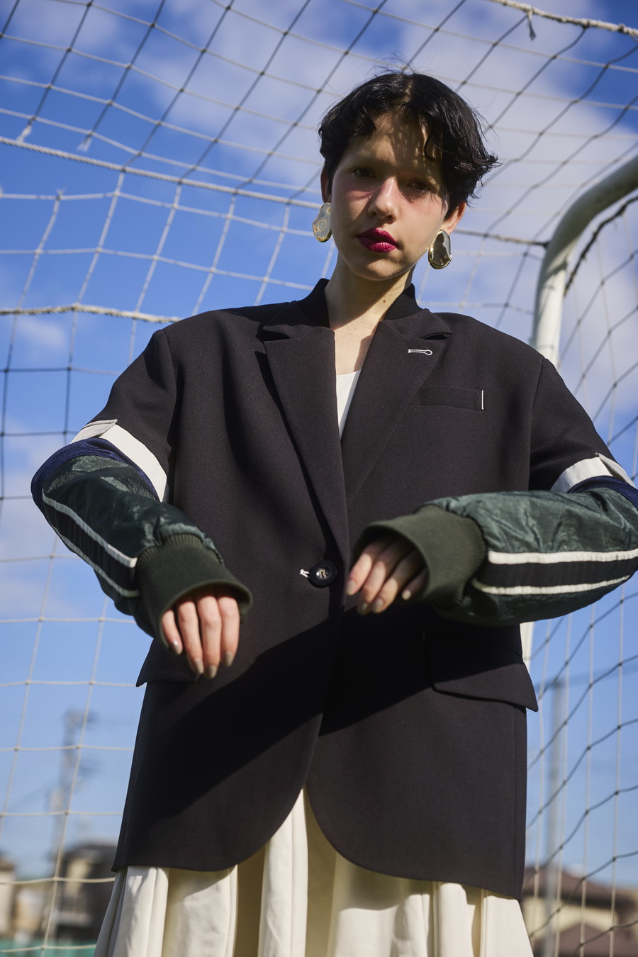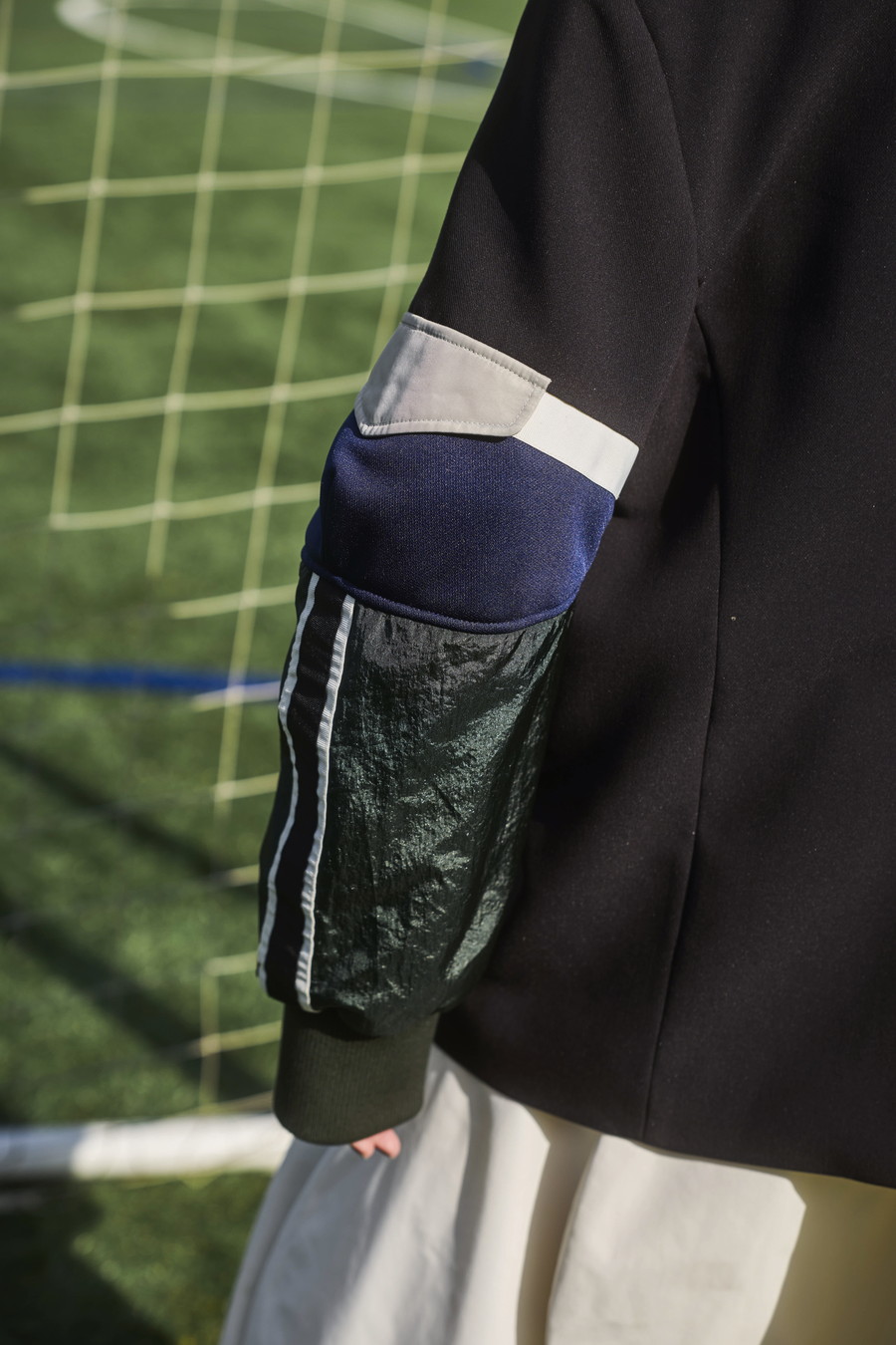 クラシックなテーラードジャケットに、スポーティなトラックジャケットをドッキングさせたハイブリッドデザインのジャケット。袖のドッキング部分には中綿を入れ、立体的なフォルムと軽やかな着用感を両立しています。