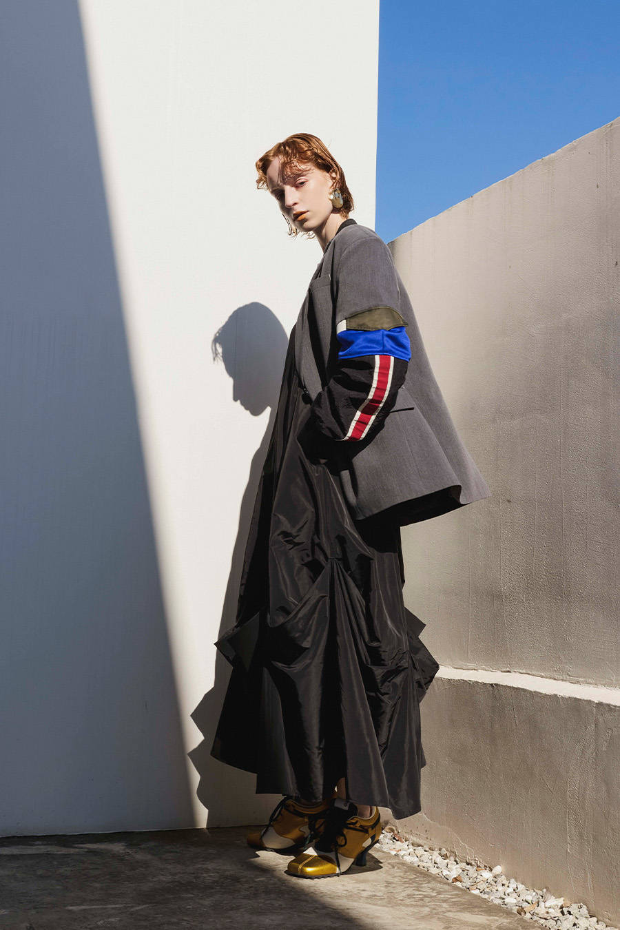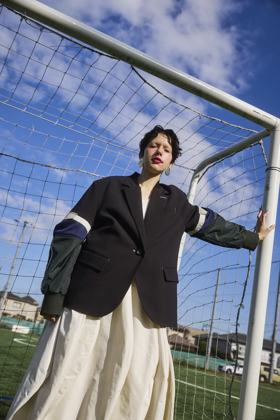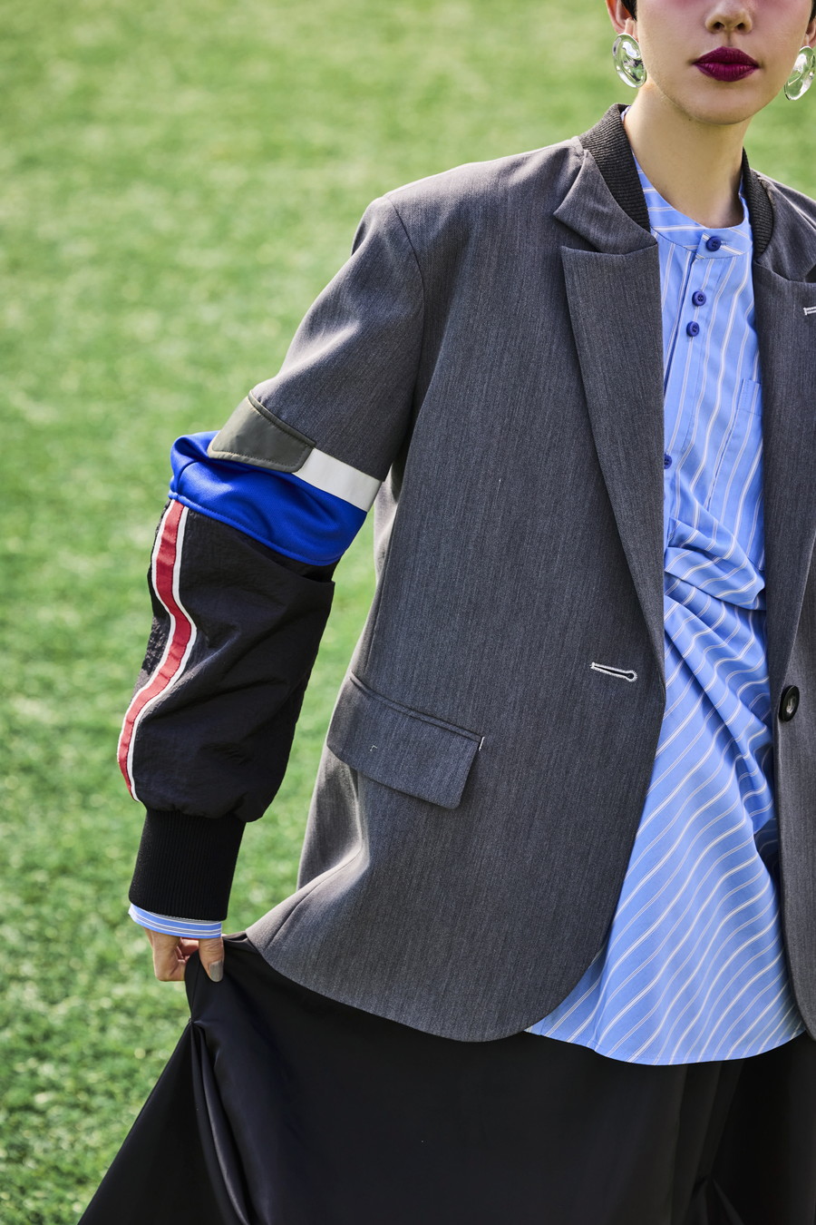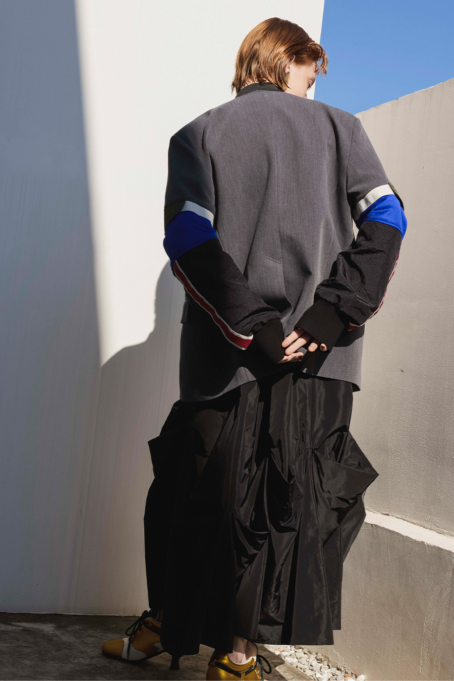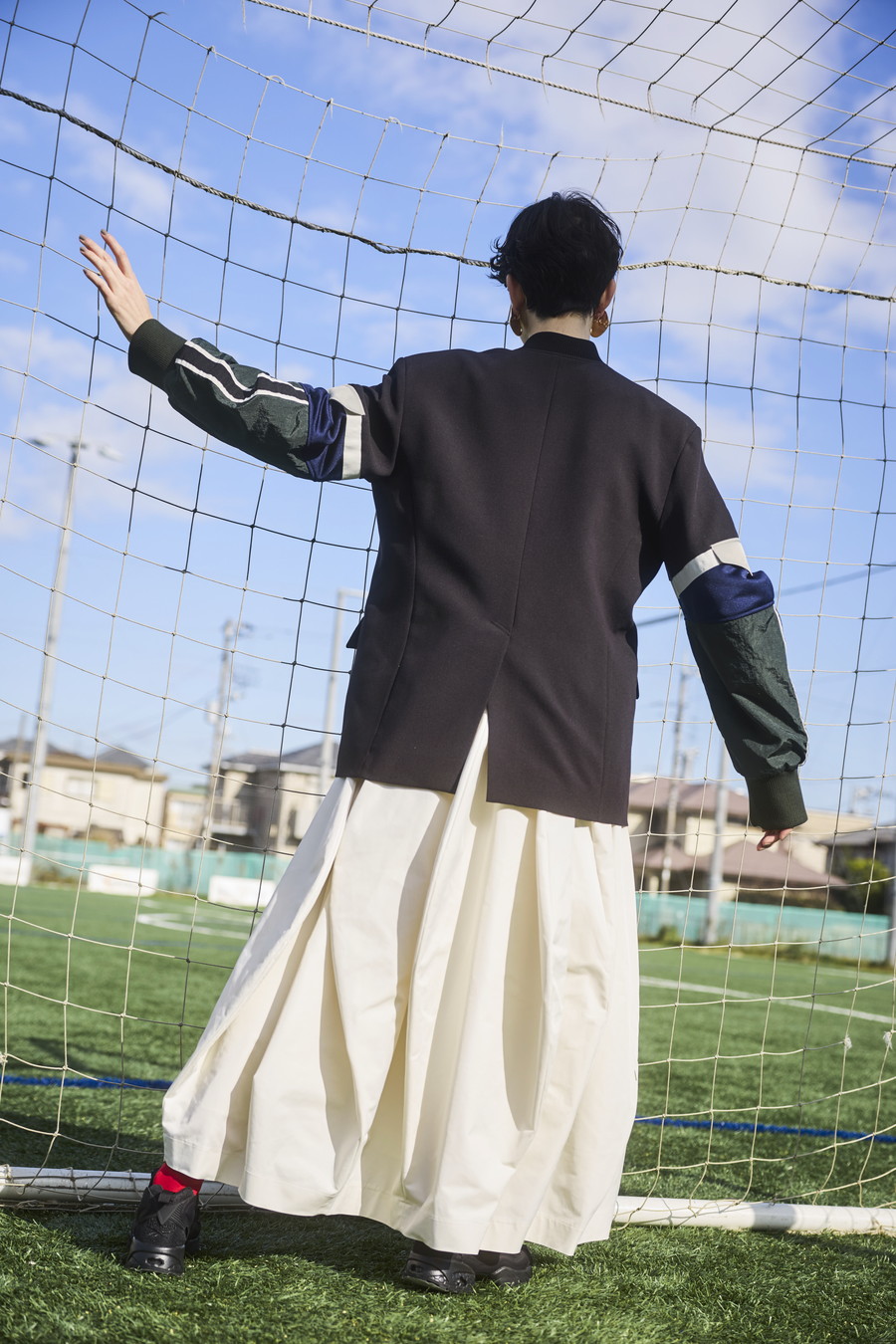 クラシックなテーラードジャケットに、スポーティなトラックジャケットをドッキングさせたハイブリッドデザインのジャケット。袖のドッキング部分には中綿を入れ、立体的なフォルムと軽やかな着用感を両立しています。