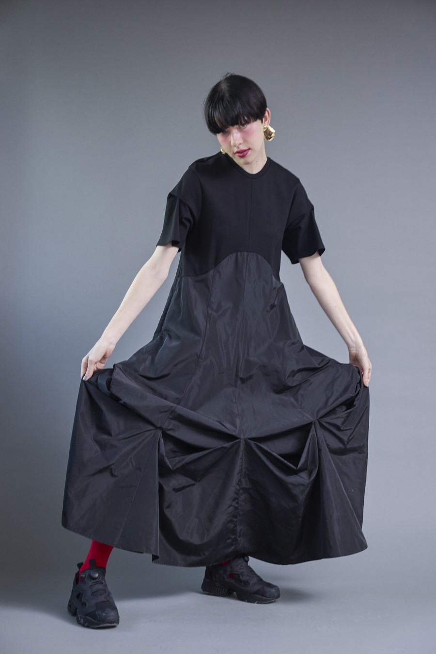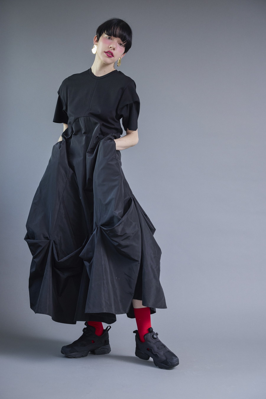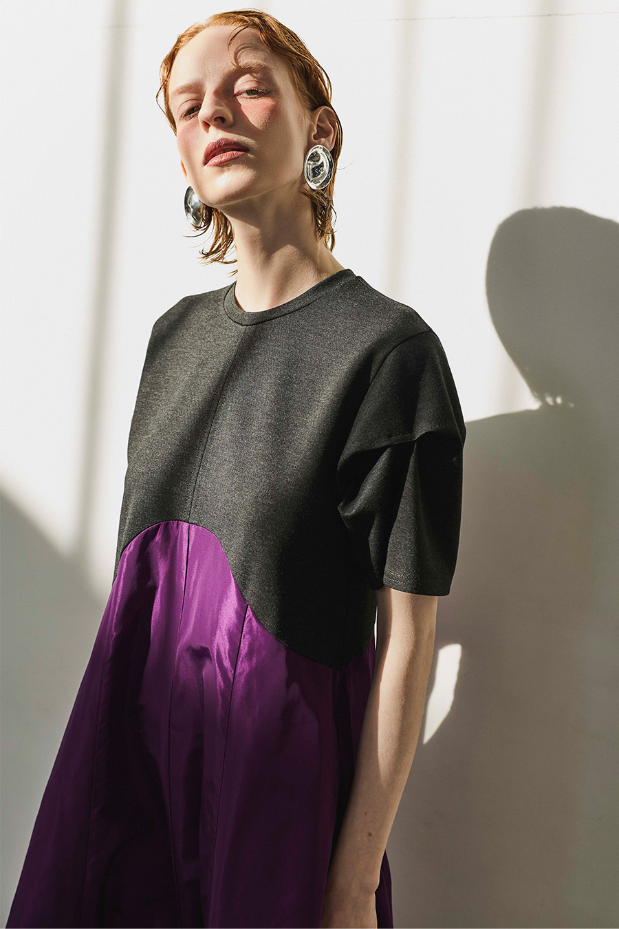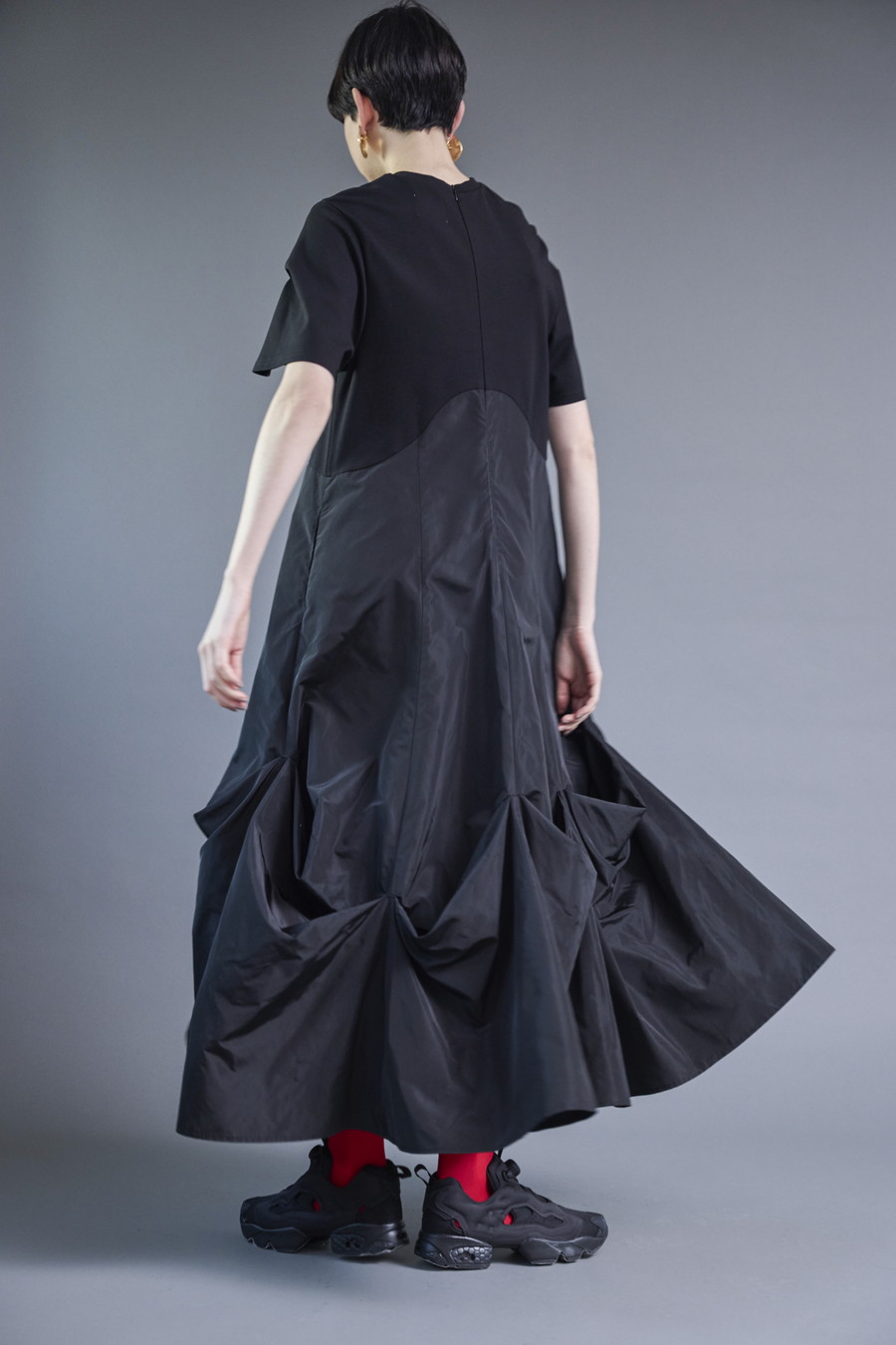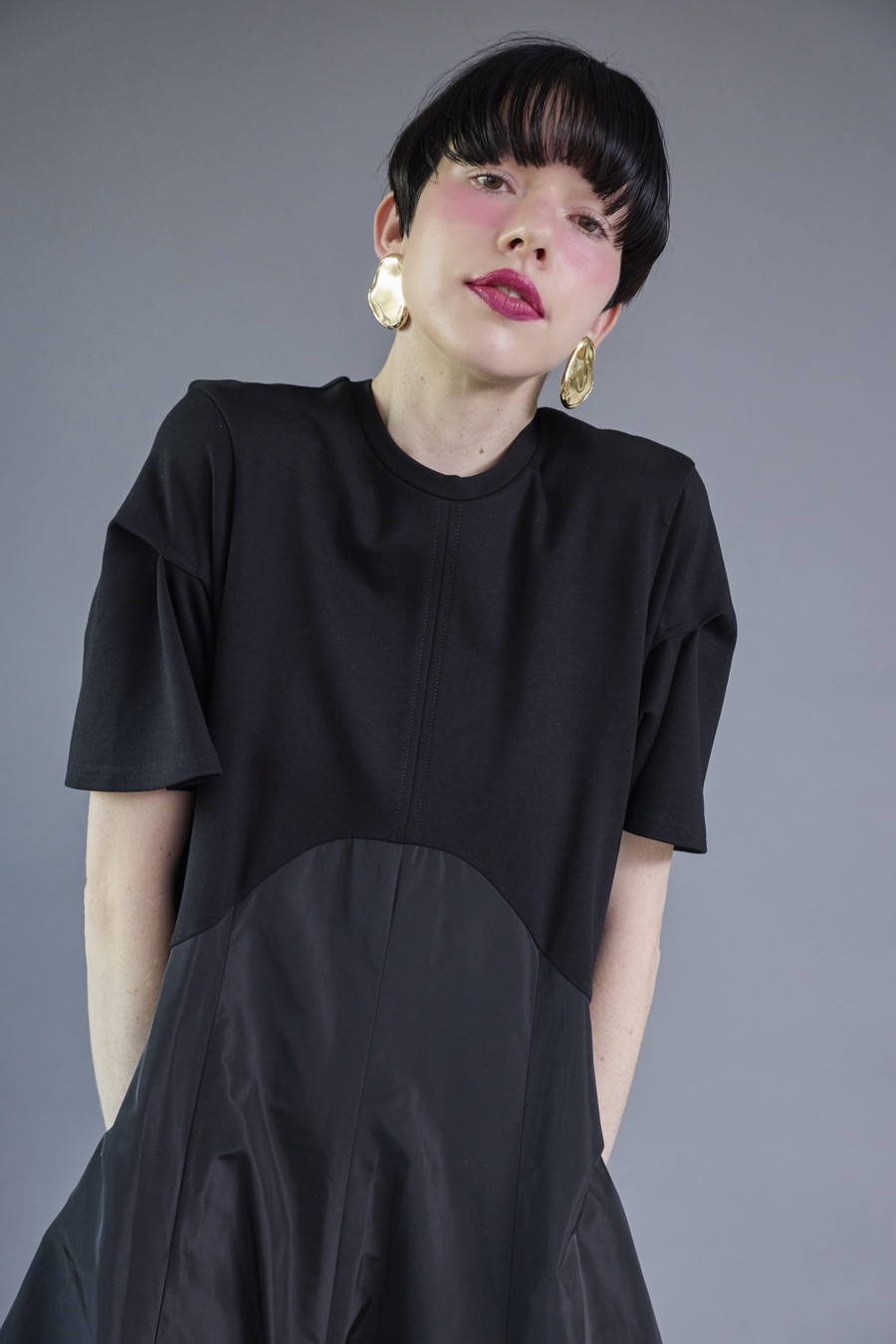 大胆なタックディテールが目を惹くカットソーと布帛のドッキングワンピース。バスト下からは軽くて張りのあるポリエステル素材を使用しており、ボリューム分量はしっかりとありますが着心地が軽く様々な体型の方にも取り入れやすいシルエットに仕上げております。