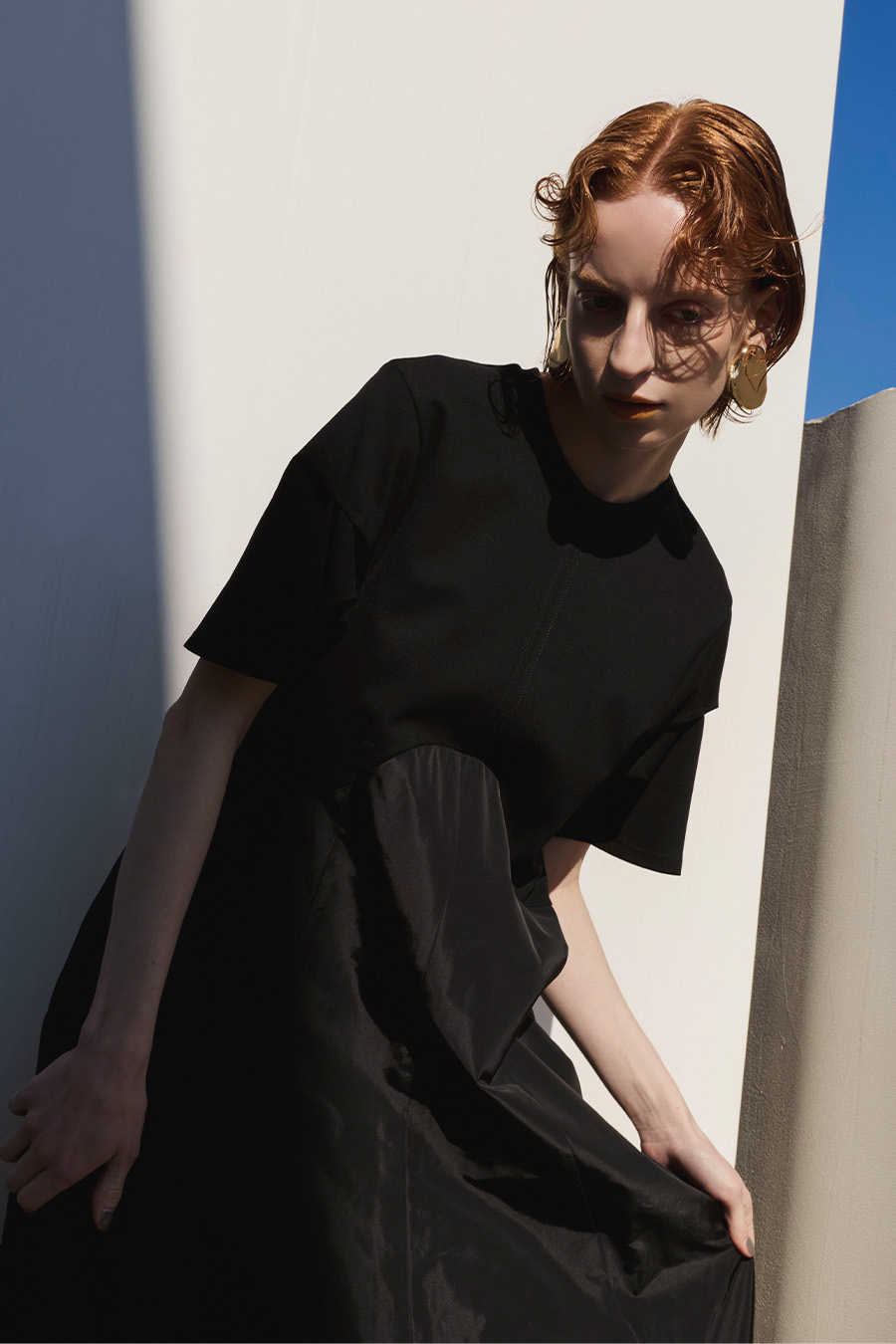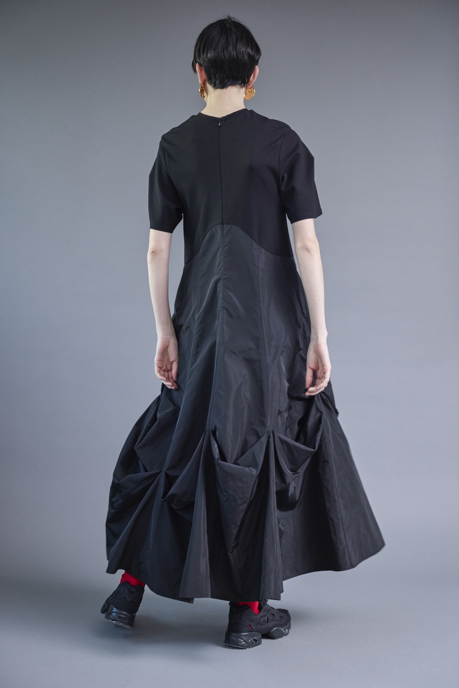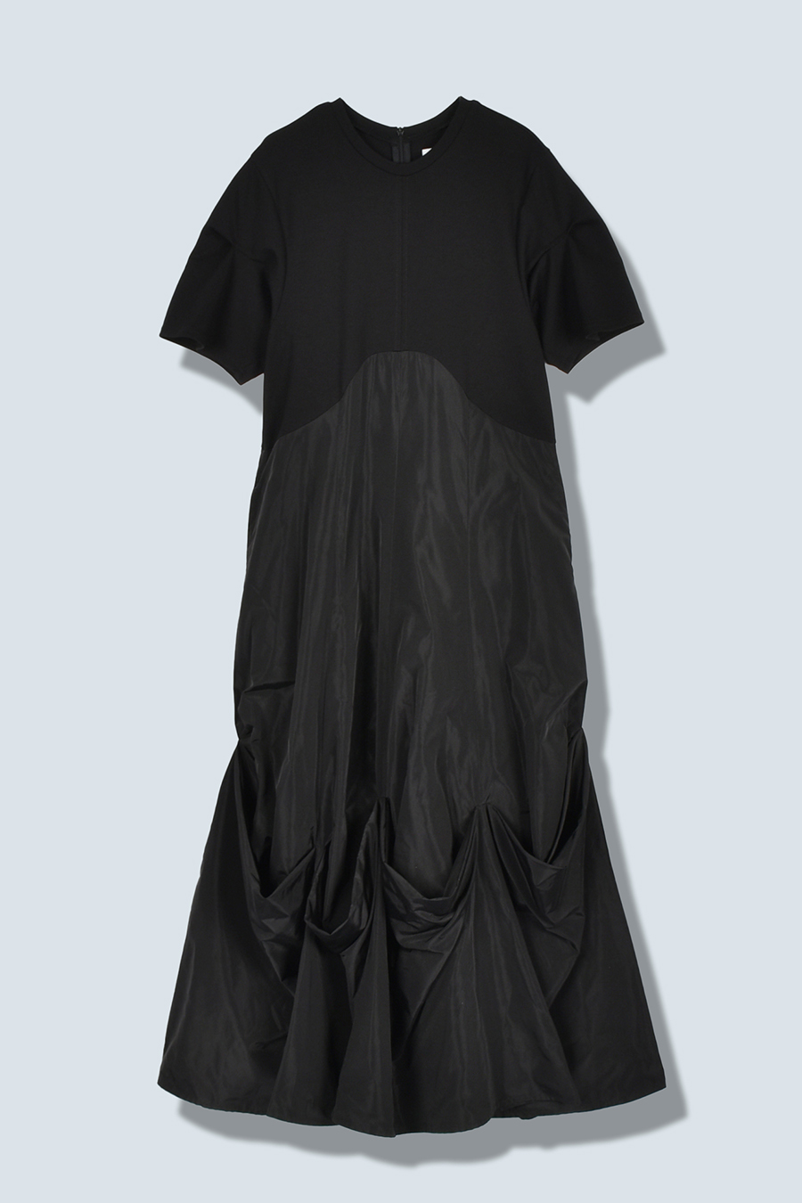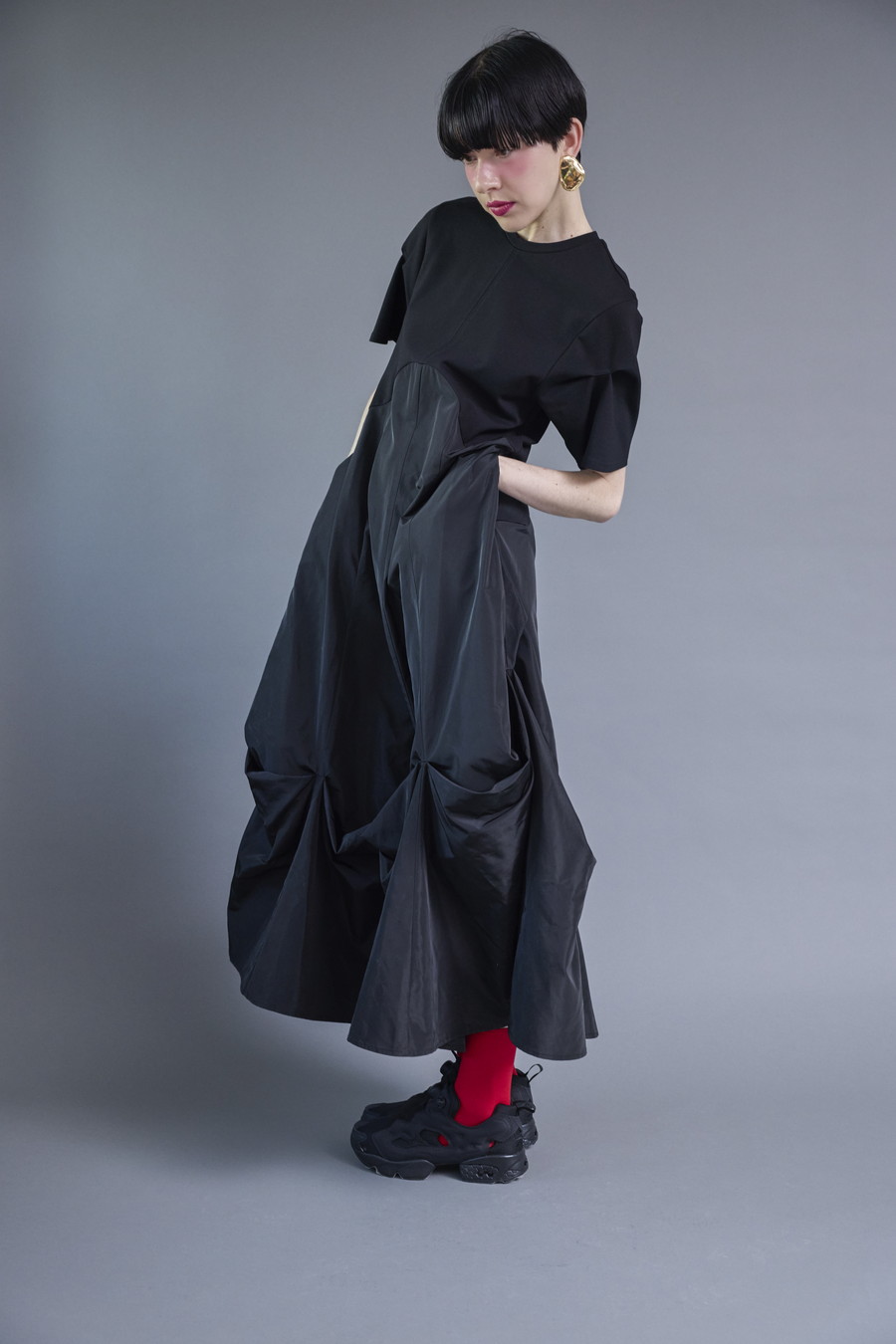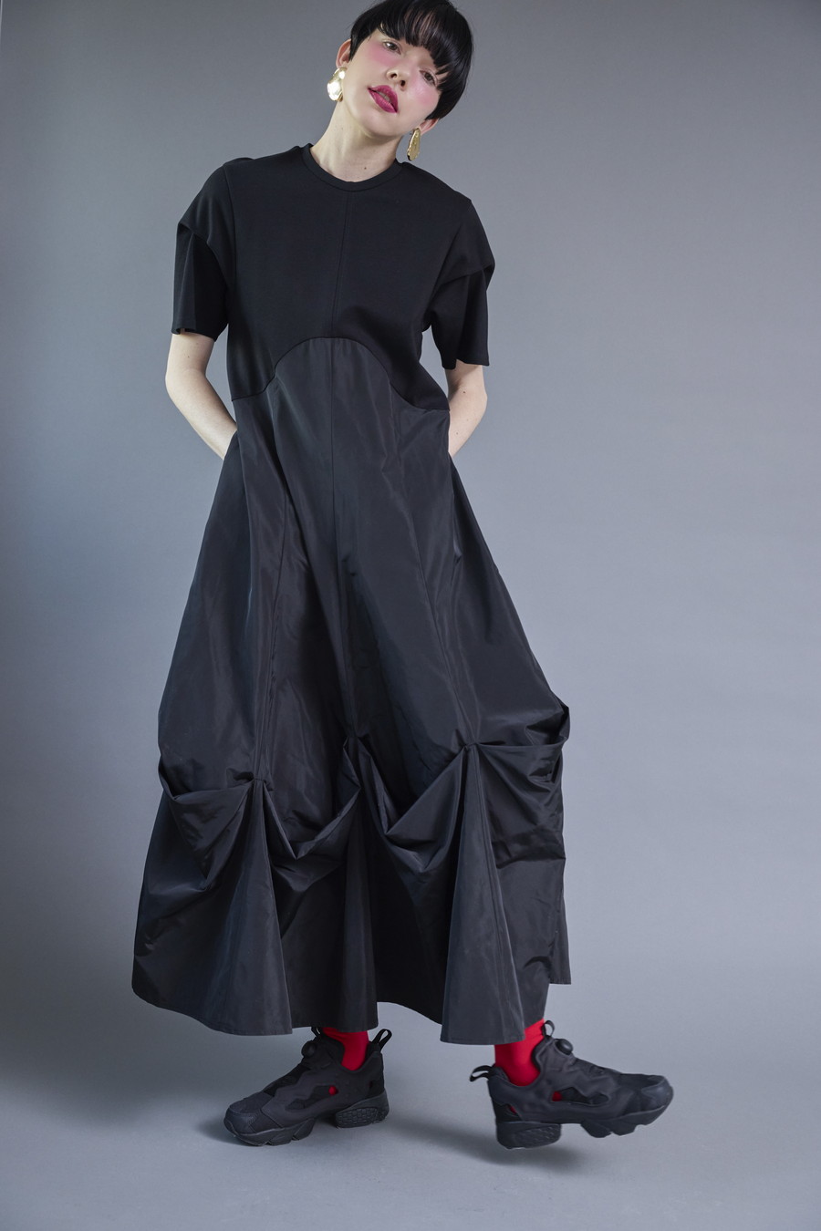 大胆なタックディテールが目を惹くカットソーと布帛のドッキングワンピース。バスト下からは軽くて張りのあるポリエステル素材を使用しており、ボリューム分量はしっかりとありますが着心地が軽く様々な体型の方にも取り入れやすいシルエットに仕上げております。