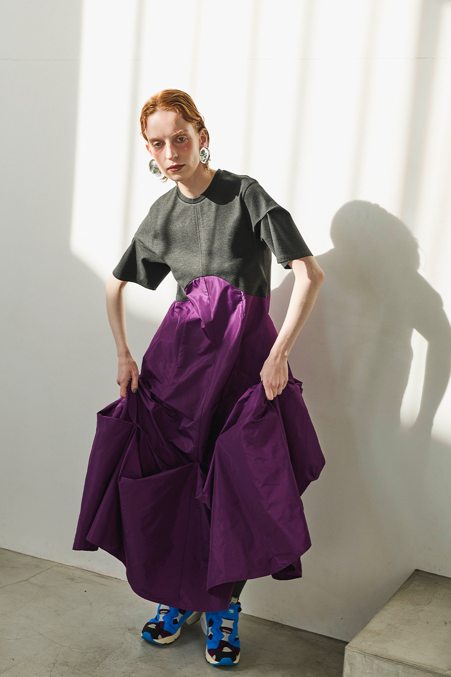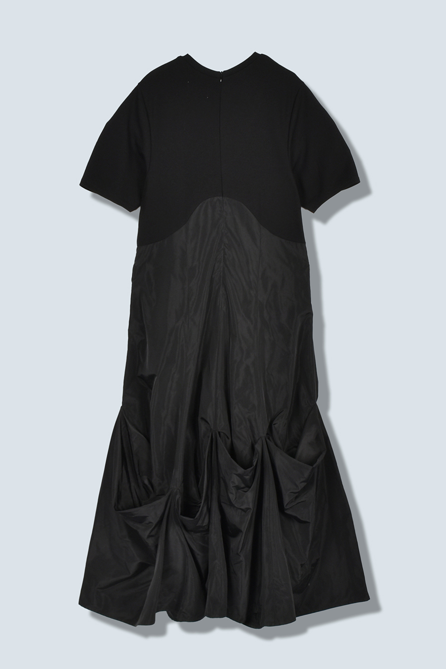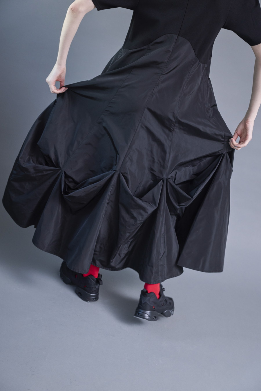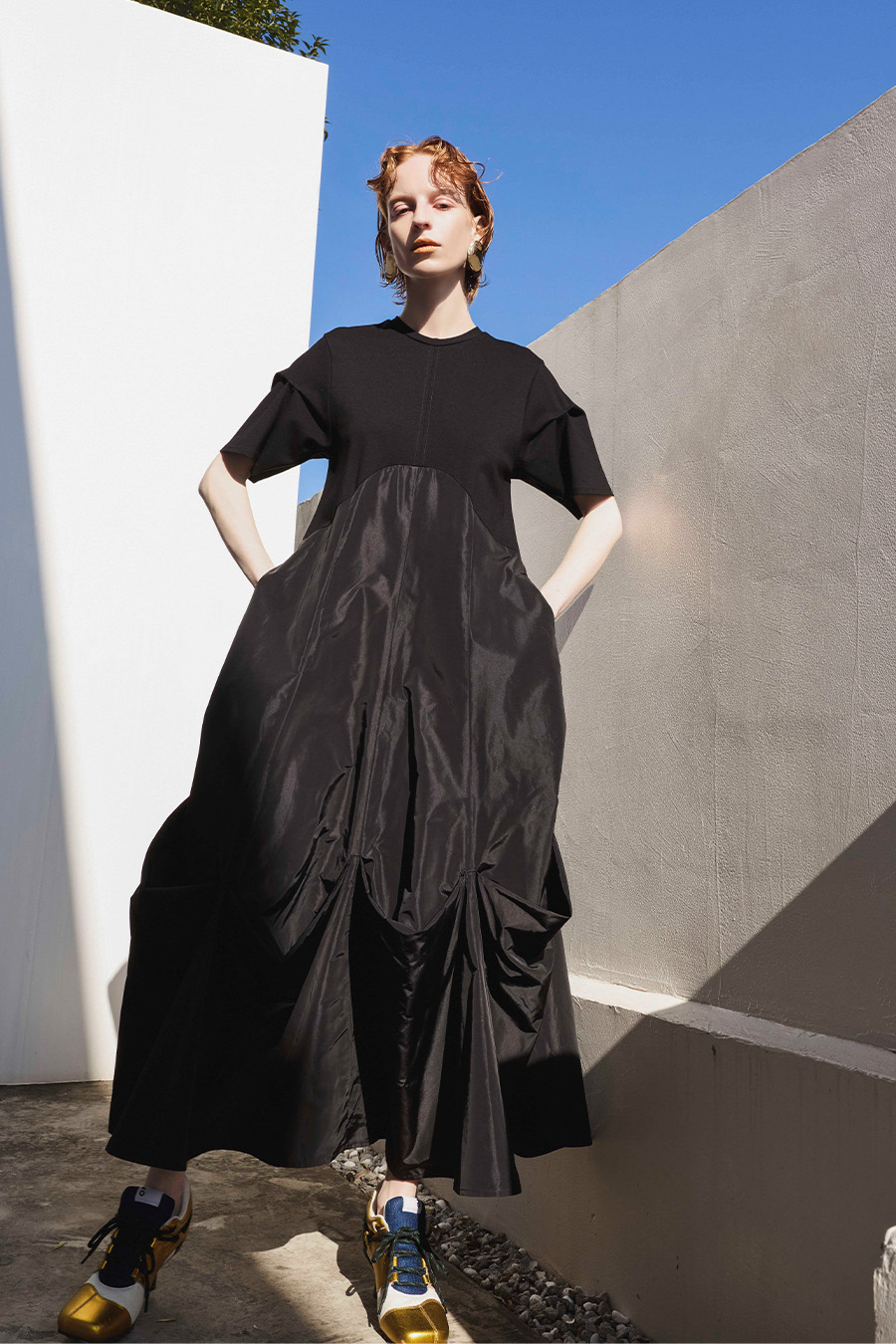 大胆なタックディテールが目を惹くカットソーと布帛のドッキングワンピース。バスト下からは軽くて張りのあるポリエステル素材を使用しており、ボリューム分量はしっかりとありますが着心地が軽く様々な体型の方にも取り入れやすいシルエットに仕上げております。