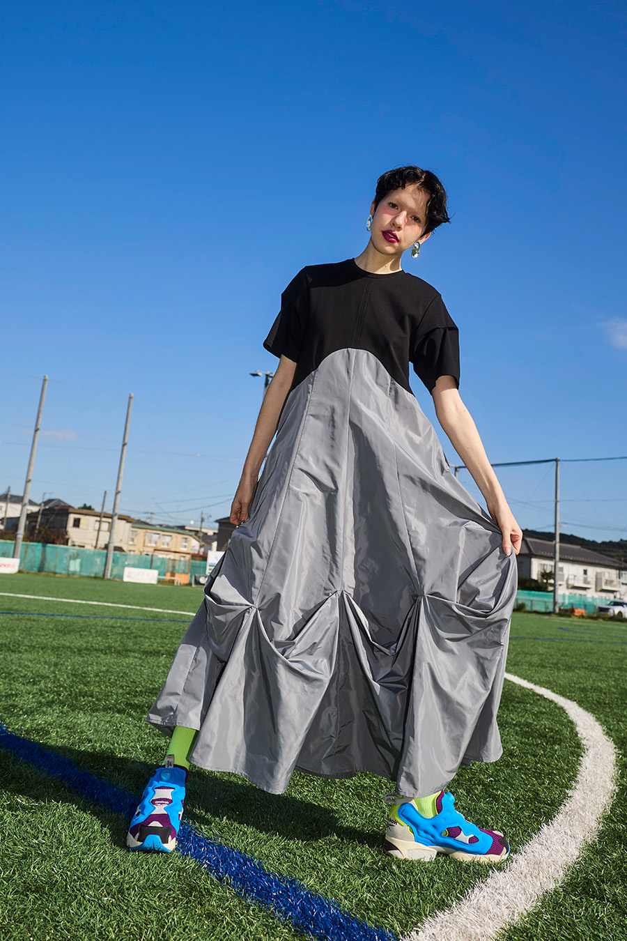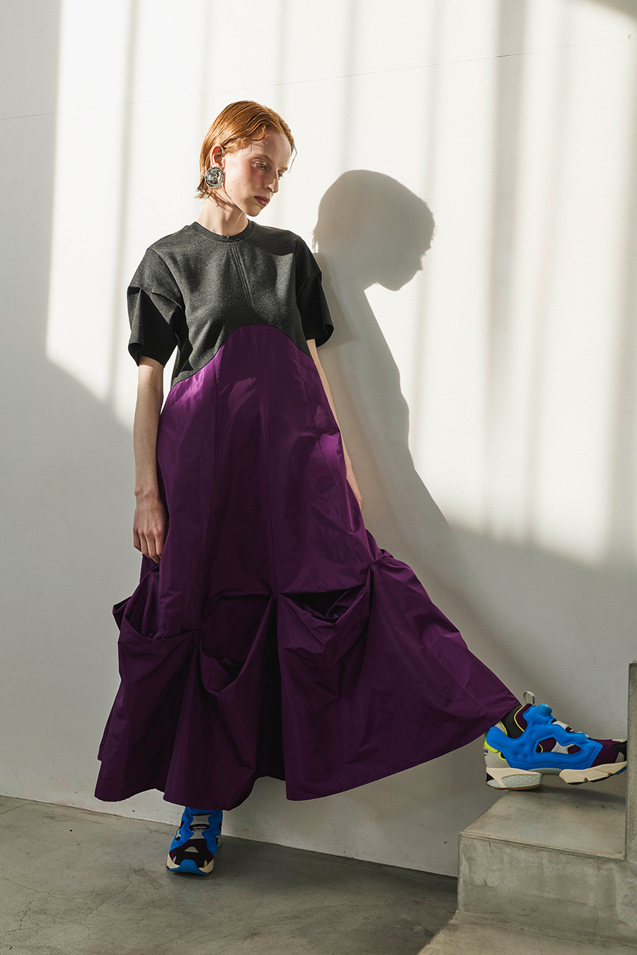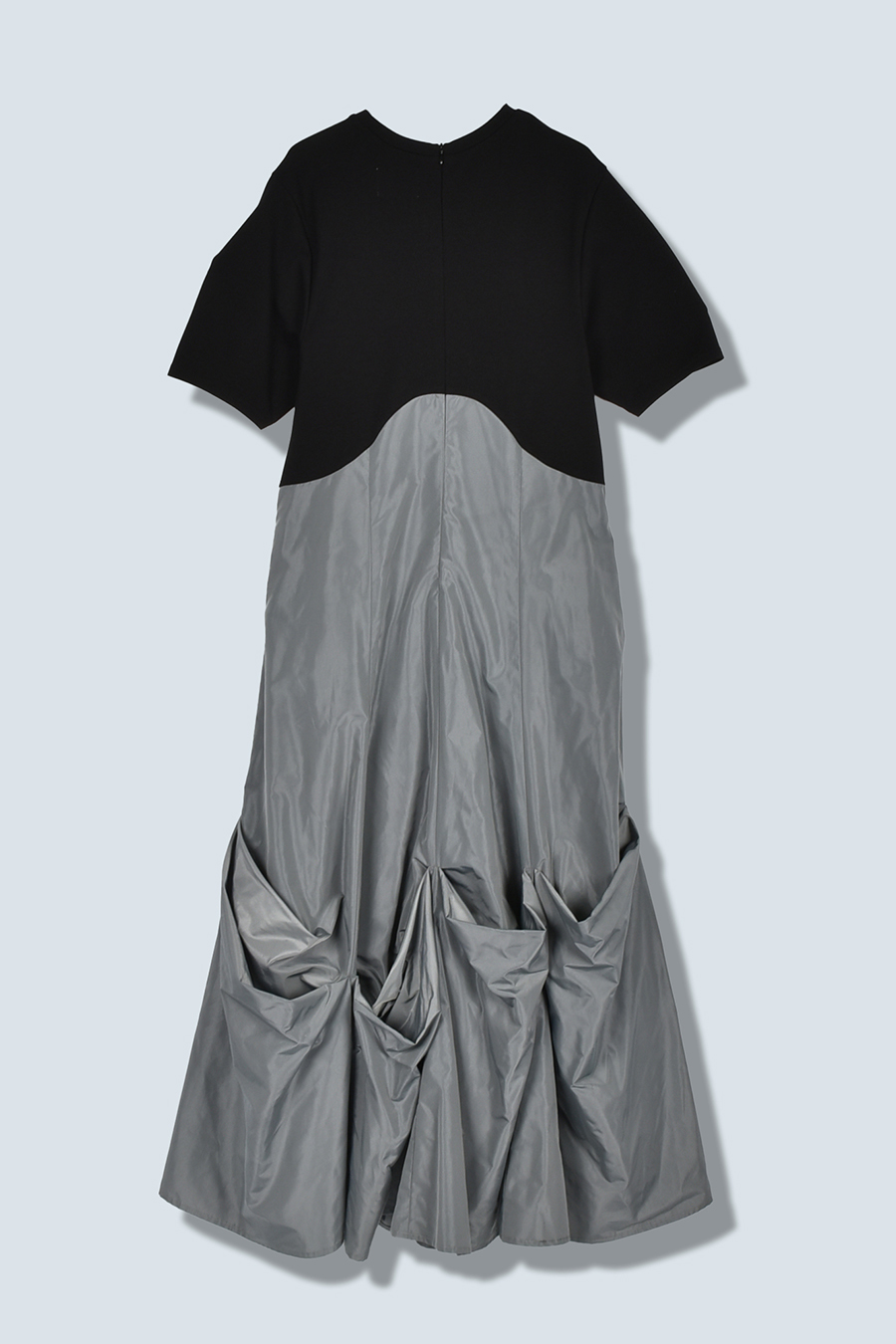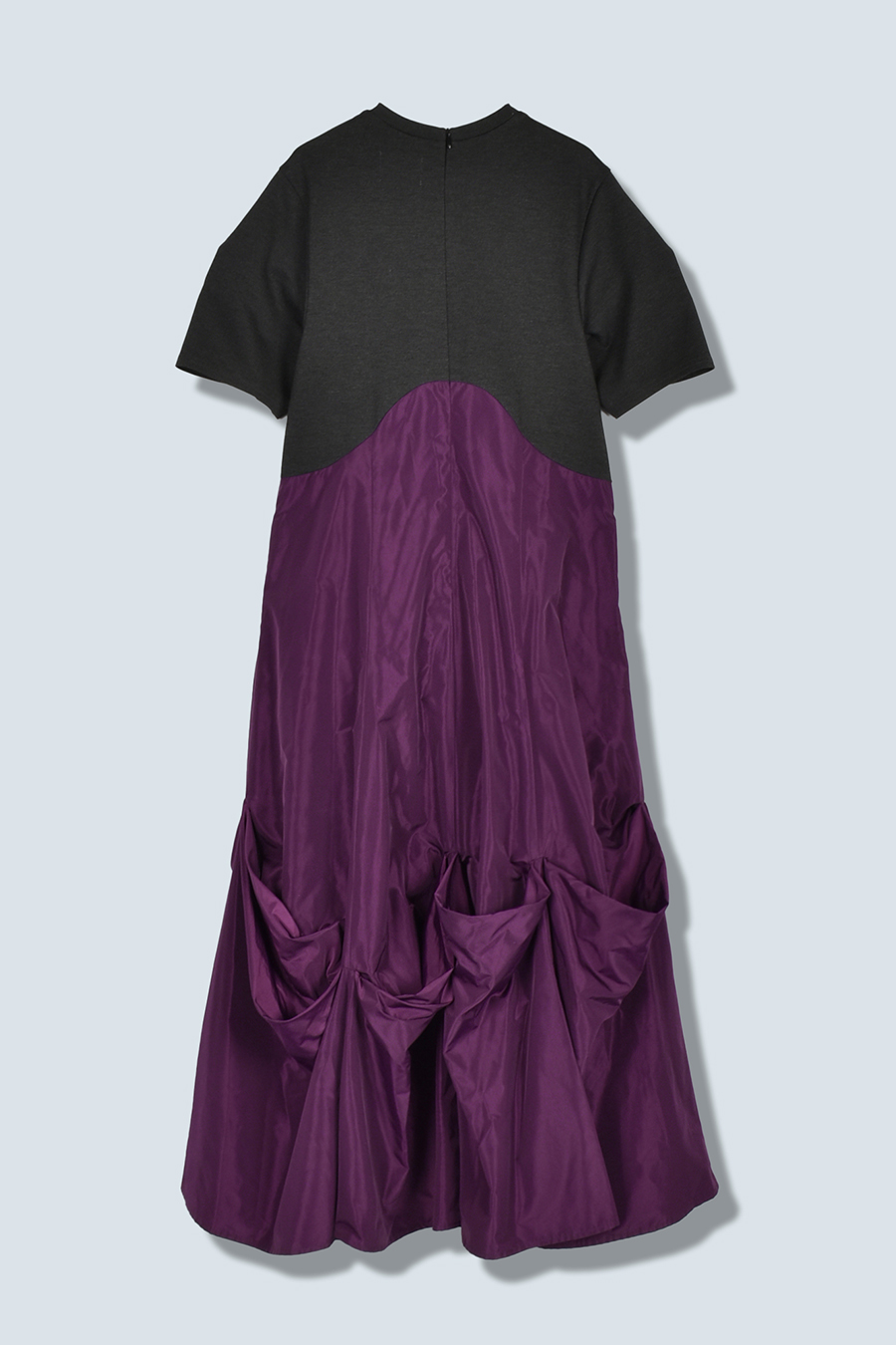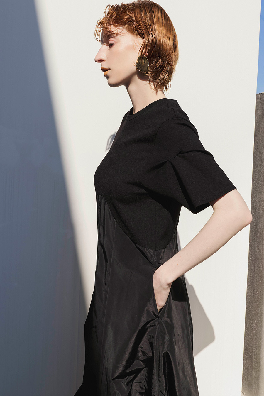大胆なタックディテールが目を惹くカットソーと布帛のドッキングワンピース。バスト下からは軽くて張りのあるポリエステル素材を使用しており、ボリューム分量はしっかりとありますが着心地が軽く様々な体型の方にも取り入れやすいシルエットに仕上げております。
