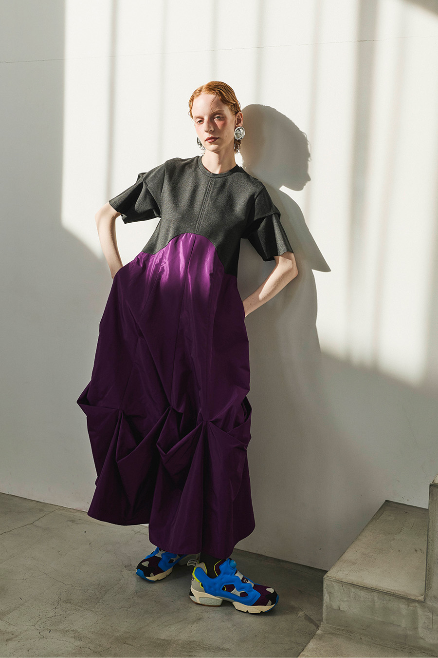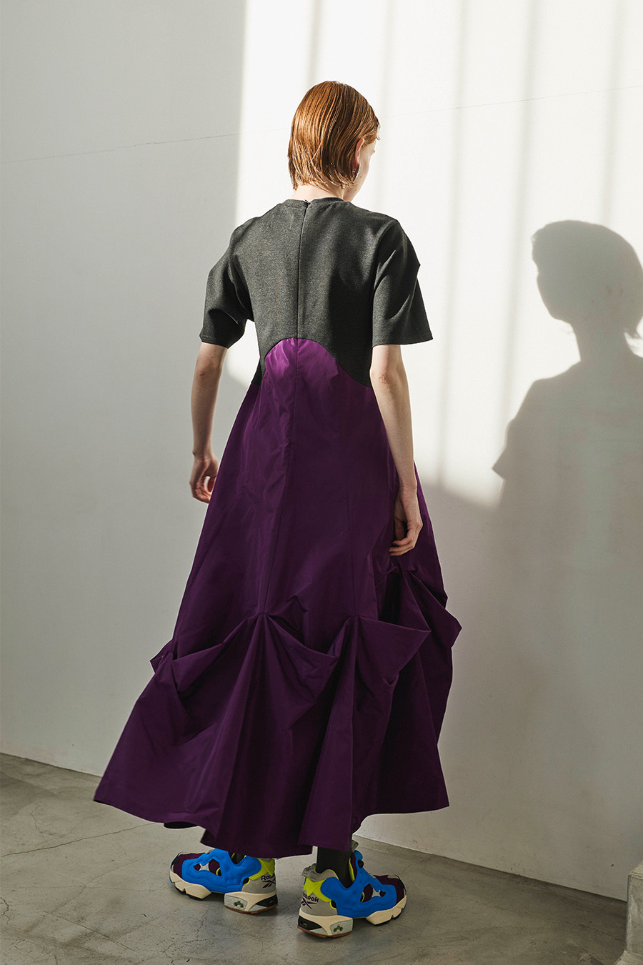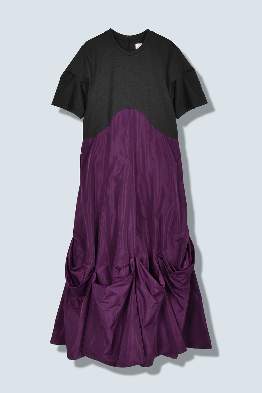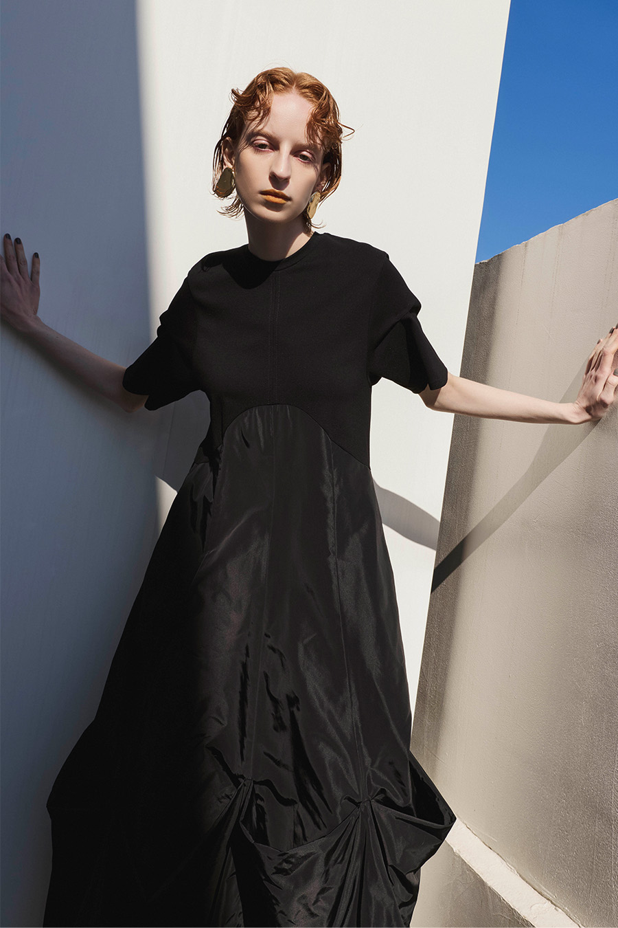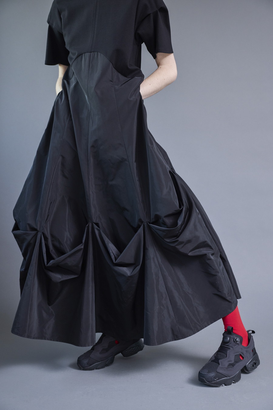 大胆なタックディテールが目を惹くカットソーと布帛のドッキングワンピース。バスト下からは軽くて張りのあるポリエステル素材を使用しており、ボリューム分量はしっかりとありますが着心地が軽く様々な体型の方にも取り入れやすいシルエットに仕上げております。