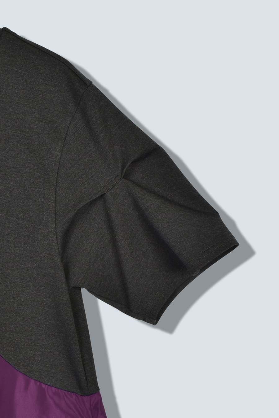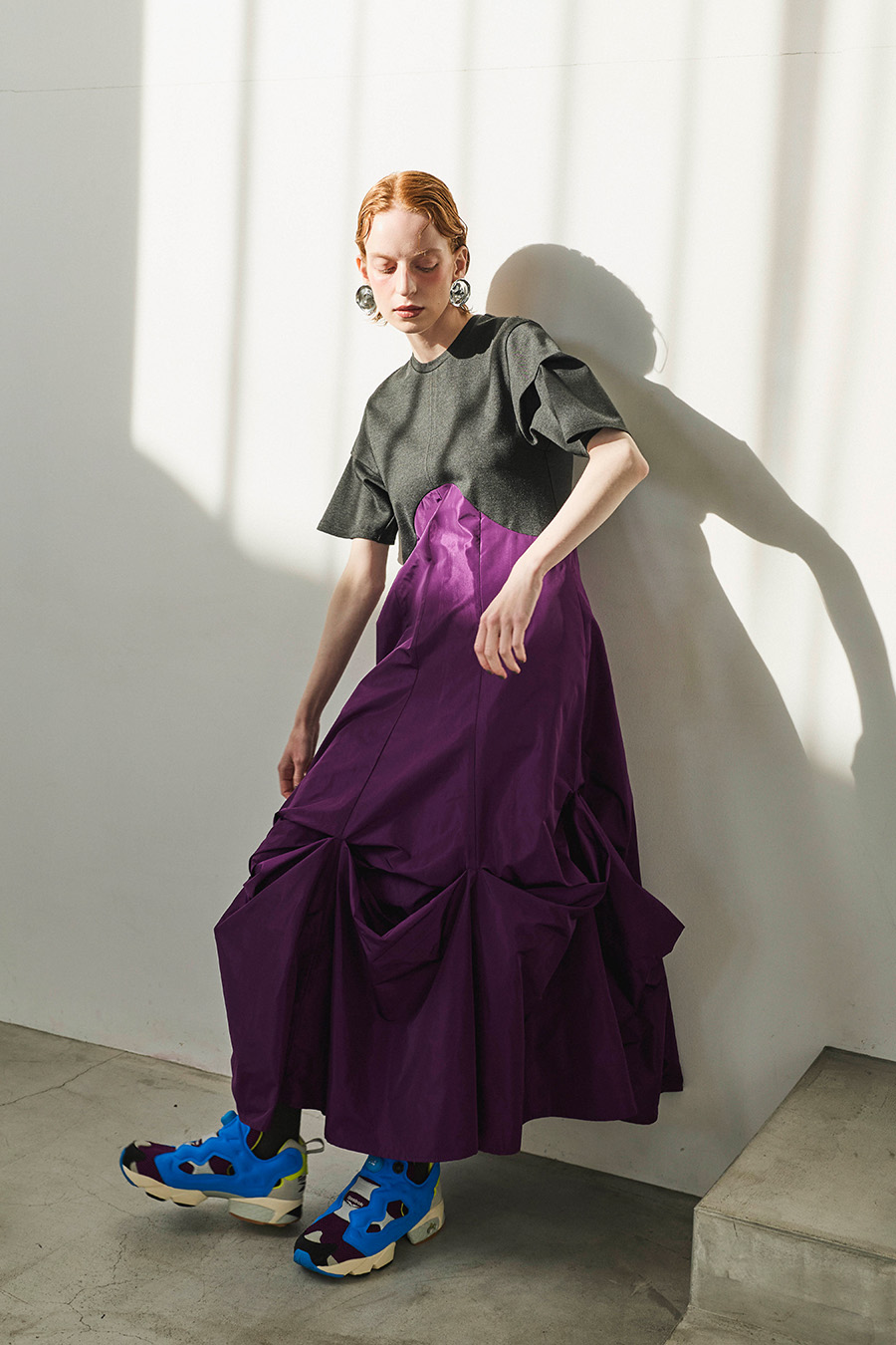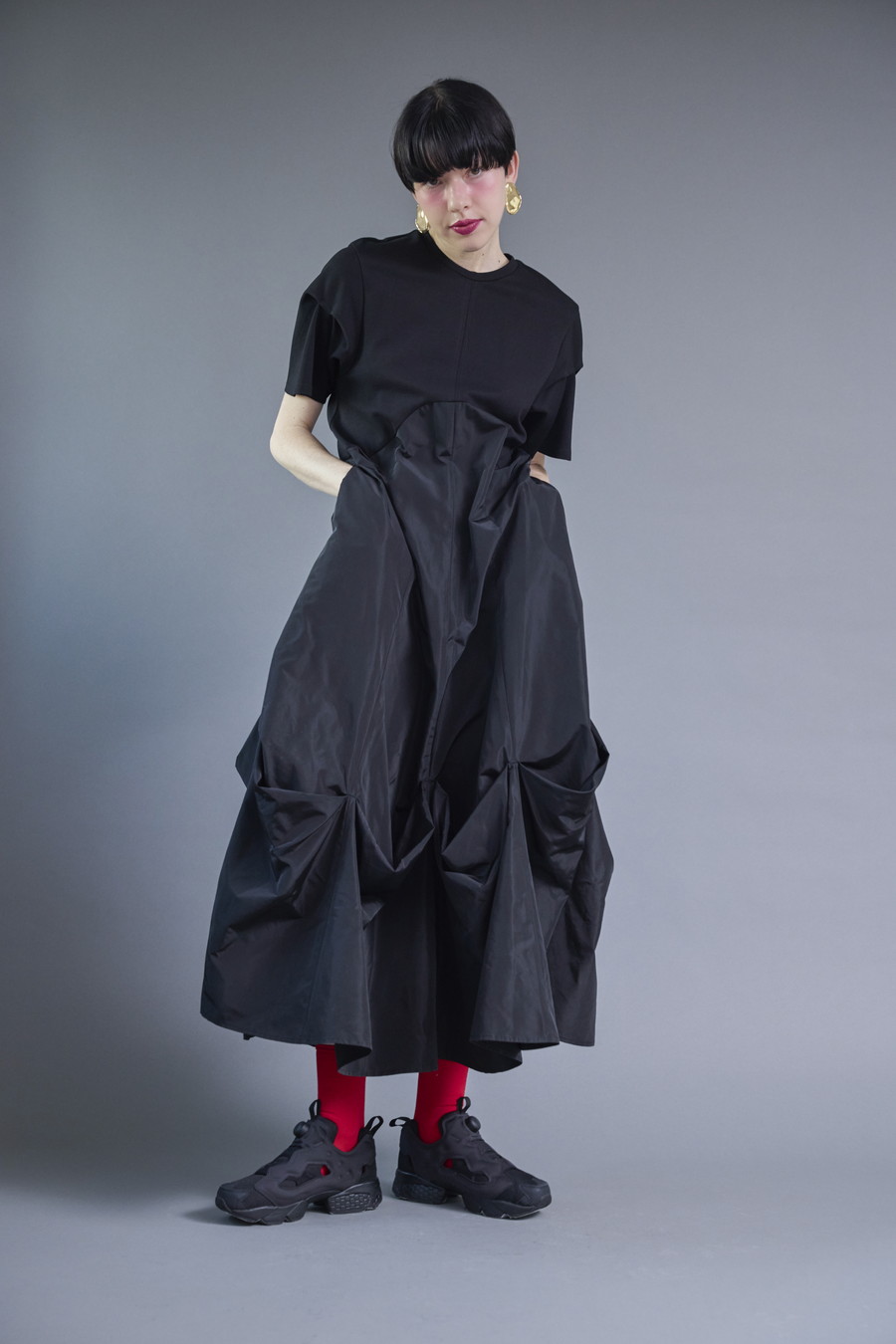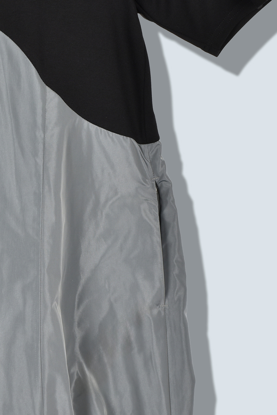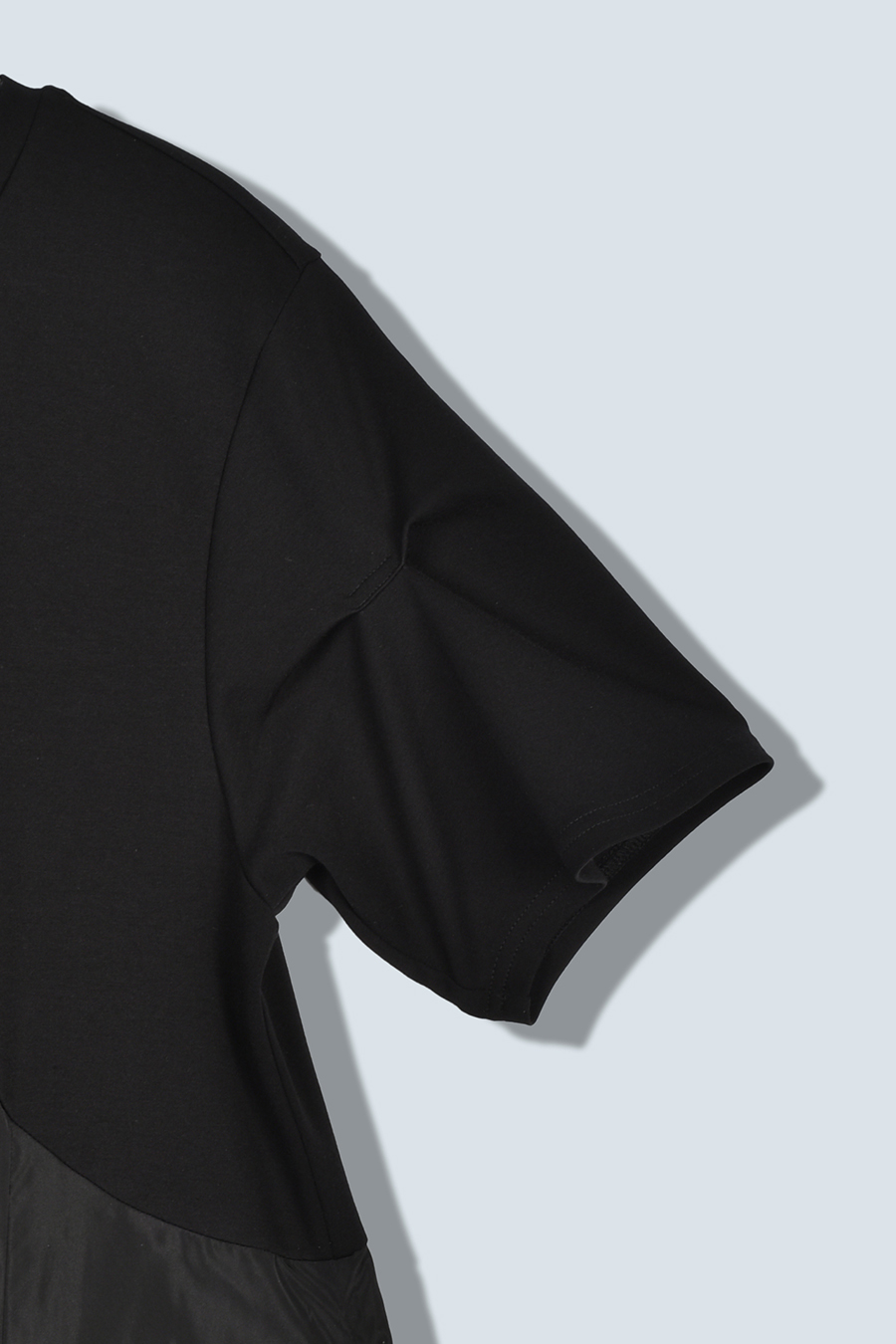 大胆なタックディテールが目を惹くカットソーと布帛のドッキングワンピース。バスト下からは軽くて張りのあるポリエステル素材を使用しており、ボリューム分量はしっかりとありますが着心地が軽く様々な体型の方にも取り入れやすいシルエットに仕上げております。