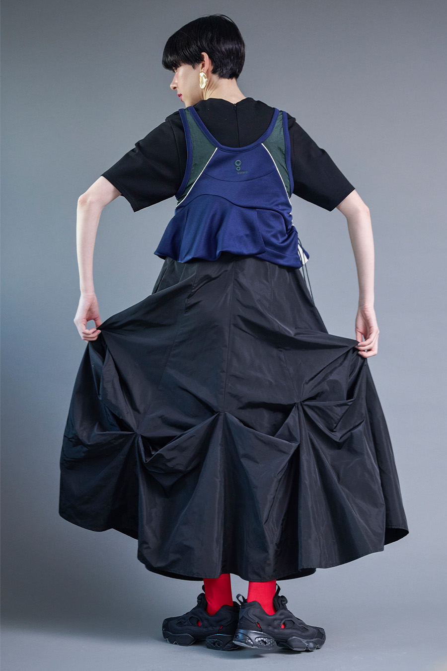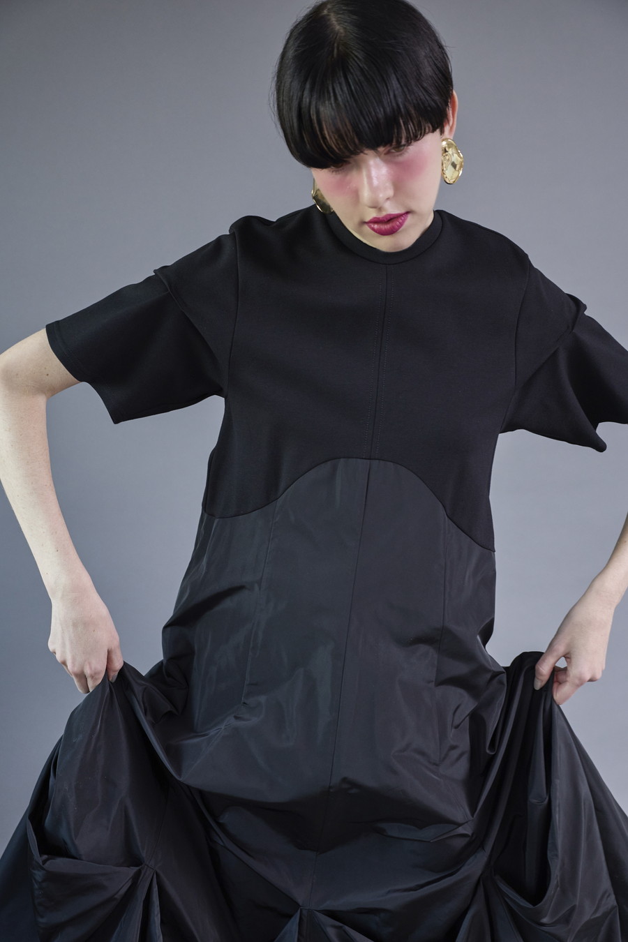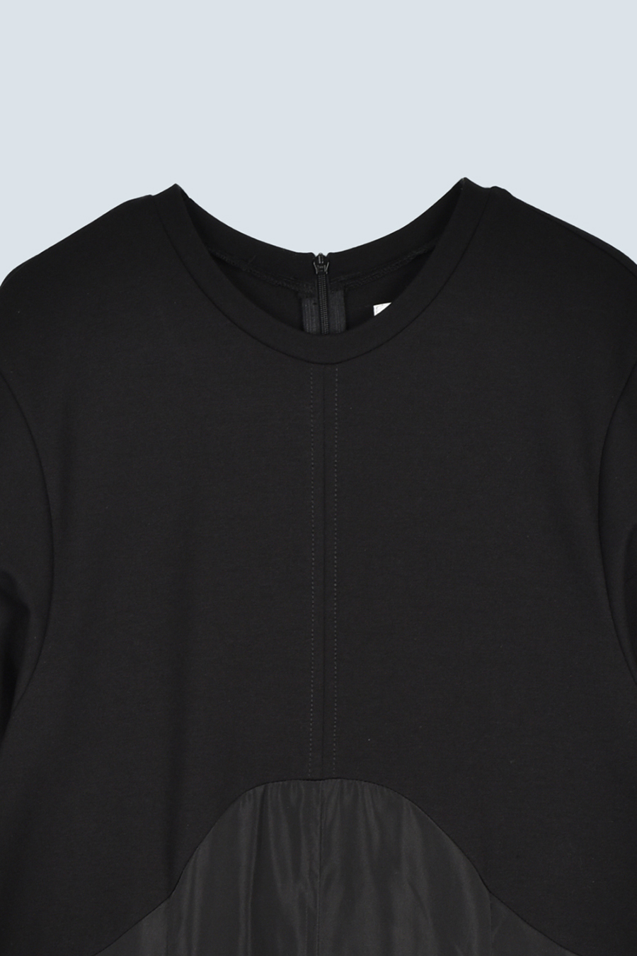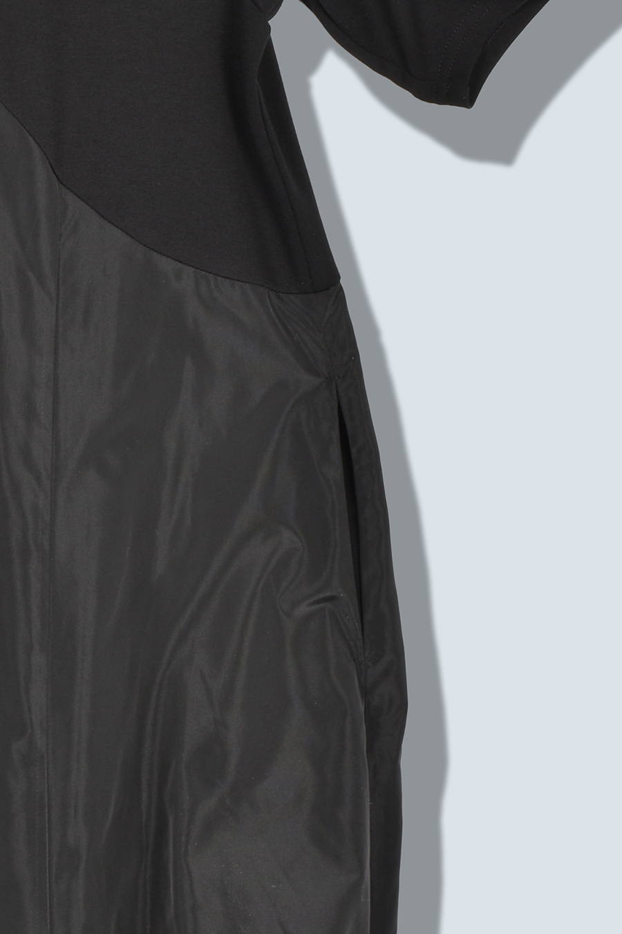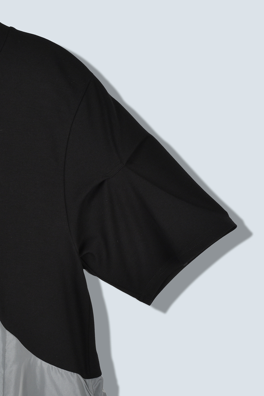 大胆なタックディテールが目を惹くカットソーと布帛のドッキングワンピース。バスト下からは軽くて張りのあるポリエステル素材を使用しており、ボリューム分量はしっかりとありますが着心地が軽く様々な体型の方にも取り入れやすいシルエットに仕上げております。