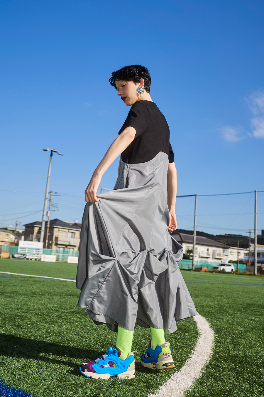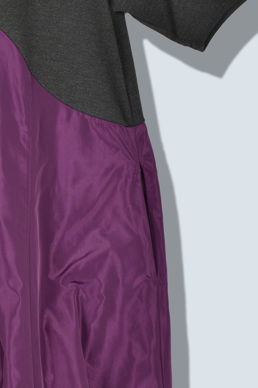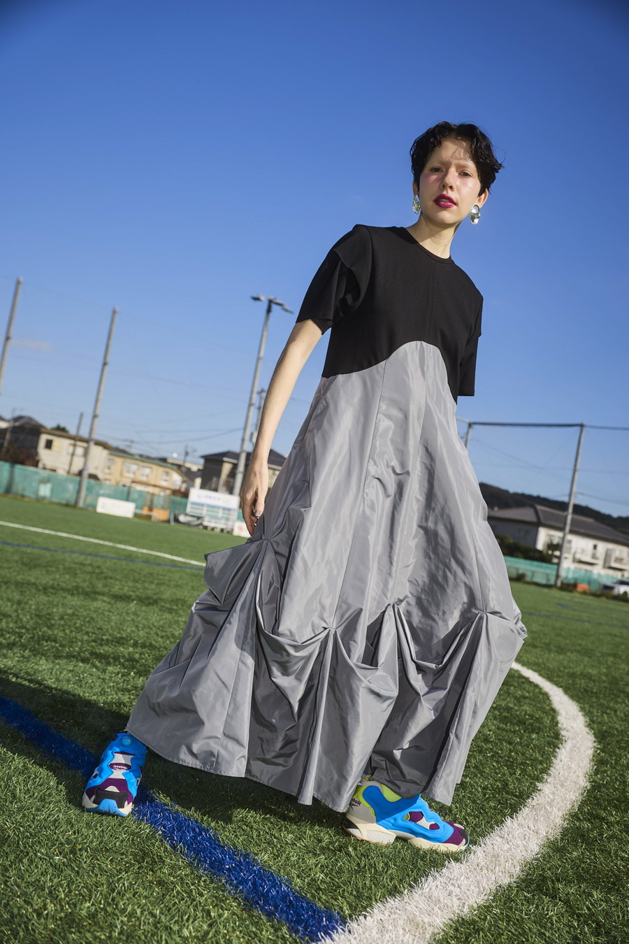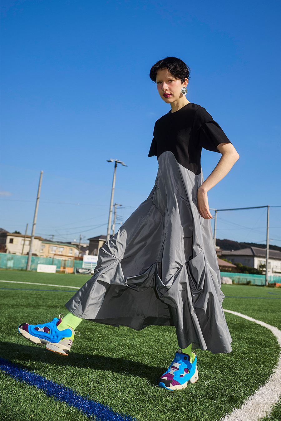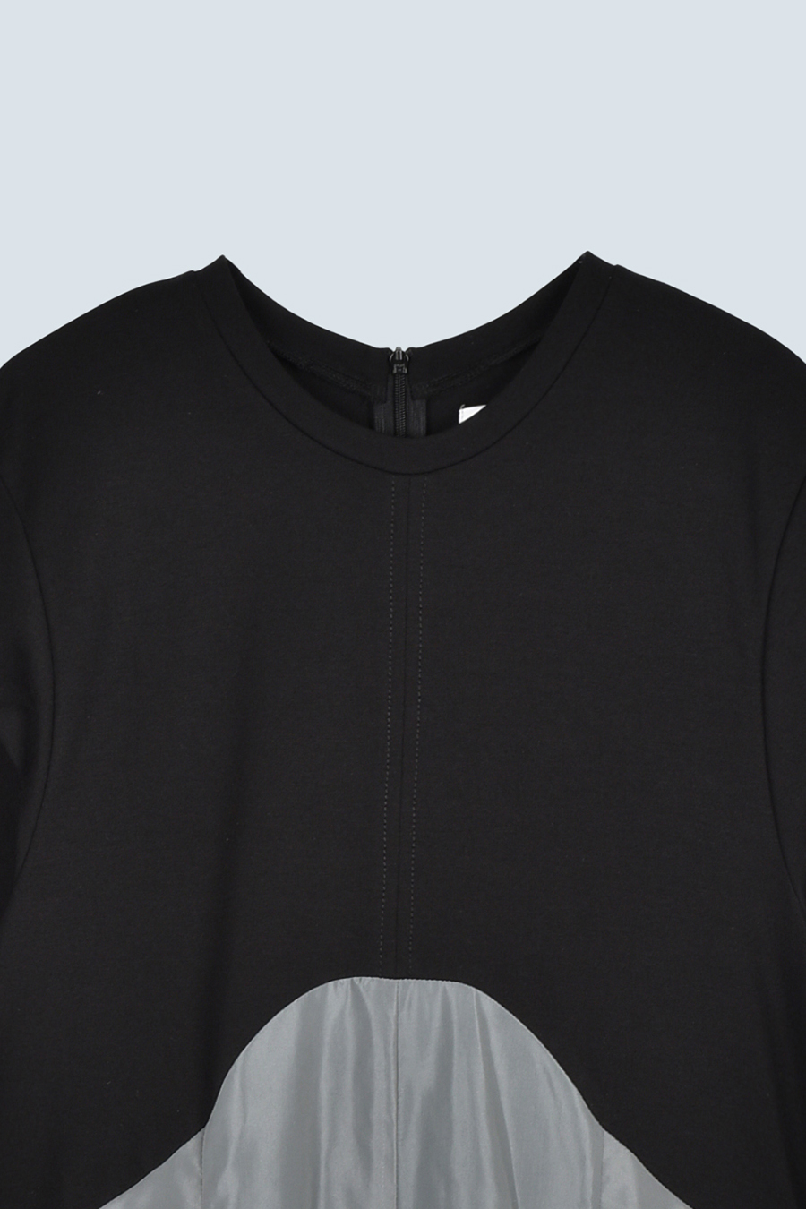 大胆なタックディテールが目を惹くカットソーと布帛のドッキングワンピース。バスト下からは軽くて張りのあるポリエステル素材を使用しており、ボリューム分量はしっかりとありますが着心地が軽く様々な体型の方にも取り入れやすいシルエットに仕上げております。