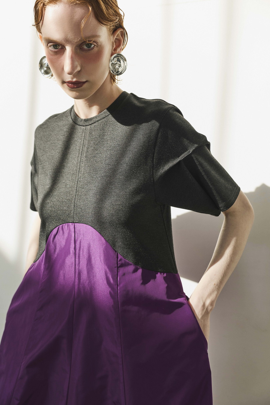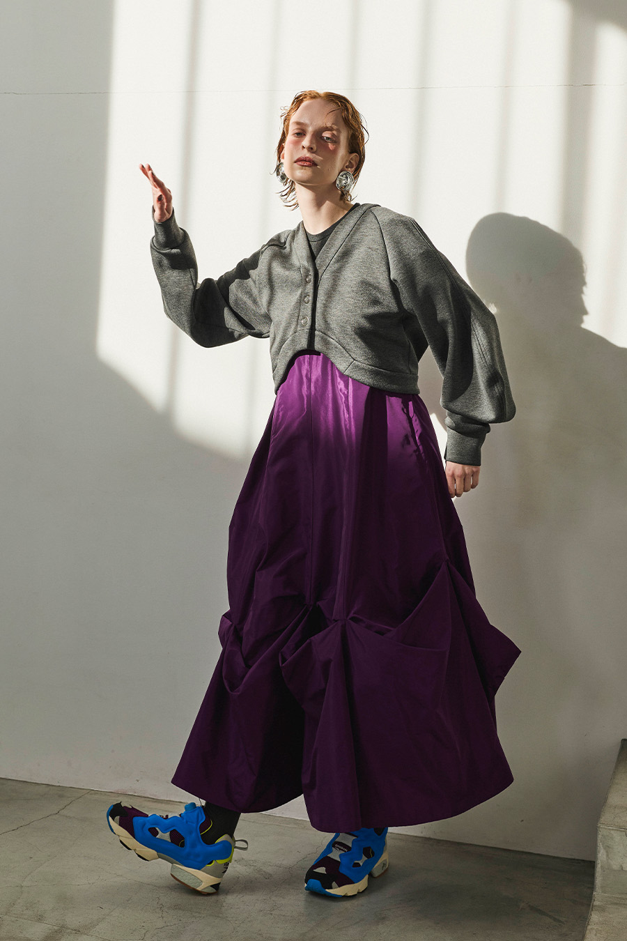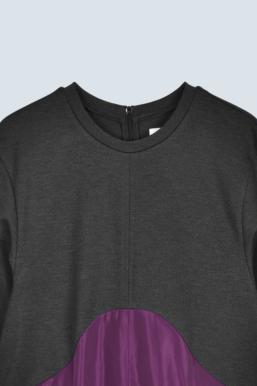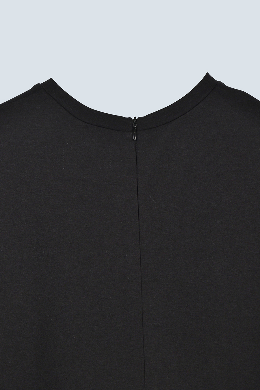 大胆なタックディテールが目を惹くカットソーと布帛のドッキングワンピース。バスト下からは軽くて張りのあるポリエステル素材を使用しており、ボリューム分量はしっかりとありますが着心地が軽く様々な体型の方にも取り入れやすいシルエットに仕上げております。