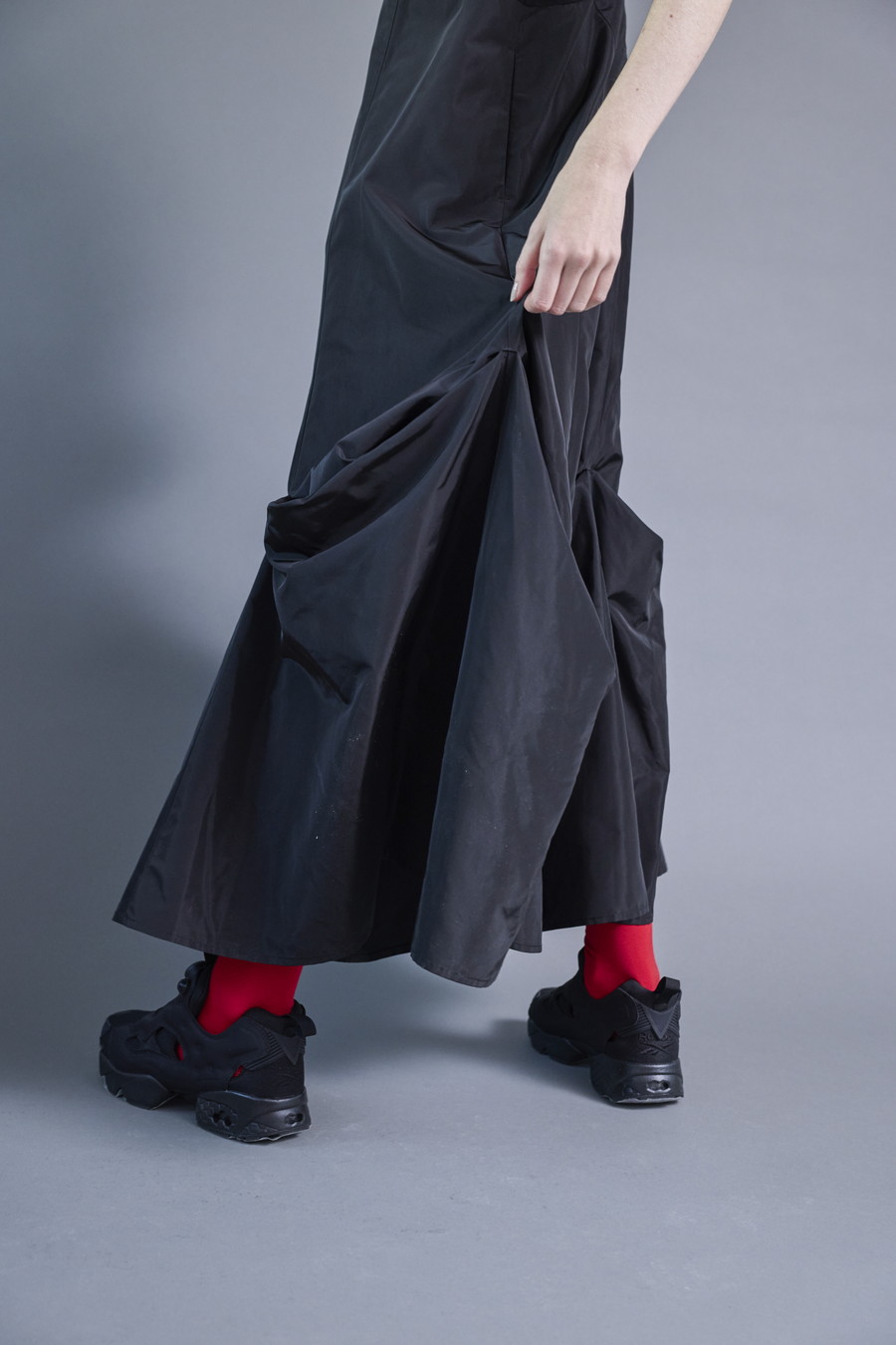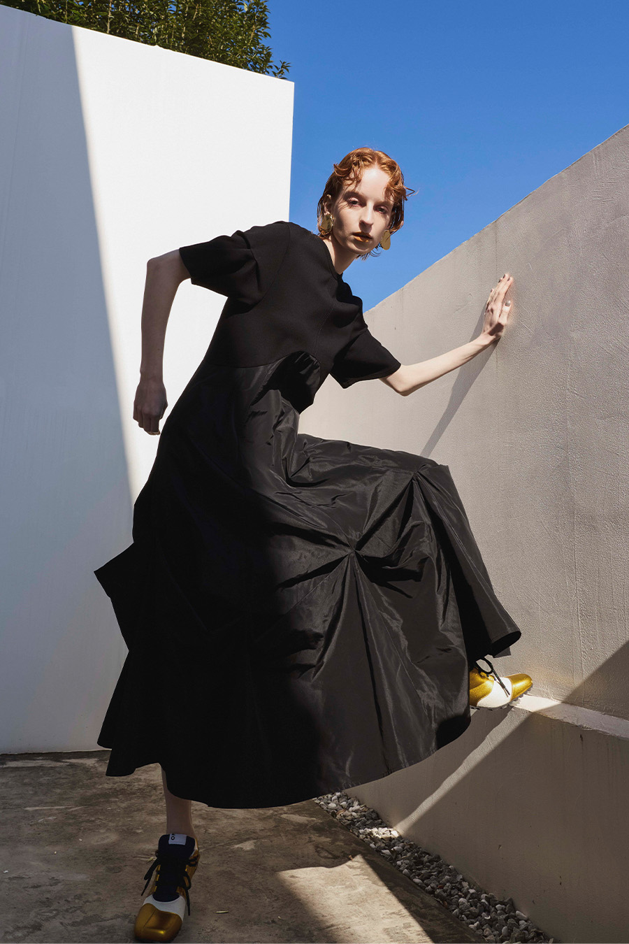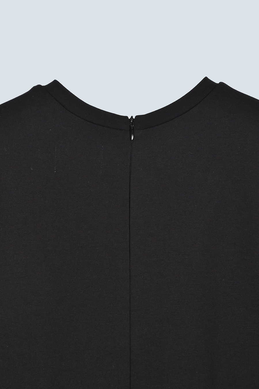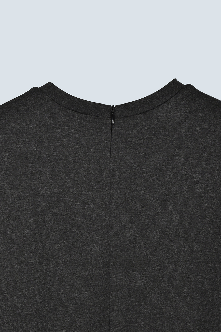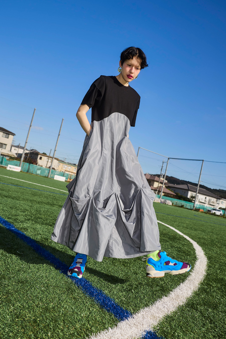大胆なタックディテールが目を惹くカットソーと布帛のドッキングワンピース。バスト下からは軽くて張りのあるポリエステル素材を使用しており、ボリューム分量はしっかりとありますが着心地が軽く様々な体型の方にも取り入れやすいシルエットに仕上げております。