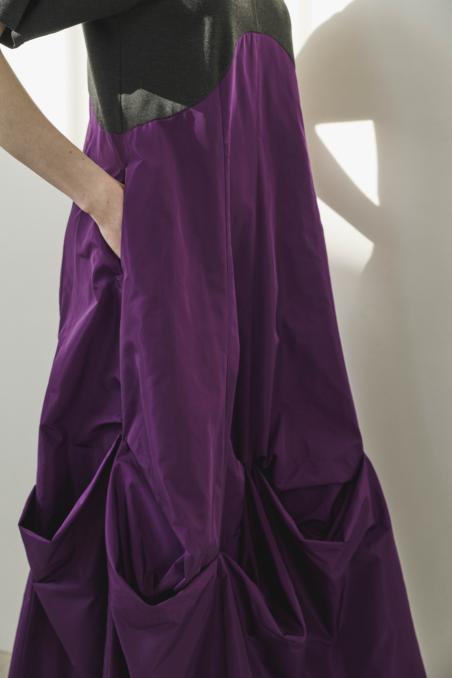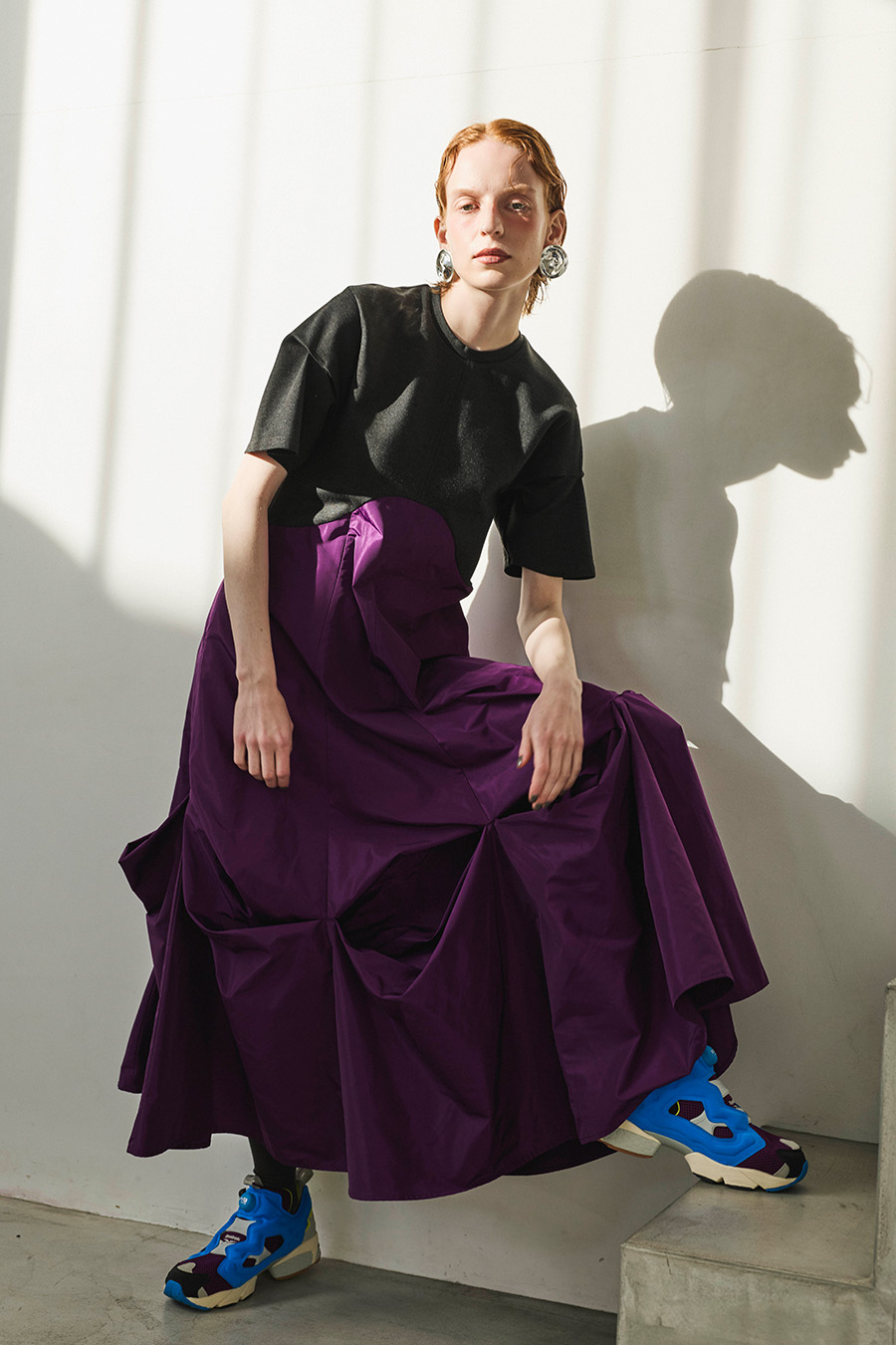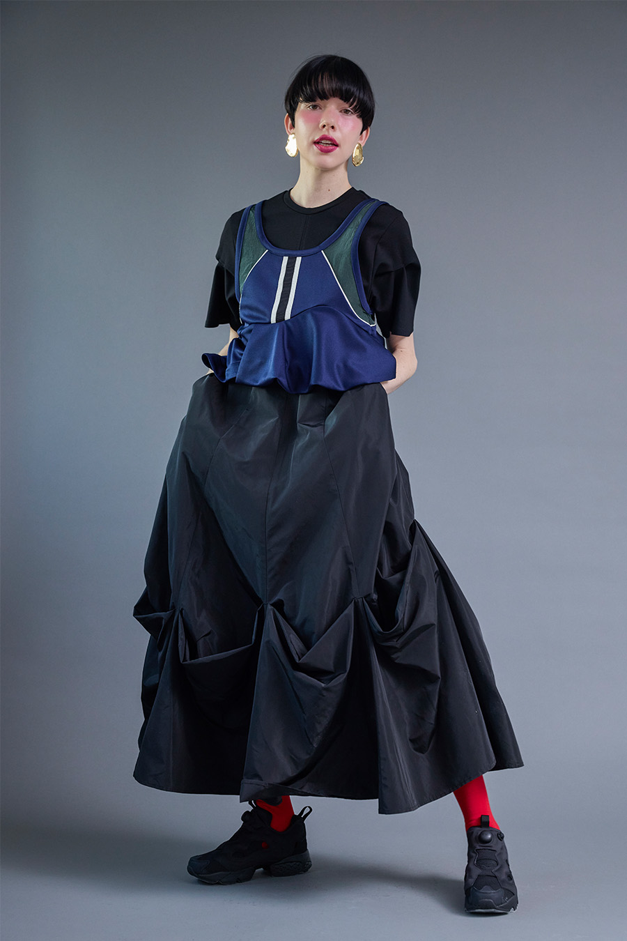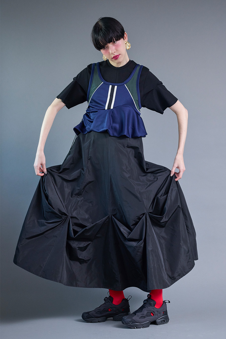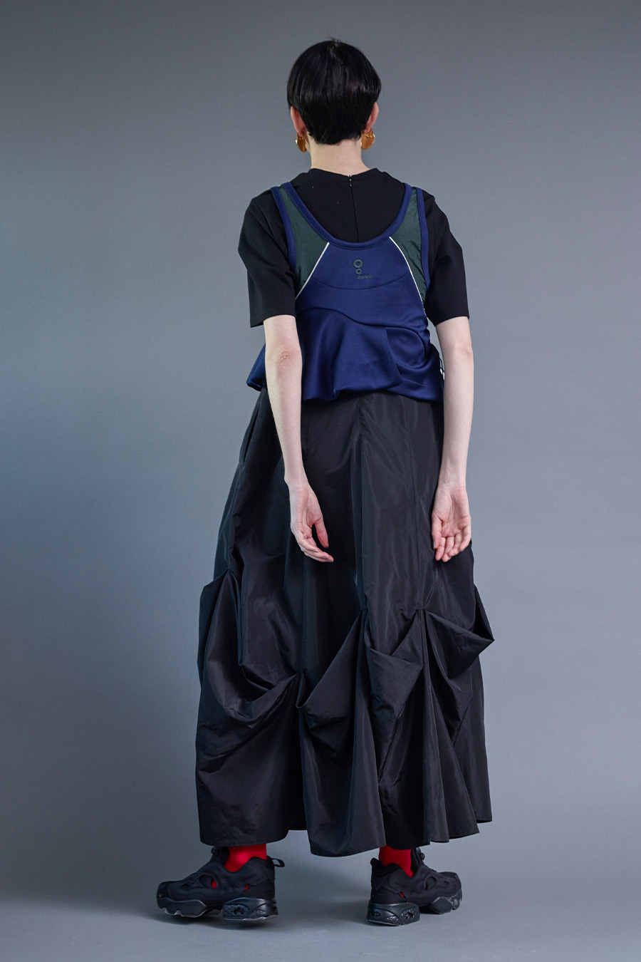 大胆なタックディテールが目を惹くカットソーと布帛のドッキングワンピース。バスト下からは軽くて張りのあるポリエステル素材を使用しており、ボリューム分量はしっかりとありますが着心地が軽く様々な体型の方にも取り入れやすいシルエットに仕上げております。