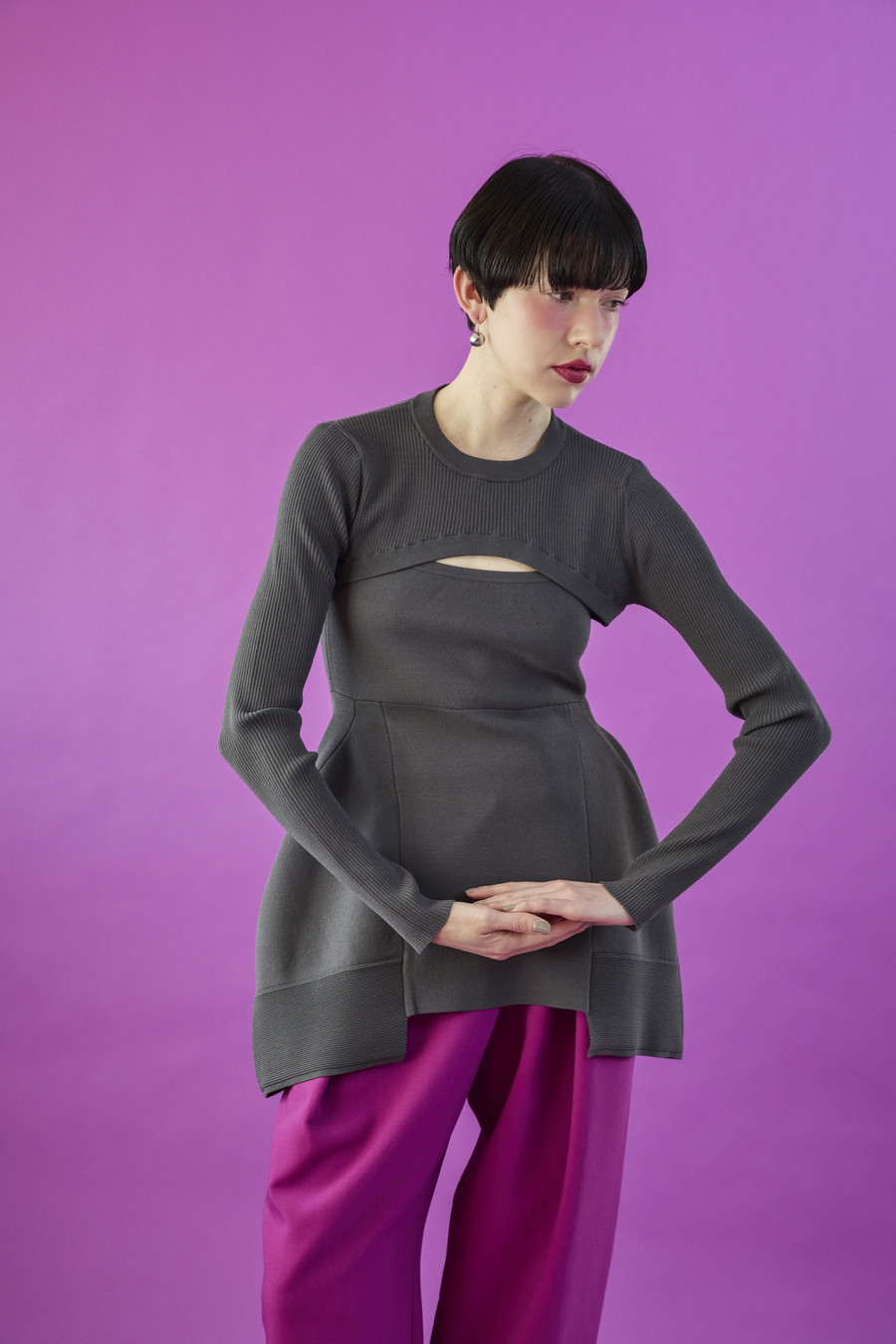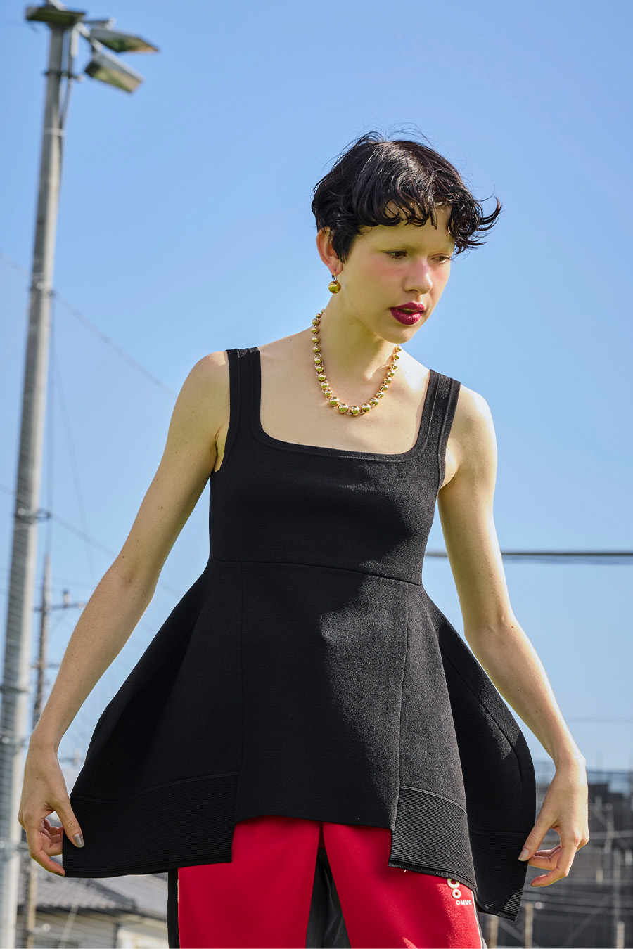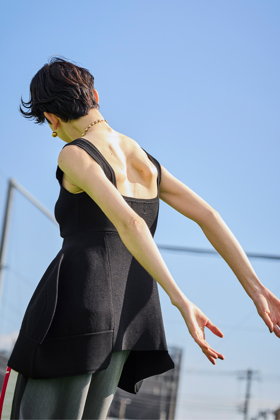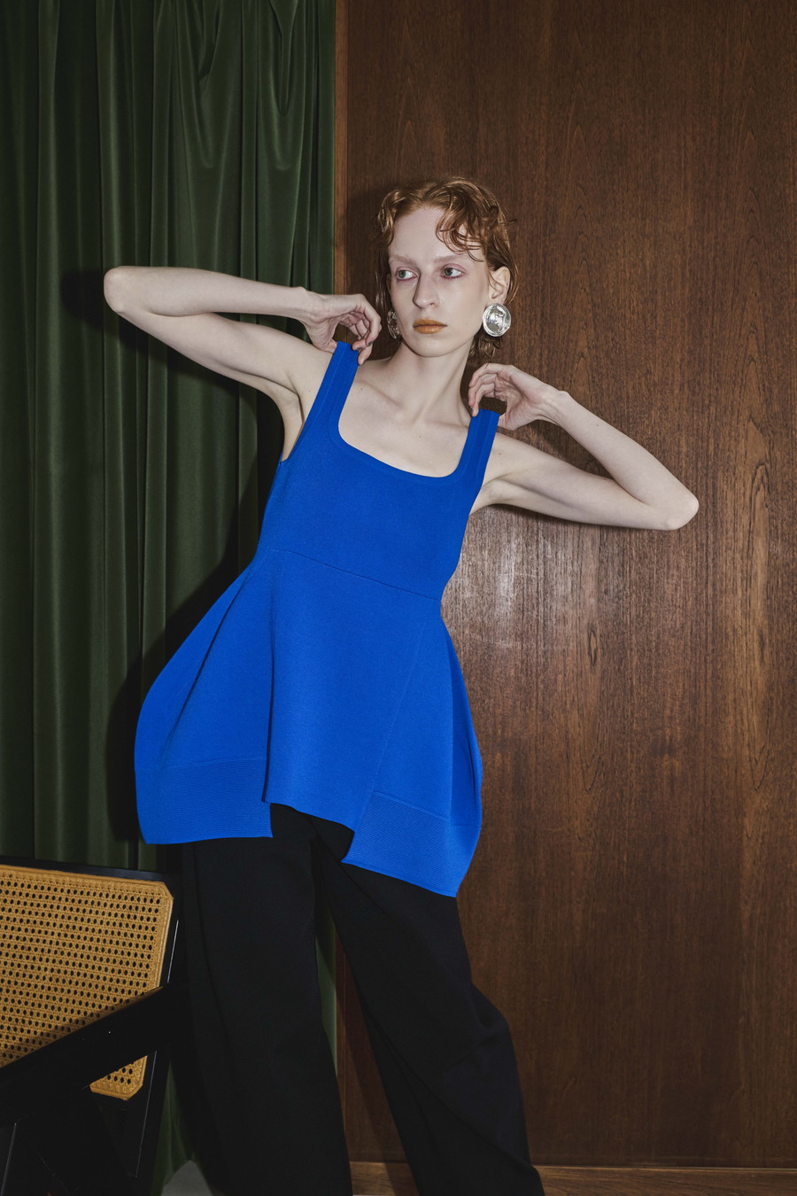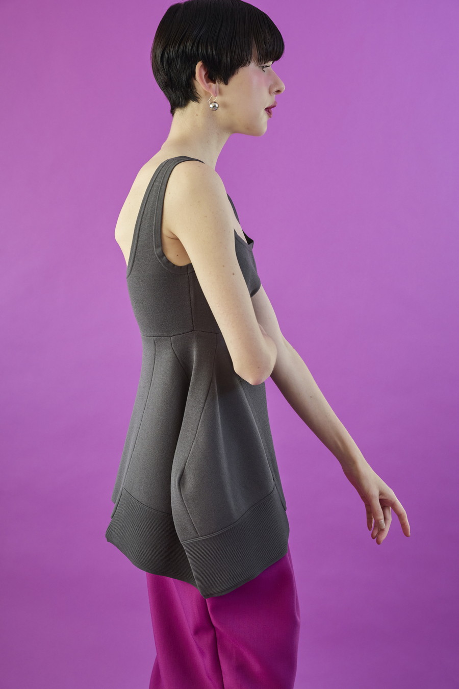 スクエアネックがデコルテを美しく魅せてくれる構築的なシルエットのニットタンクと、マイクロ丈のニットトップスのアンサンブルSET。バストからウエスト部分まではタイトなシルエットで女性らしい雰囲気に。