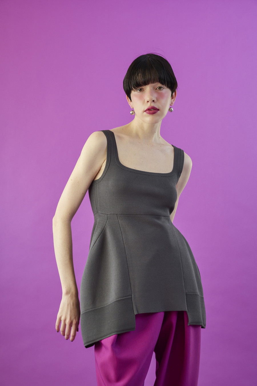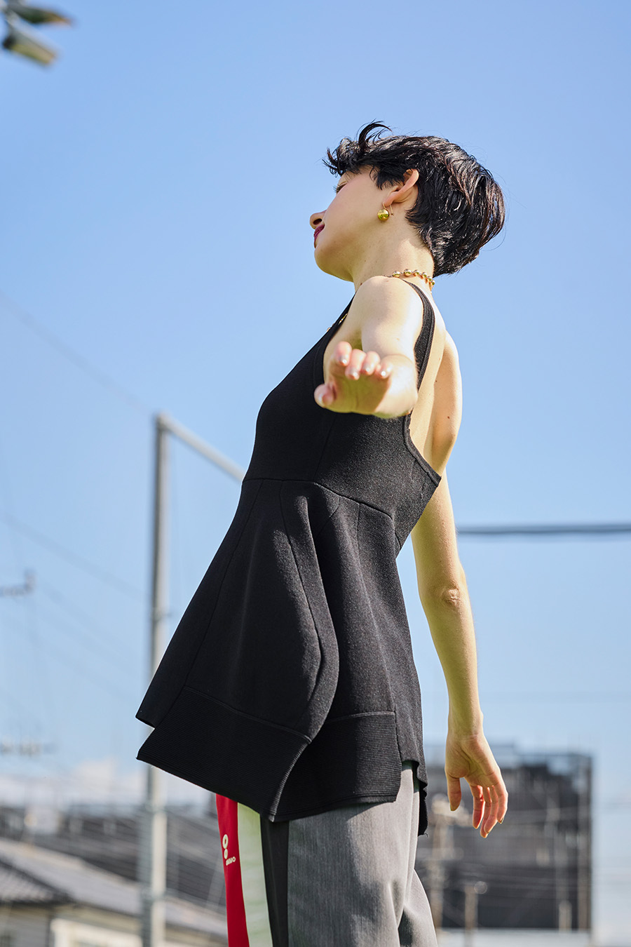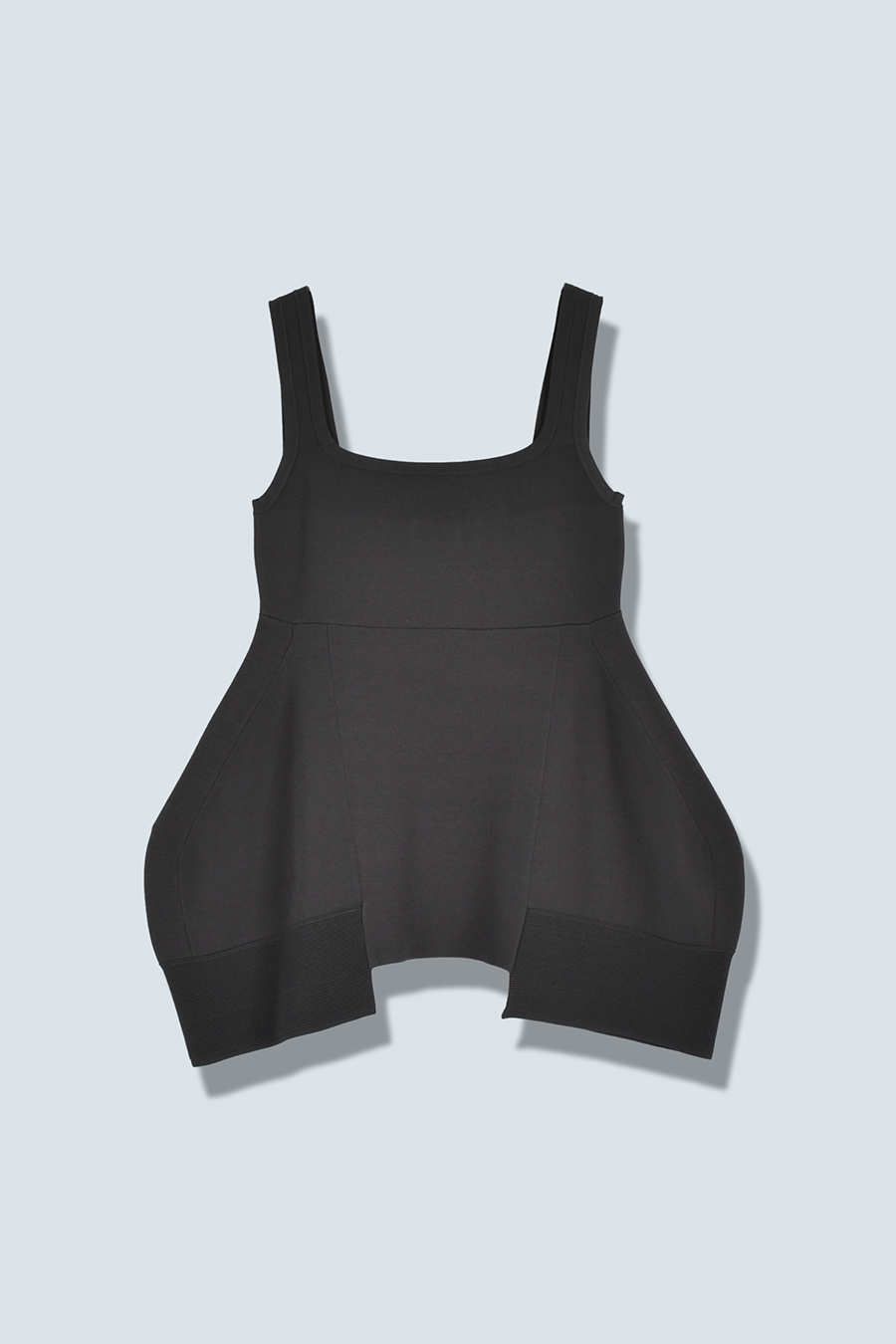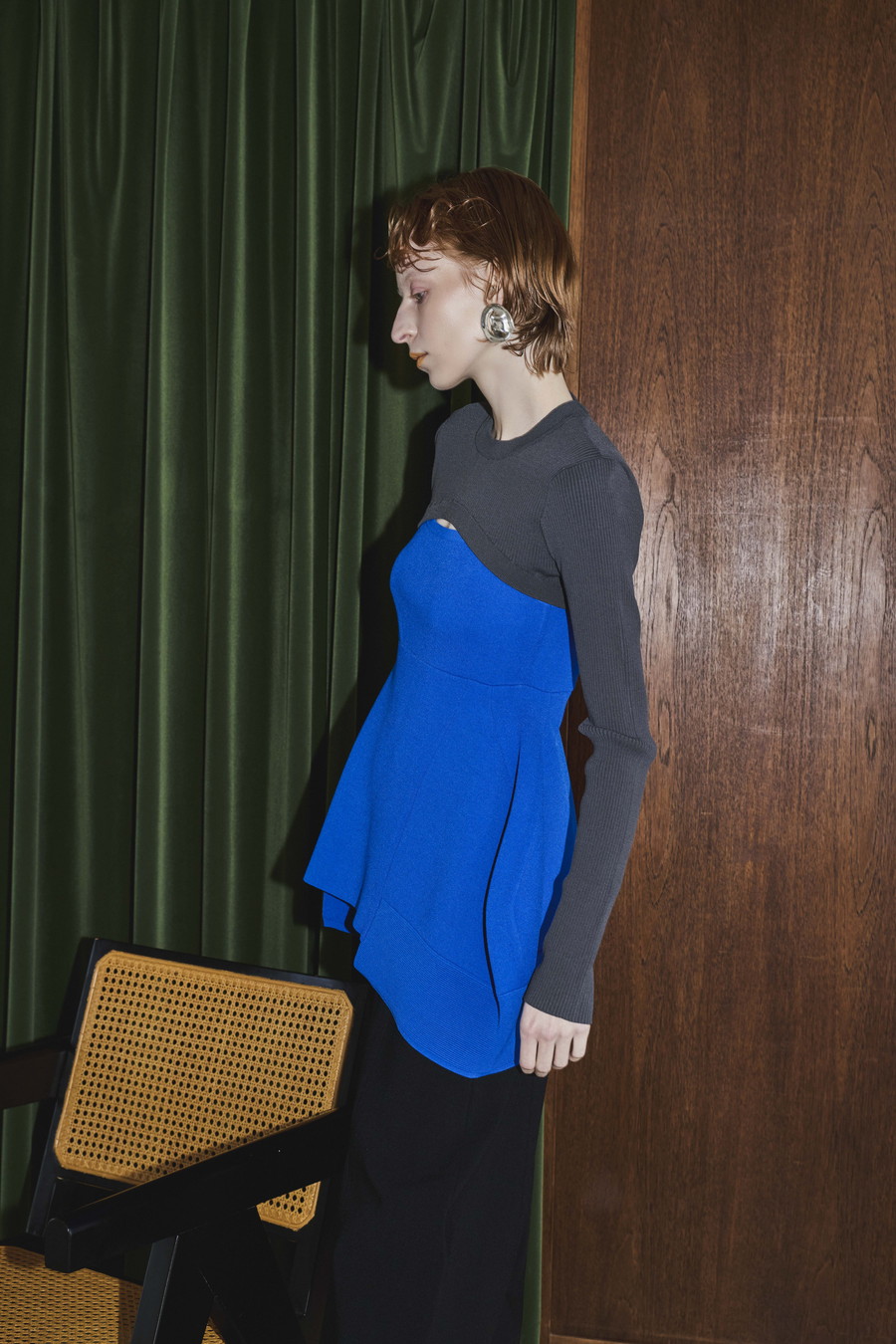 スクエアネックがデコルテを美しく魅せてくれる構築的なシルエットのニットタンクと、マイクロ丈のニットトップスのアンサンブルSET。バストからウエスト部分まではタイトなシルエットで女性らしい雰囲気に。