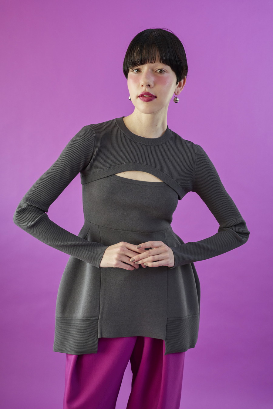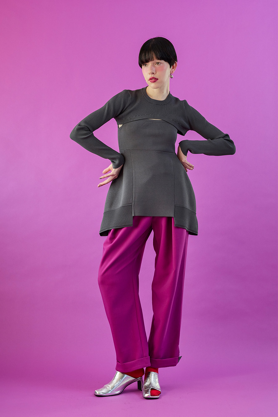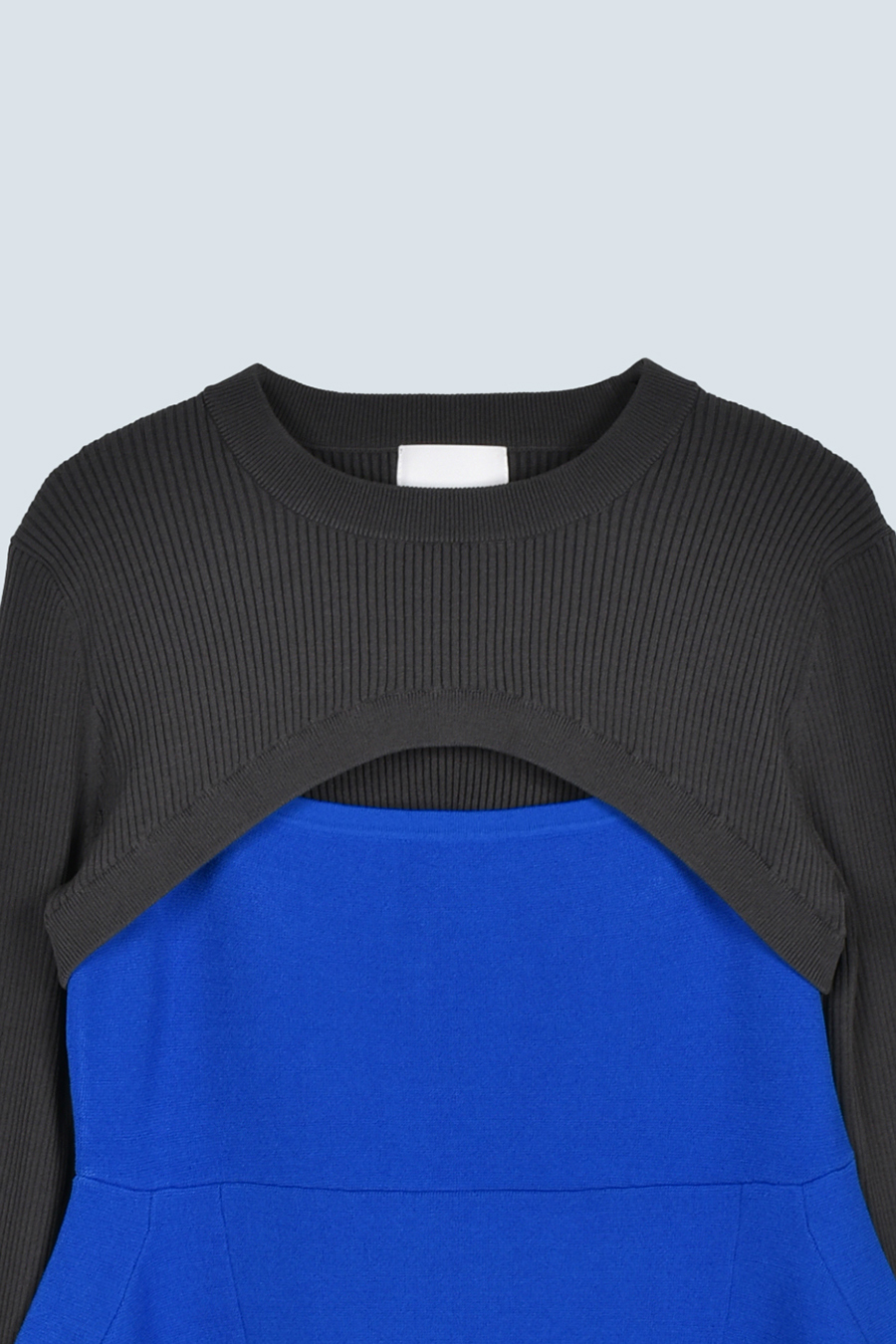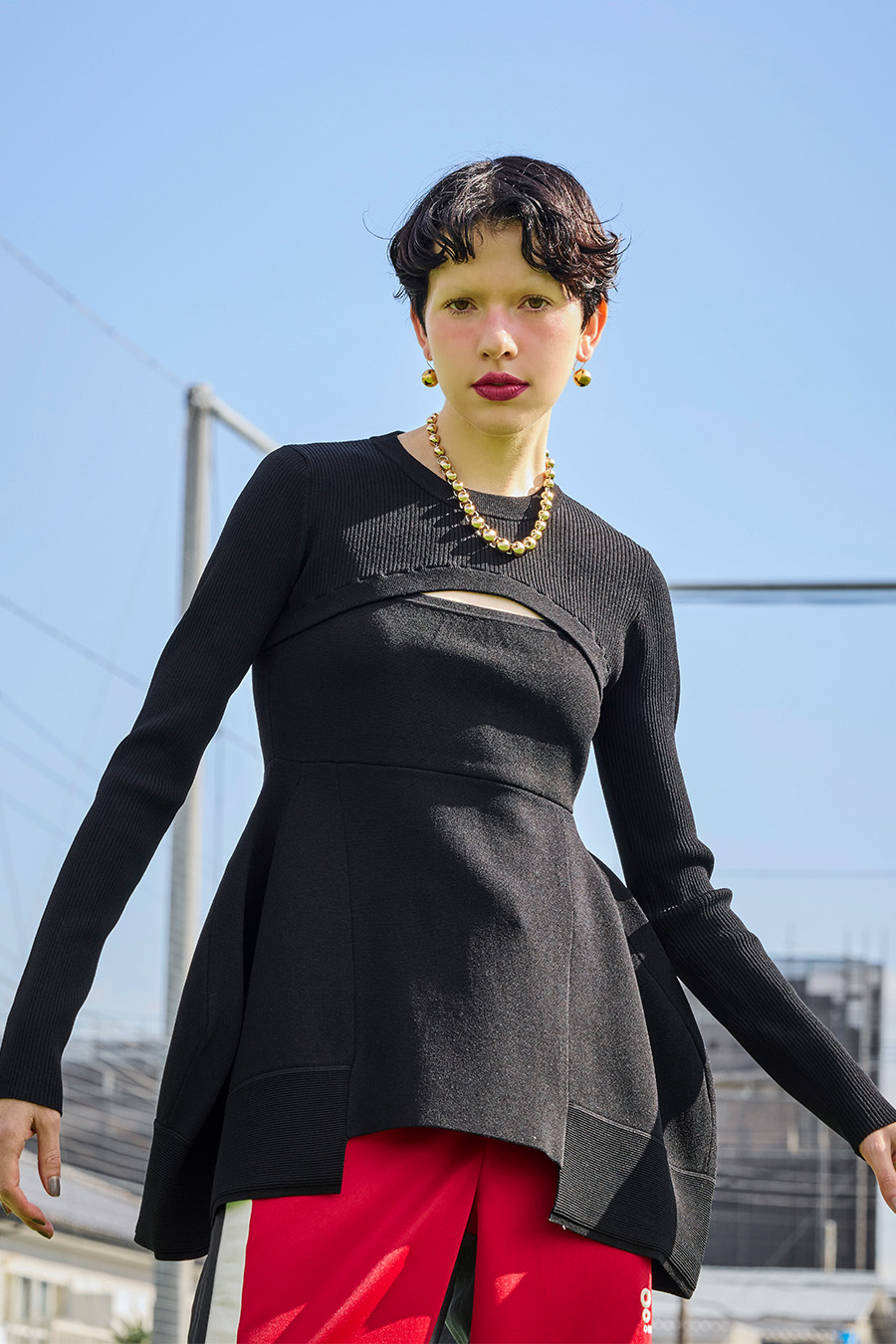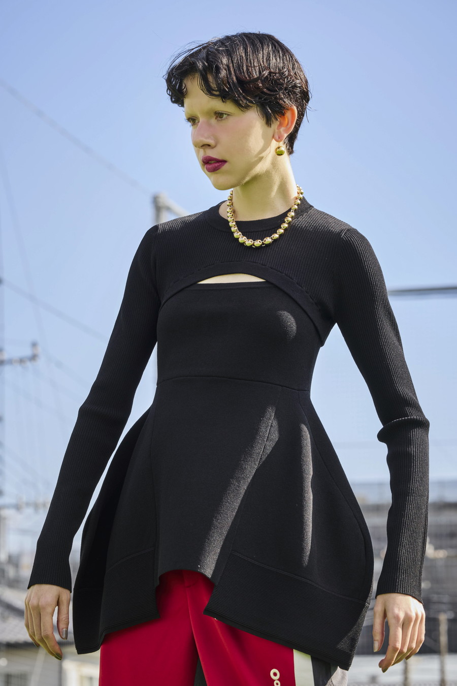 スクエアネックがデコルテを美しく魅せてくれる構築的なシルエットのニットタンクと、マイクロ丈のニットトップスのアンサンブルSET。バストからウエスト部分まではタイトなシルエットで女性らしい雰囲気に。