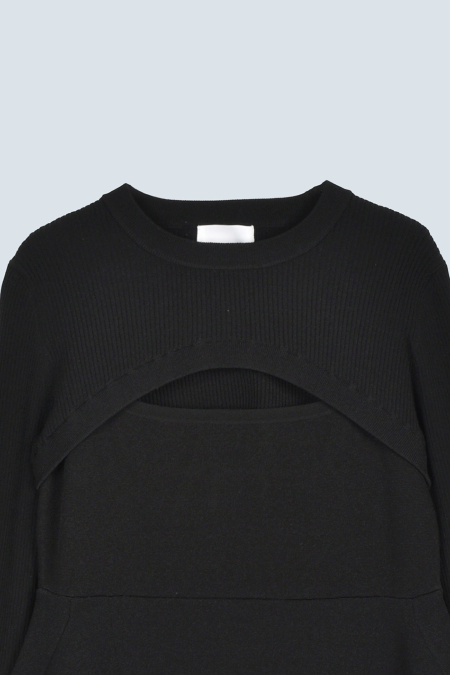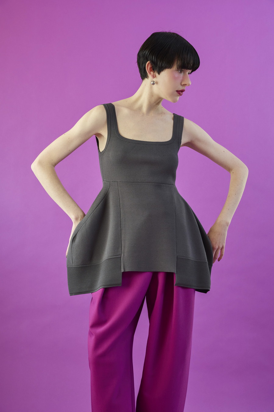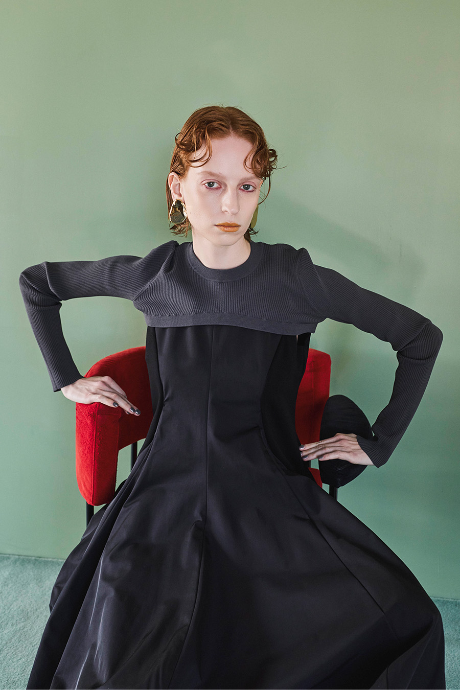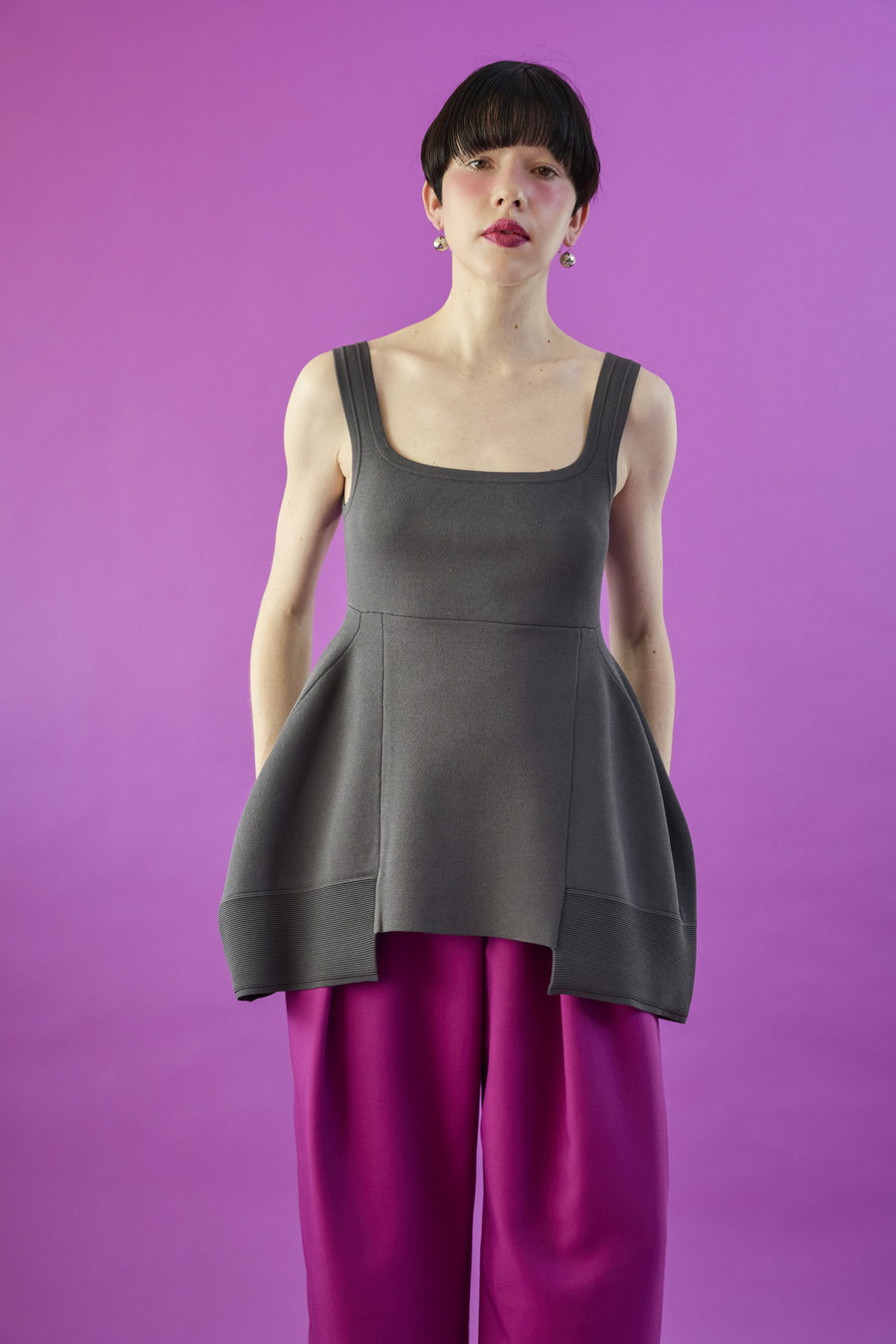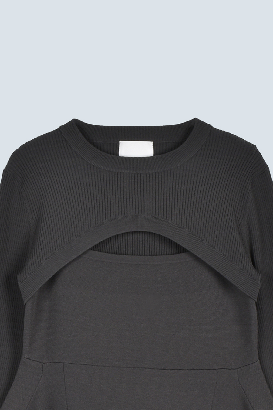 スクエアネックがデコルテを美しく魅せてくれる構築的なシルエットのニットタンクと、マイクロ丈のニットトップスのアンサンブルSET。バストからウエスト部分まではタイトなシルエットで女性らしい雰囲気に。