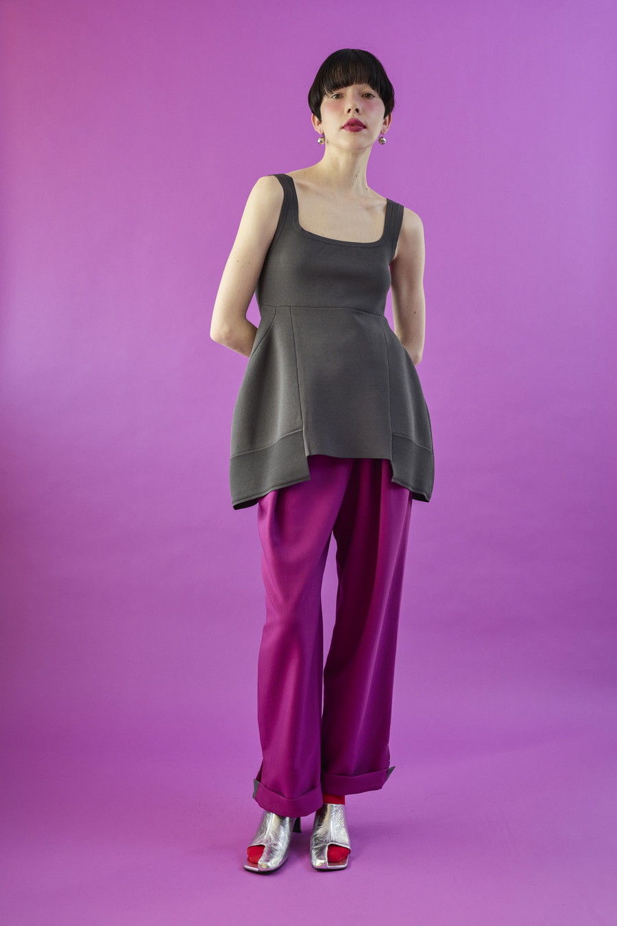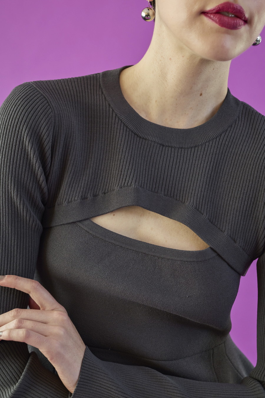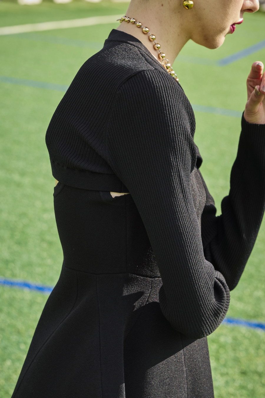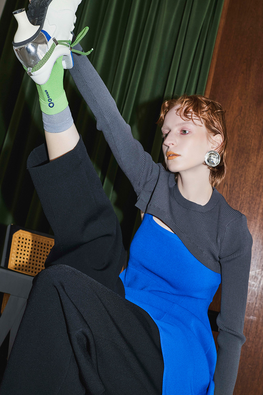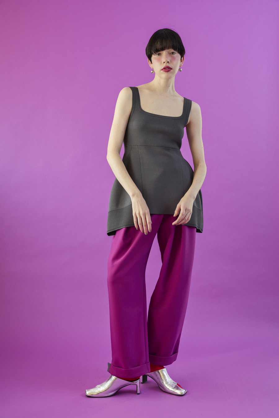 スクエアネックがデコルテを美しく魅せてくれる構築的なシルエットのニットタンクと、マイクロ丈のニットトップスのアンサンブルSET。バストからウエスト部分まではタイトなシルエットで女性らしい雰囲気に。