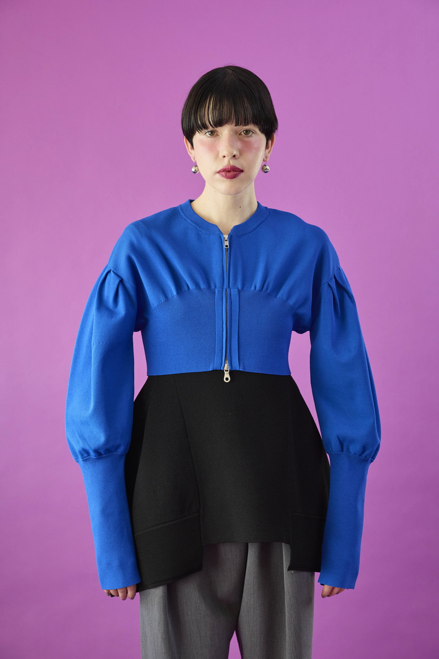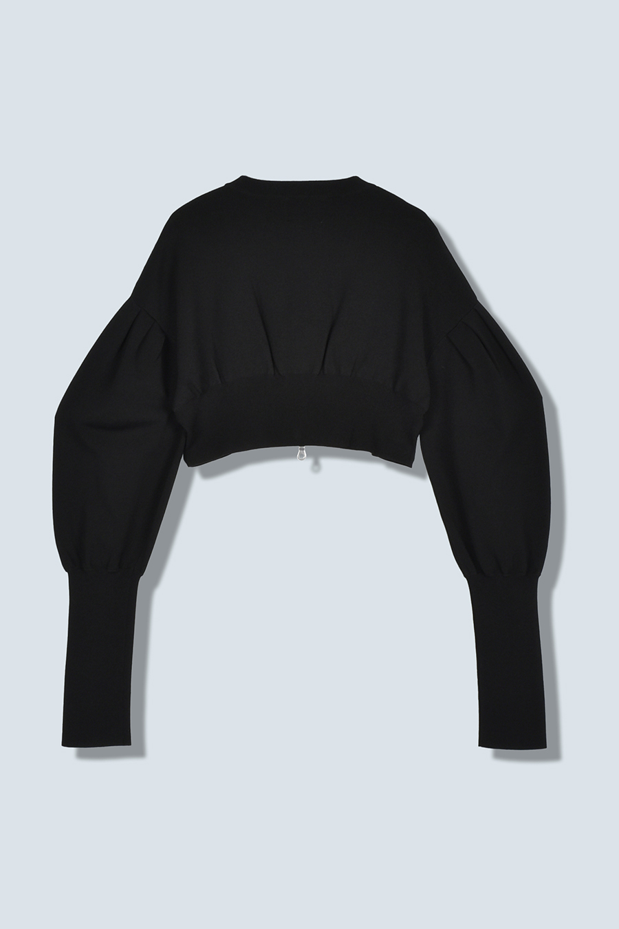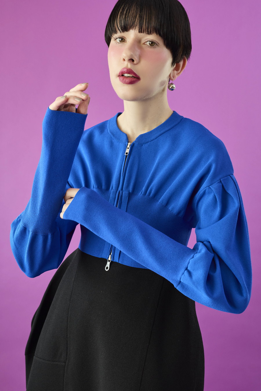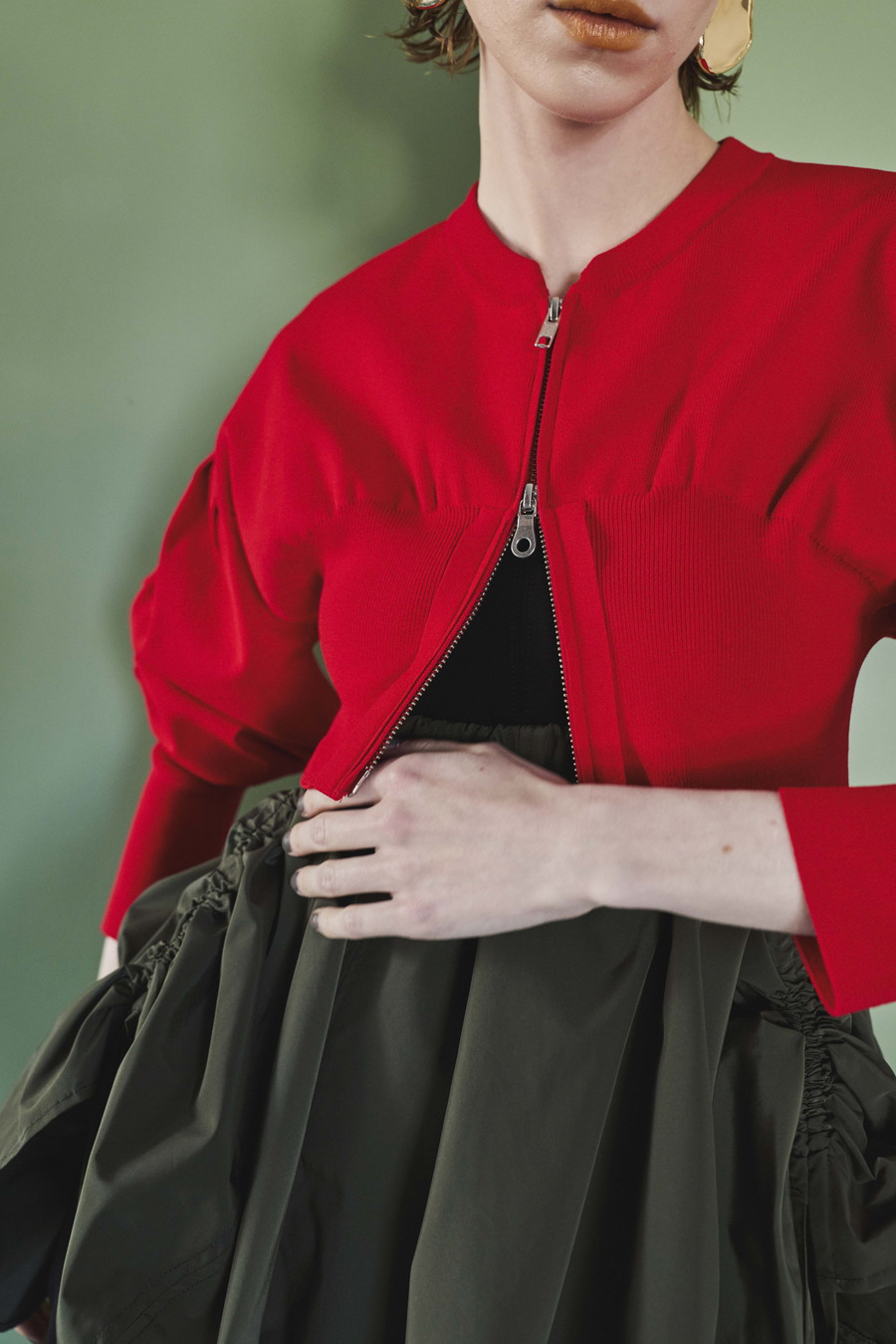 ボリュームスリーブが印象的なショート丈のジップアップニットカーディガン。ワンピースやトップスとのレイヤードで季節の変わり目にも取り入れやすい一枚です。