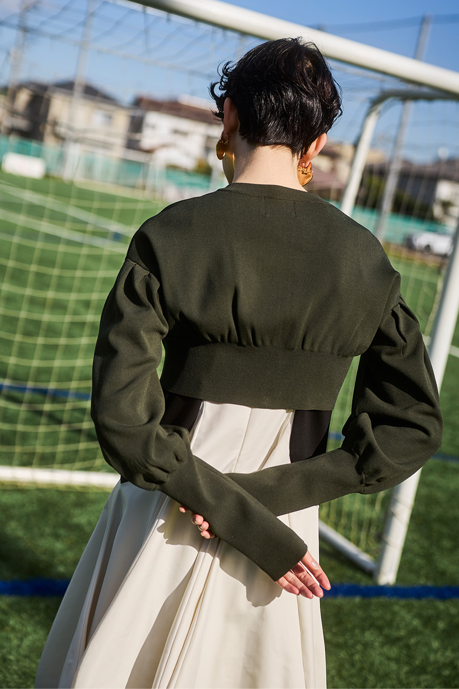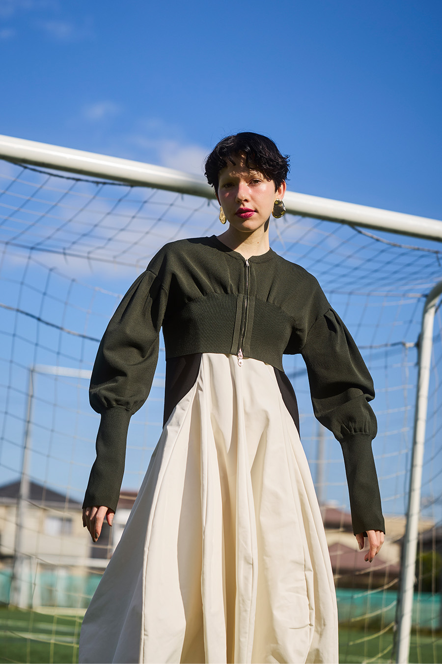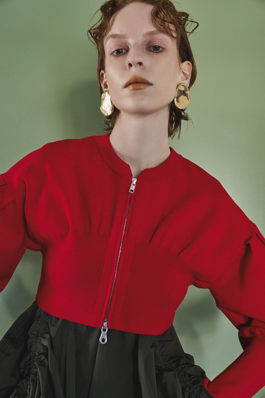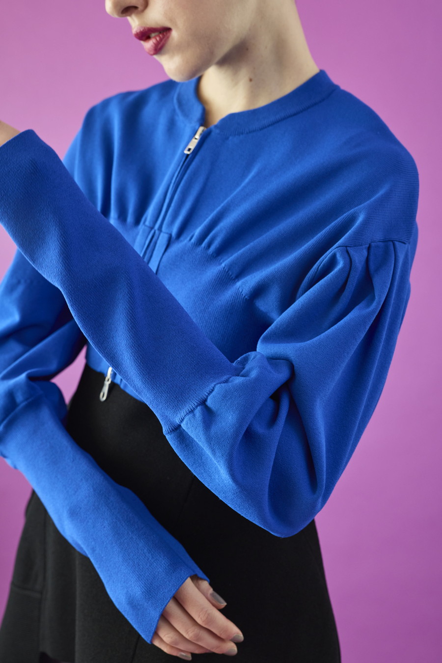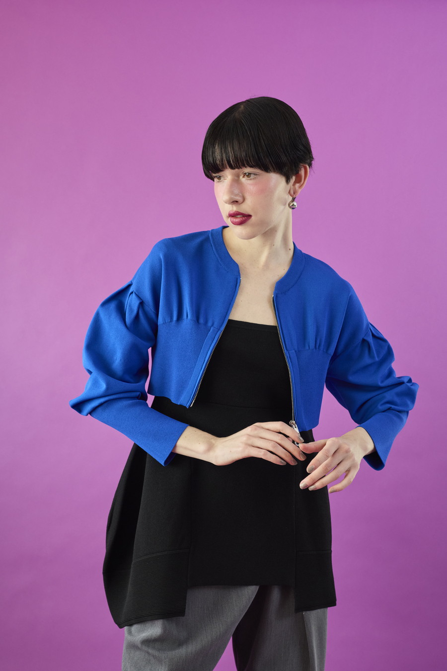 ボリュームスリーブが印象的なショート丈のジップアップニットカーディガン。ワンピースやトップスとのレイヤードで季節の変わり目にも取り入れやすい一枚です。