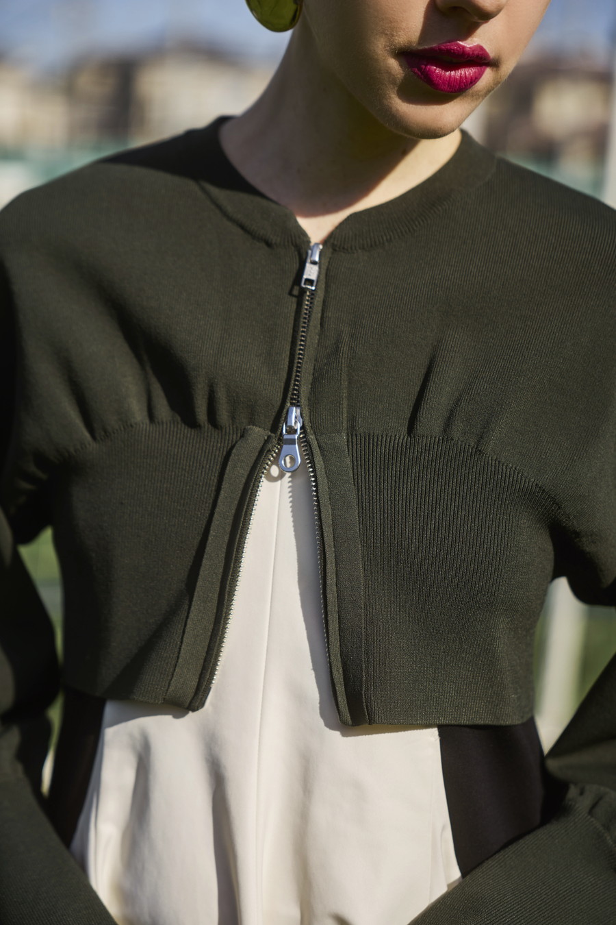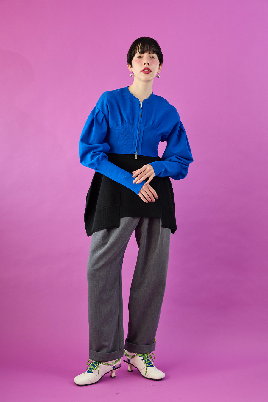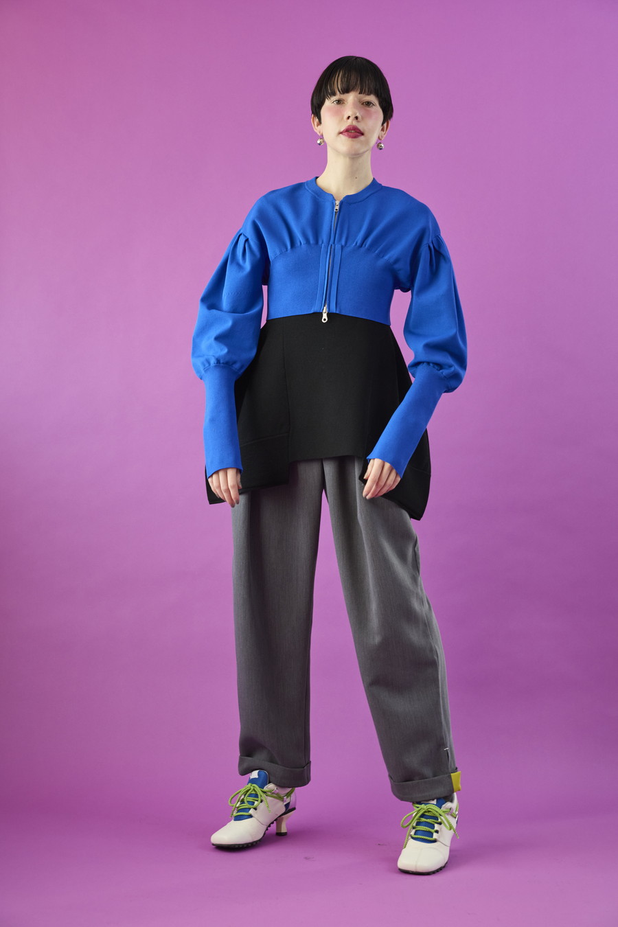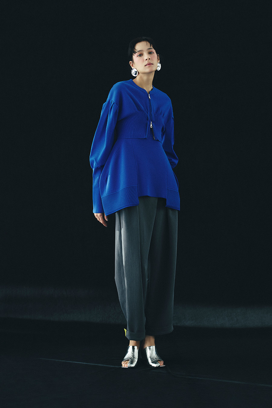 ボリュームスリーブが印象的なショート丈のジップアップニットカーディガン。ワンピースやトップスとのレイヤードで季節の変わり目にも取り入れやすい一枚です。