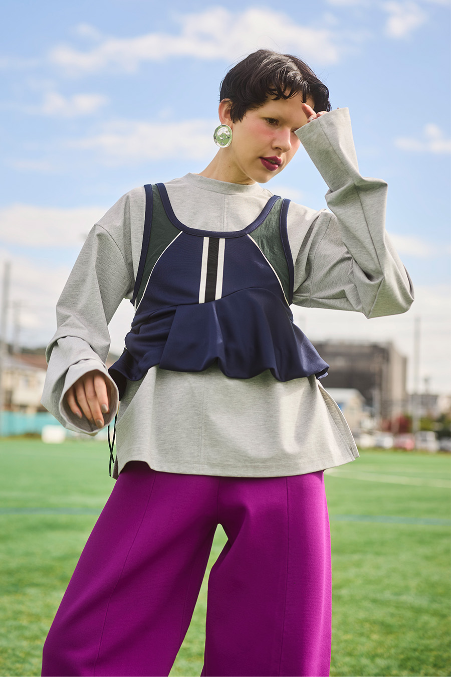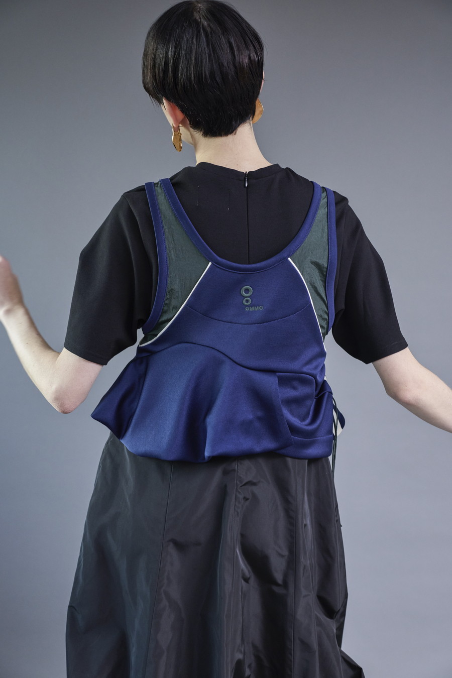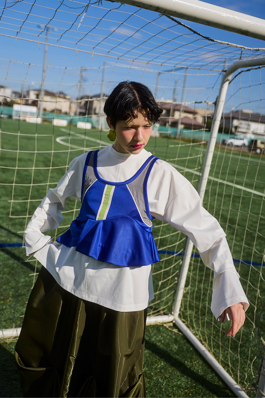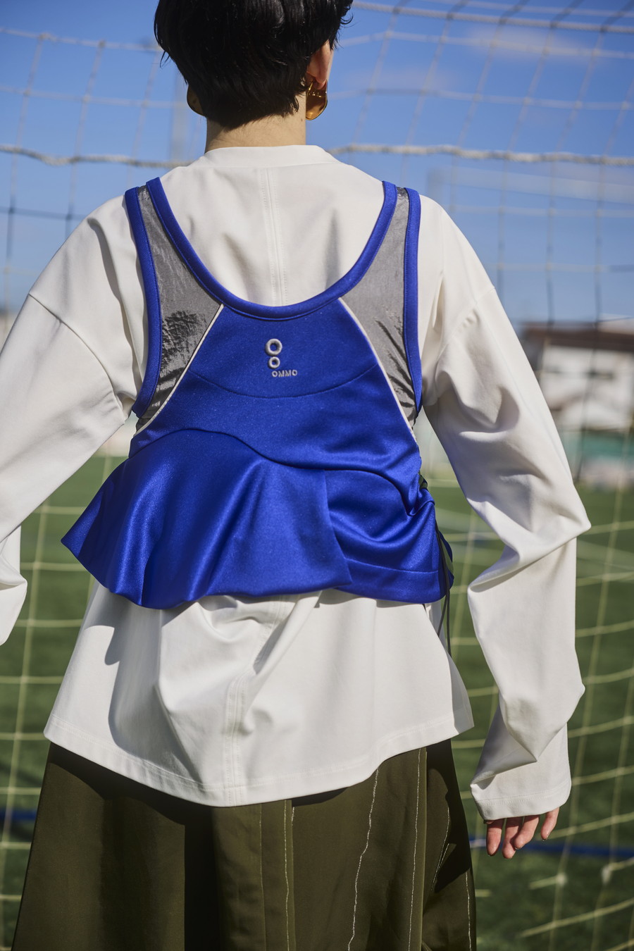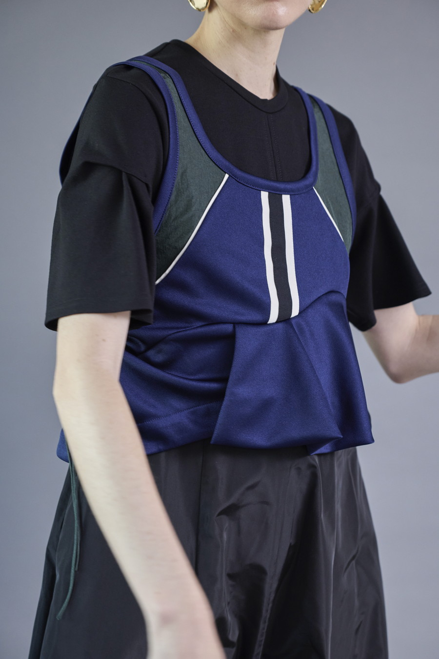 スポーティなトラックデザインを女性らしいギャザーフレアーデザインに落とし込んだタンク型ビスチェトップス。程良い伸縮性を兼ね備えたスポーツジャージ素材を使用しています。背中とアームホールを大きめに開けている為、オーバーサイズシャツやカットソー、ワンピースなど幅広いアイテムとのレイヤードを楽しんでいただける今シーズンイチオシのシリーズです。