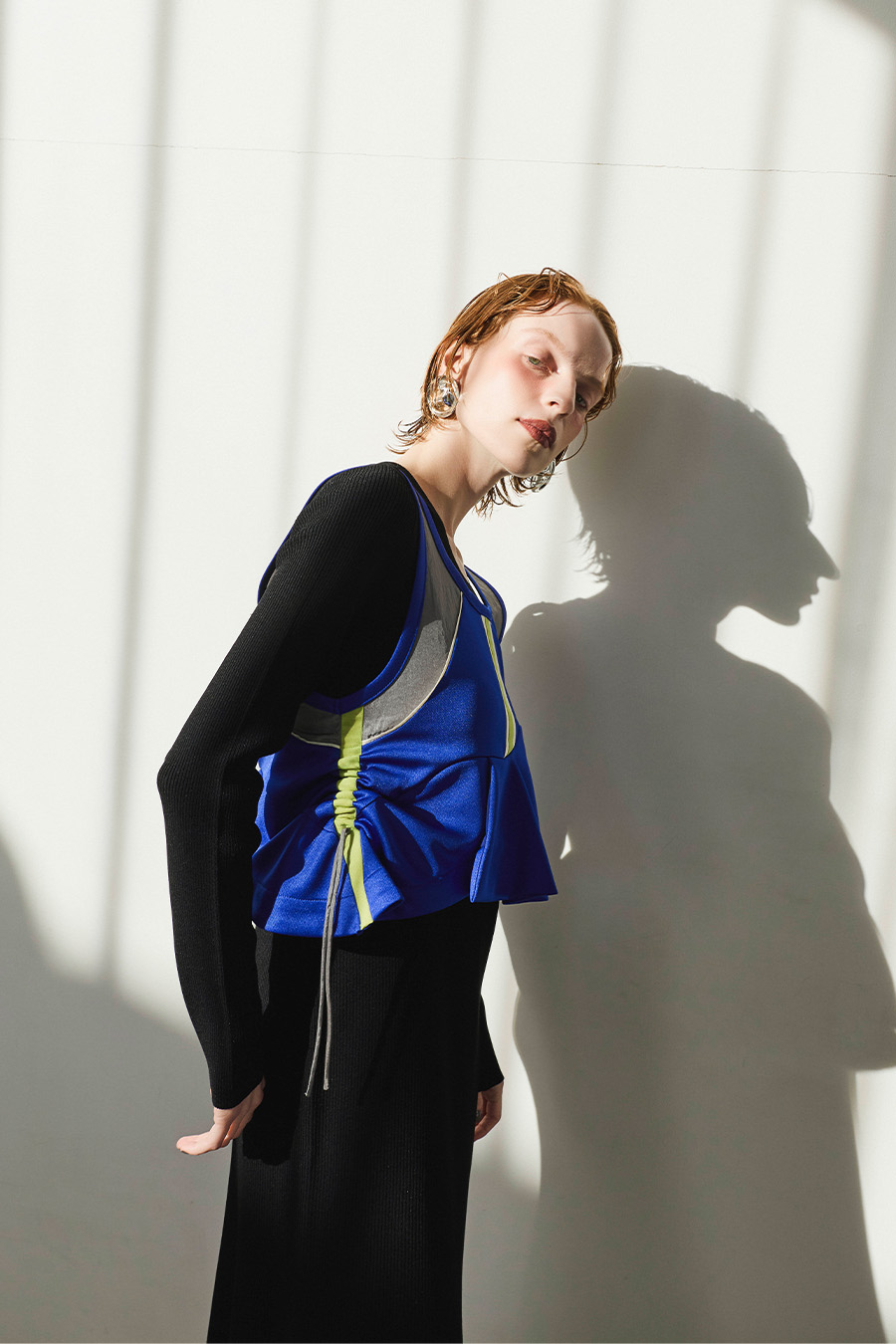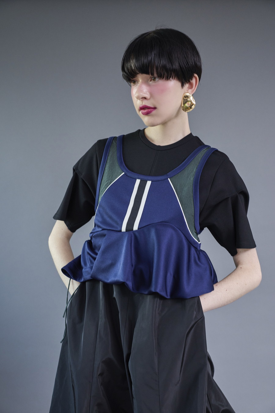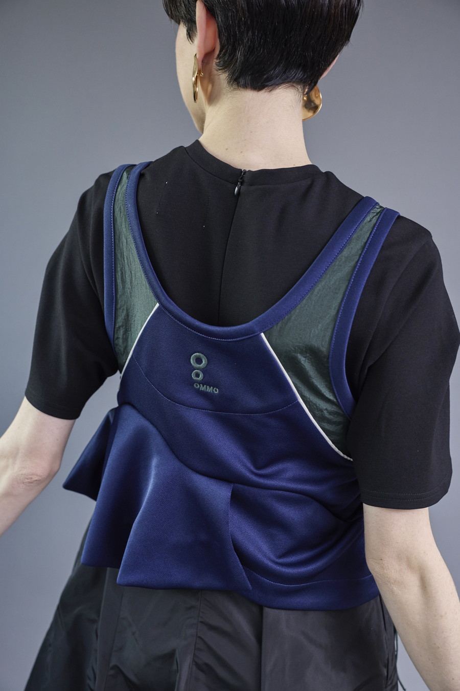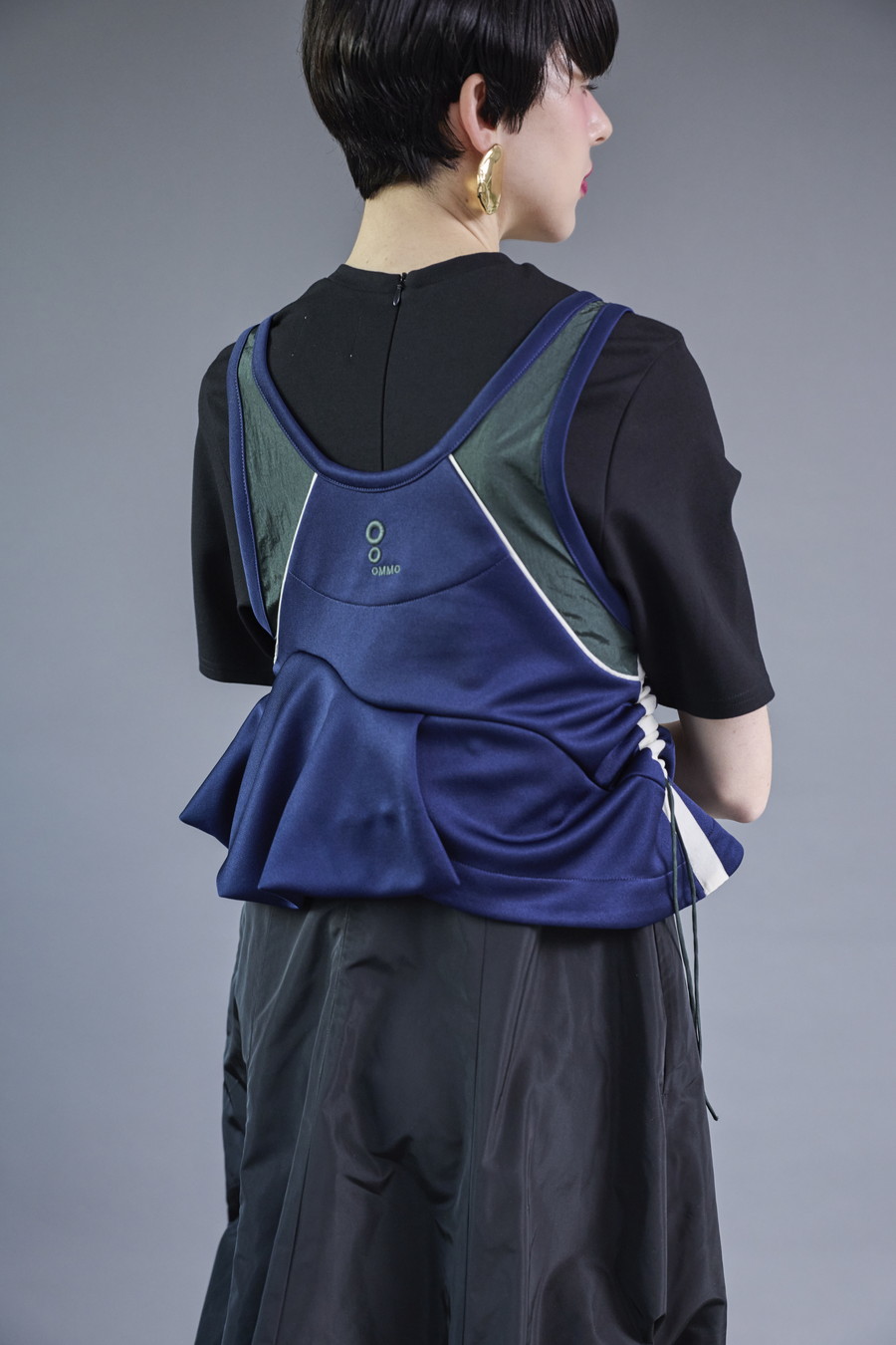 スポーティなトラックデザインを女性らしいギャザーフレアーデザインに落とし込んだタンク型ビスチェトップス。程良い伸縮性を兼ね備えたスポーツジャージ素材を使用しています。背中とアームホールを大きめに開けている為、オーバーサイズシャツやカットソー、ワンピースなど幅広いアイテムとのレイヤードを楽しんでいただける今シーズンイチオシのシリーズです。