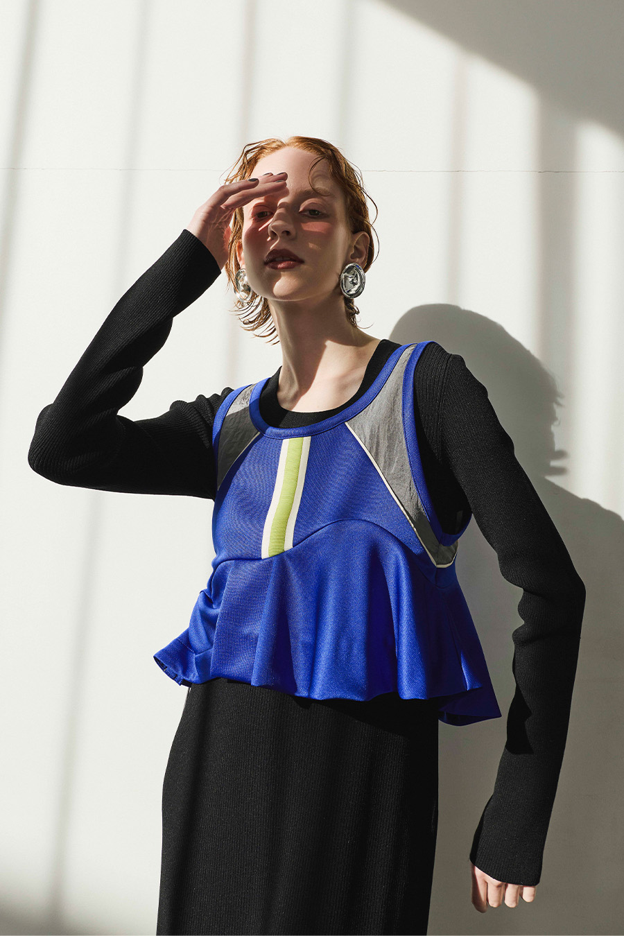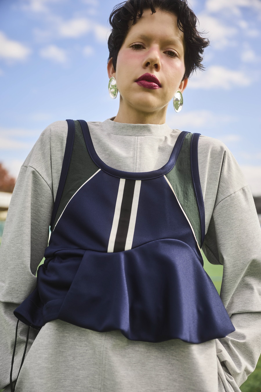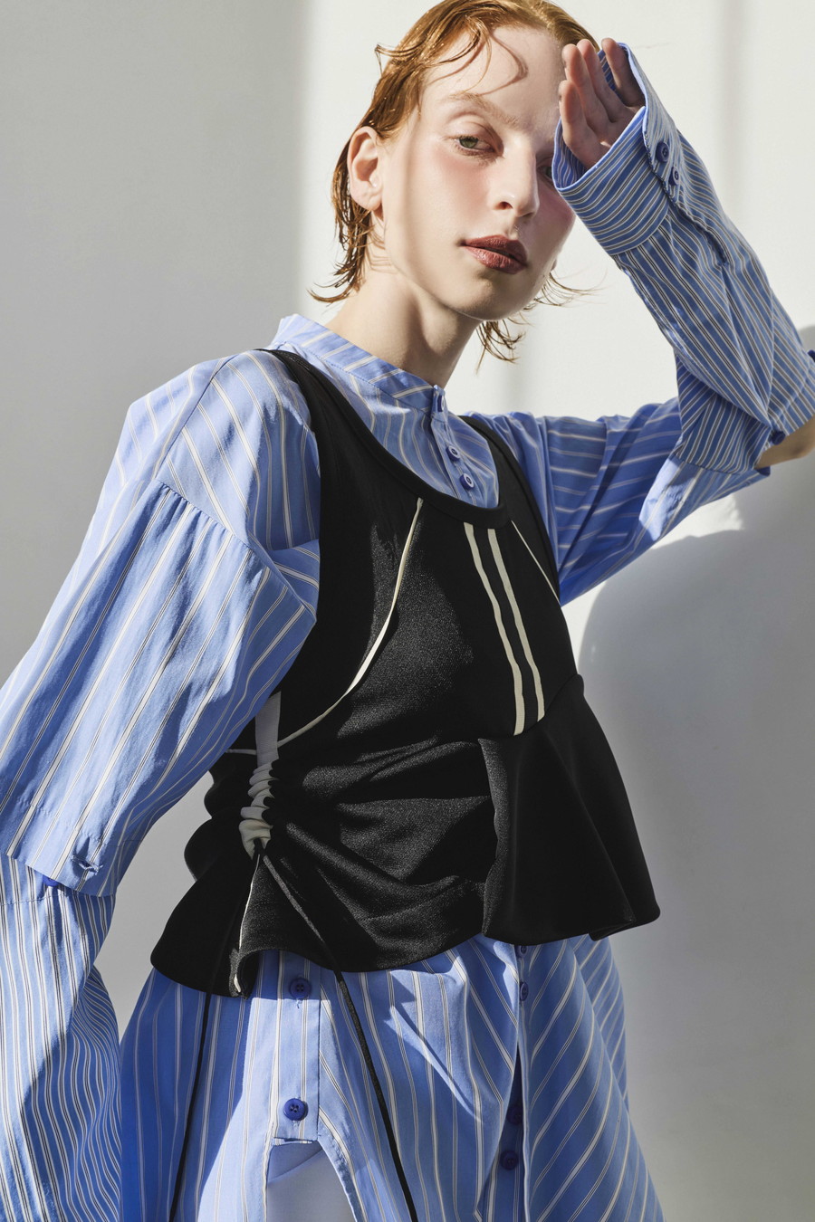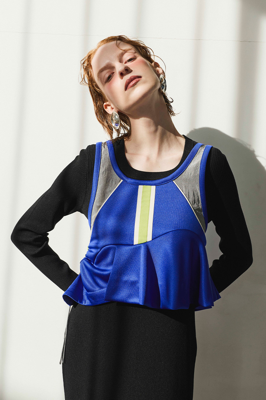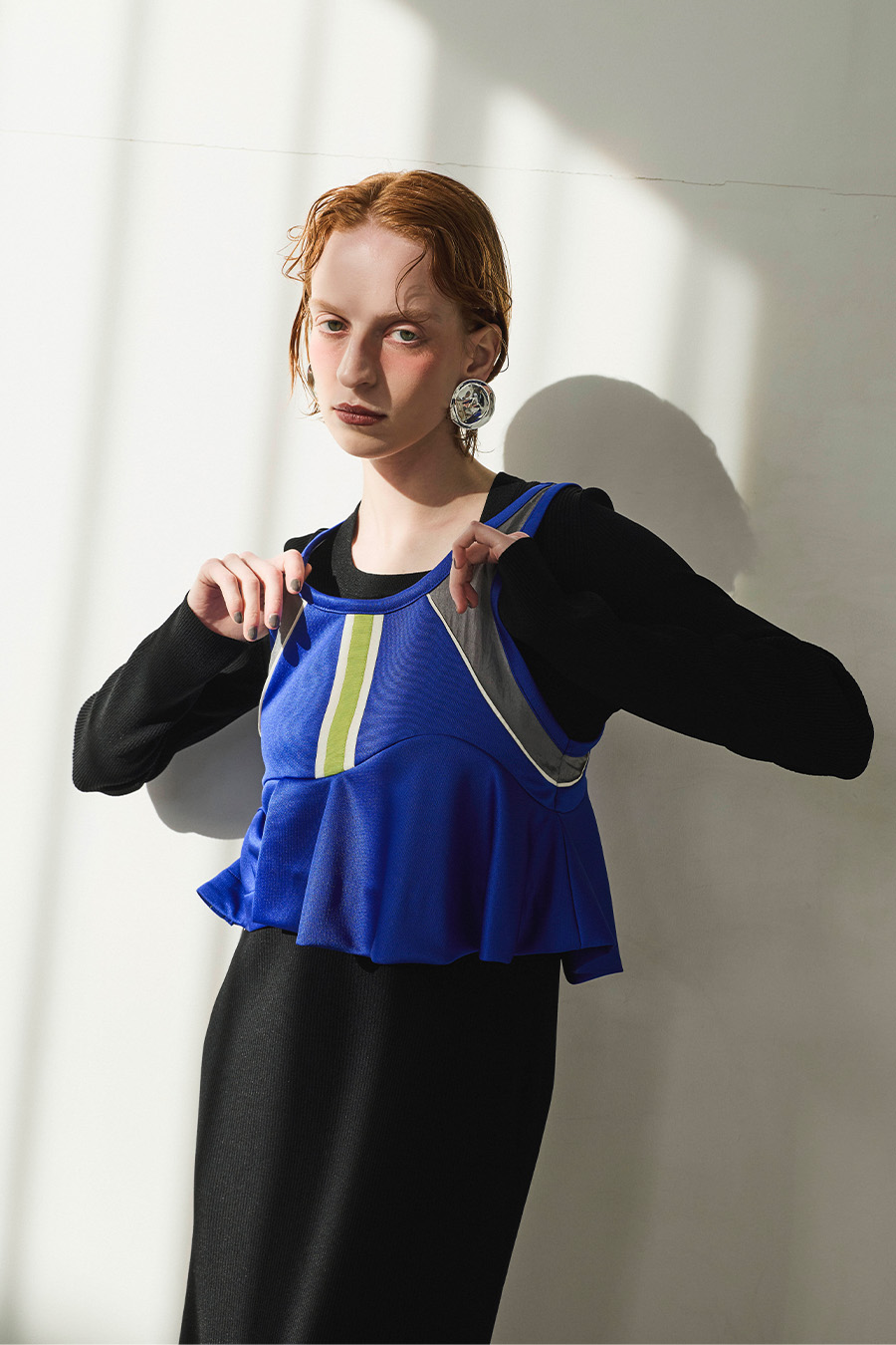 スポーティなトラックデザインを女性らしいギャザーフレアーデザインに落とし込んだタンク型ビスチェトップス。程良い伸縮性を兼ね備えたスポーツジャージ素材を使用しています。背中とアームホールを大きめに開けている為、オーバーサイズシャツやカットソー、ワンピースなど幅広いアイテムとのレイヤードを楽しんでいただける今シーズンイチオシのシリーズです。