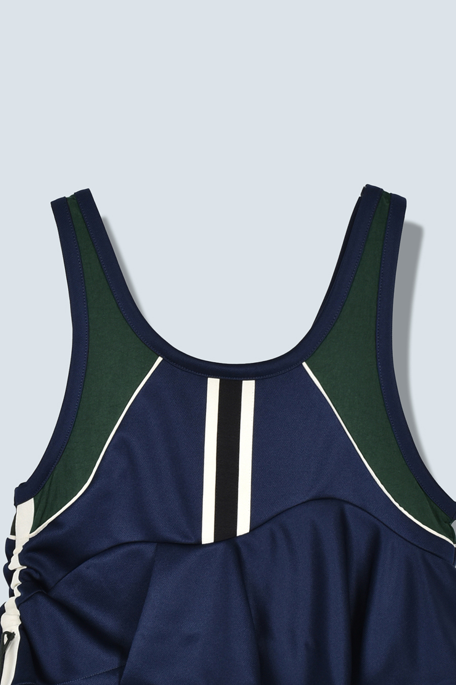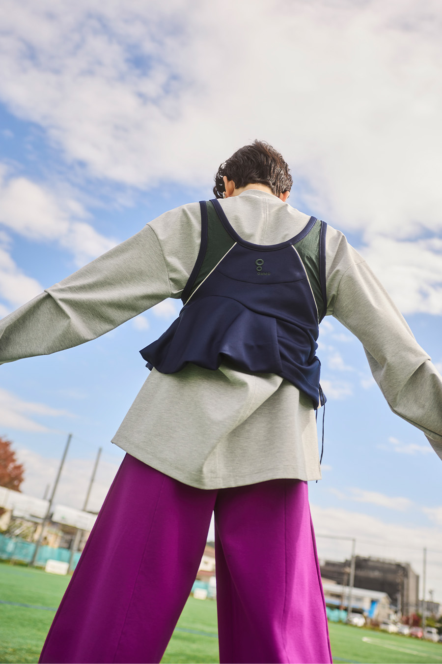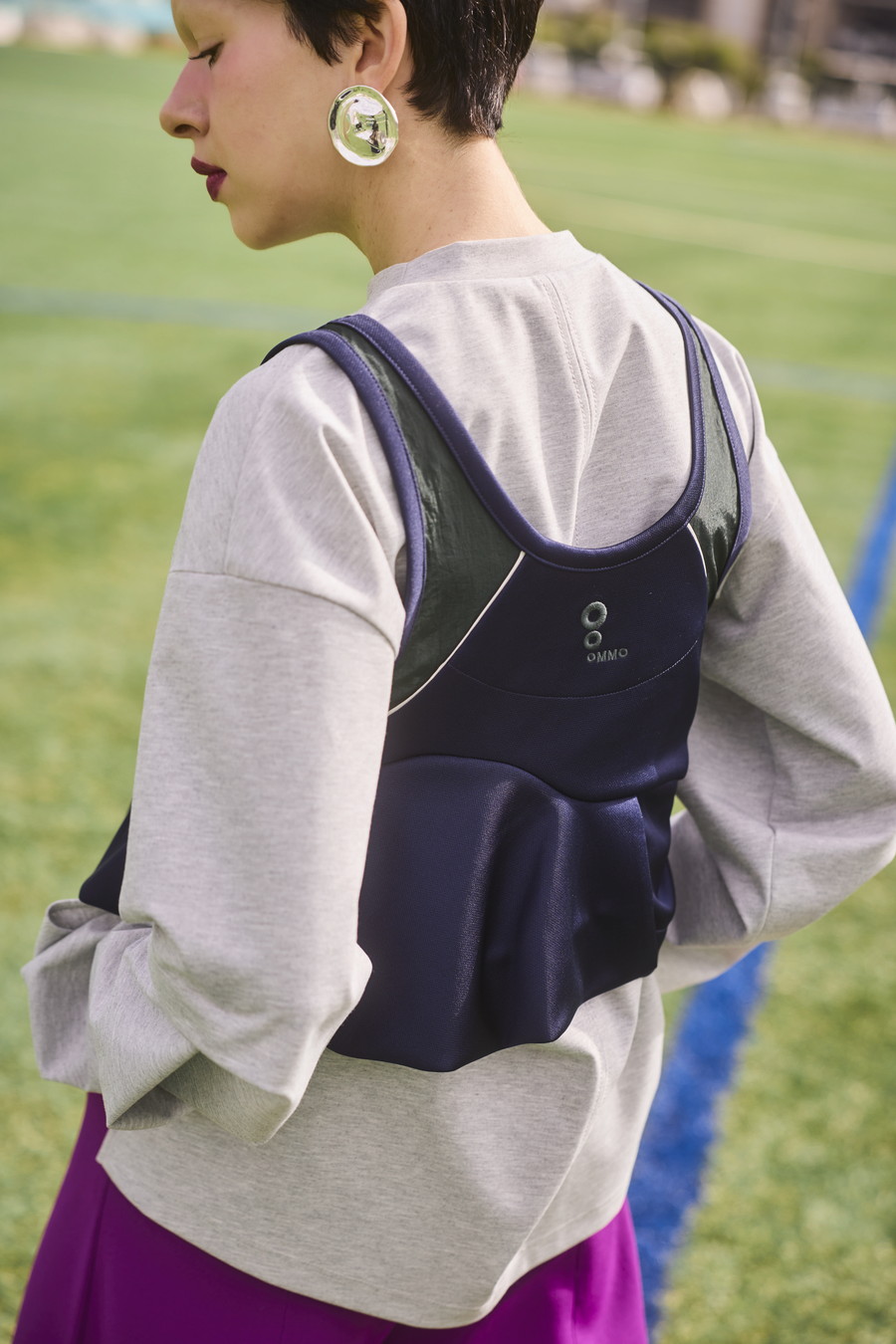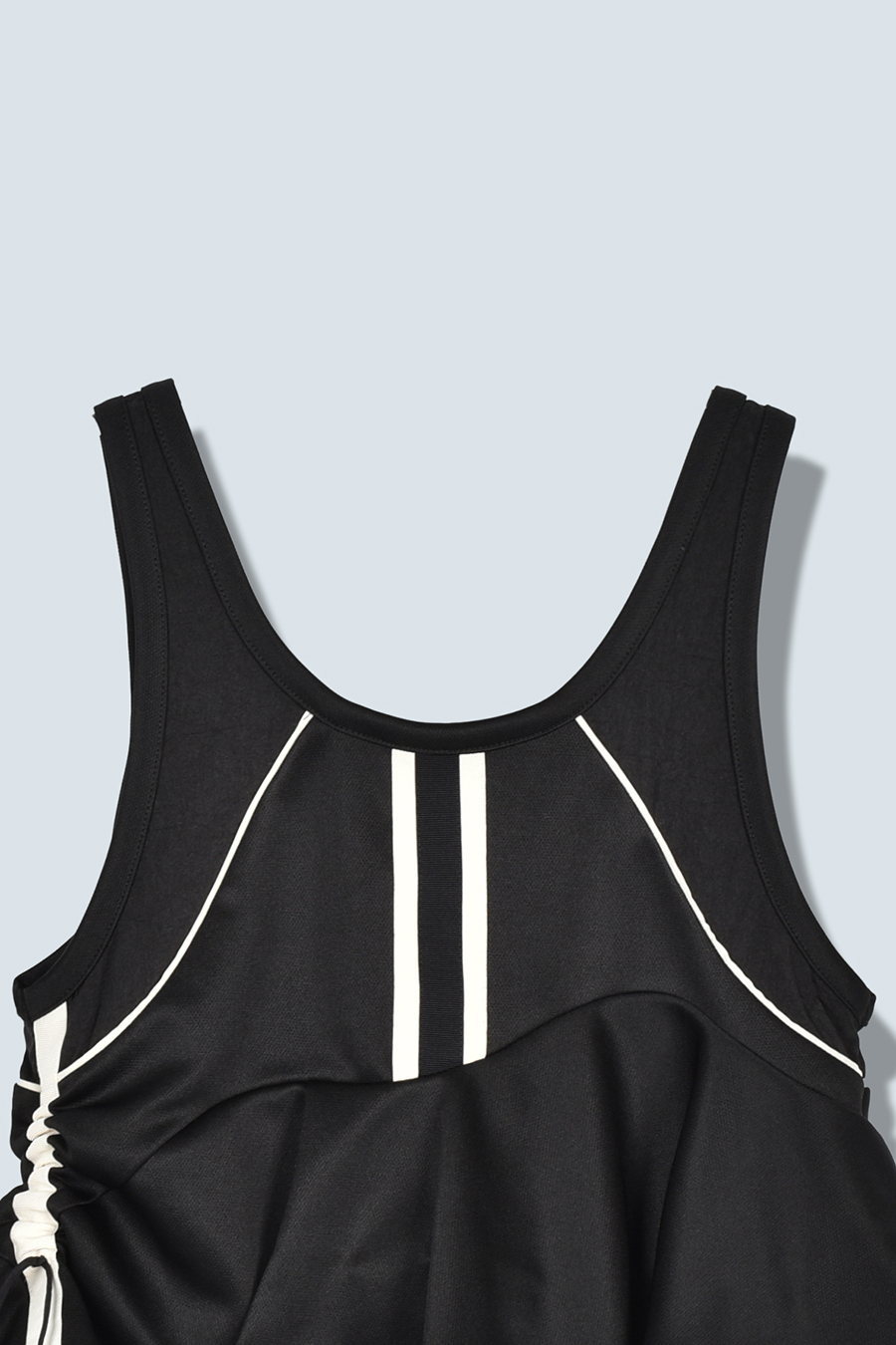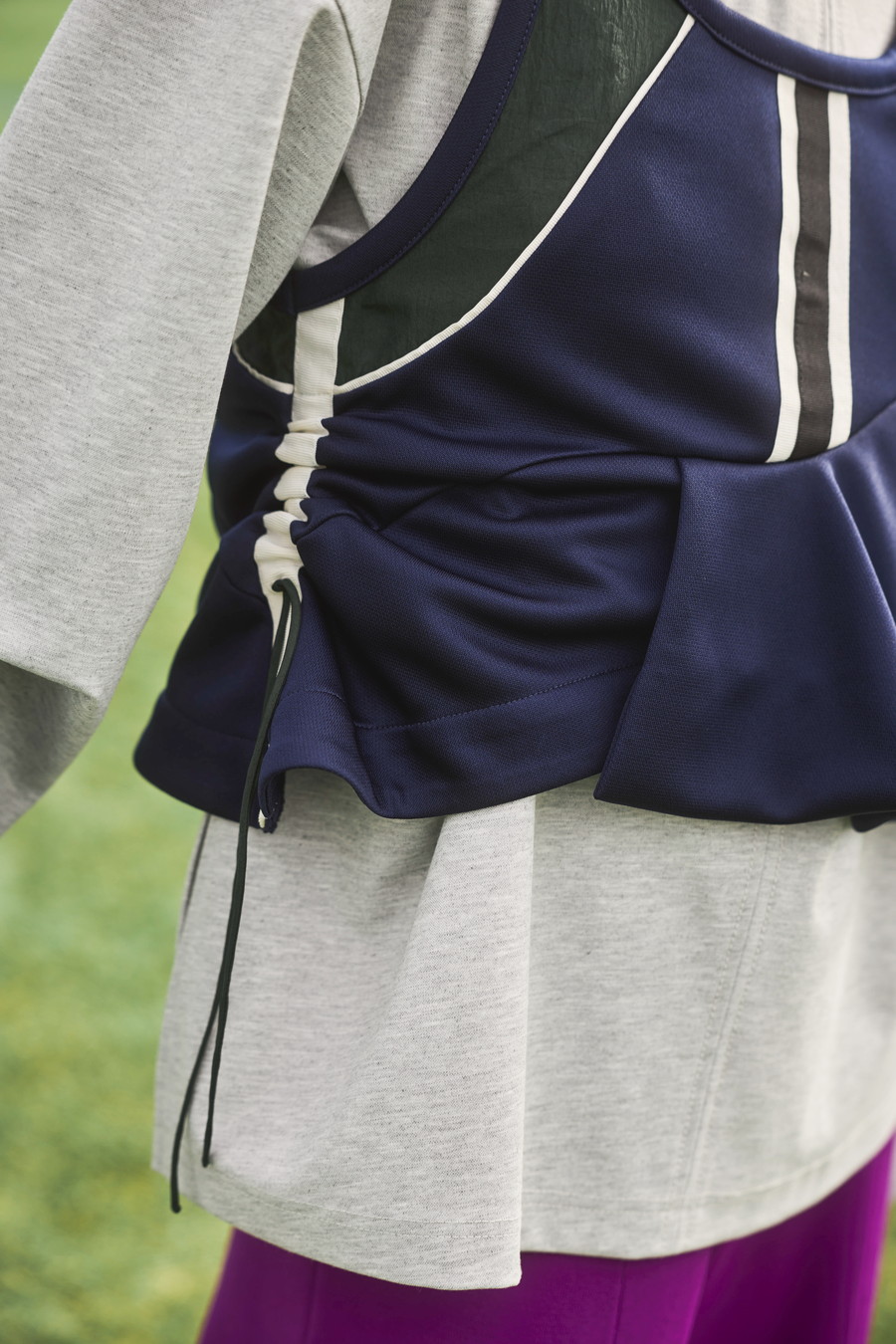 スポーティなトラックデザインを女性らしいギャザーフレアーデザインに落とし込んだタンク型ビスチェトップス。程良い伸縮性を兼ね備えたスポーツジャージ素材を使用しています。背中とアームホールを大きめに開けている為、オーバーサイズシャツやカットソー、ワンピースなど幅広いアイテムとのレイヤードを楽しんでいただける今シーズンイチオシのシリーズです。