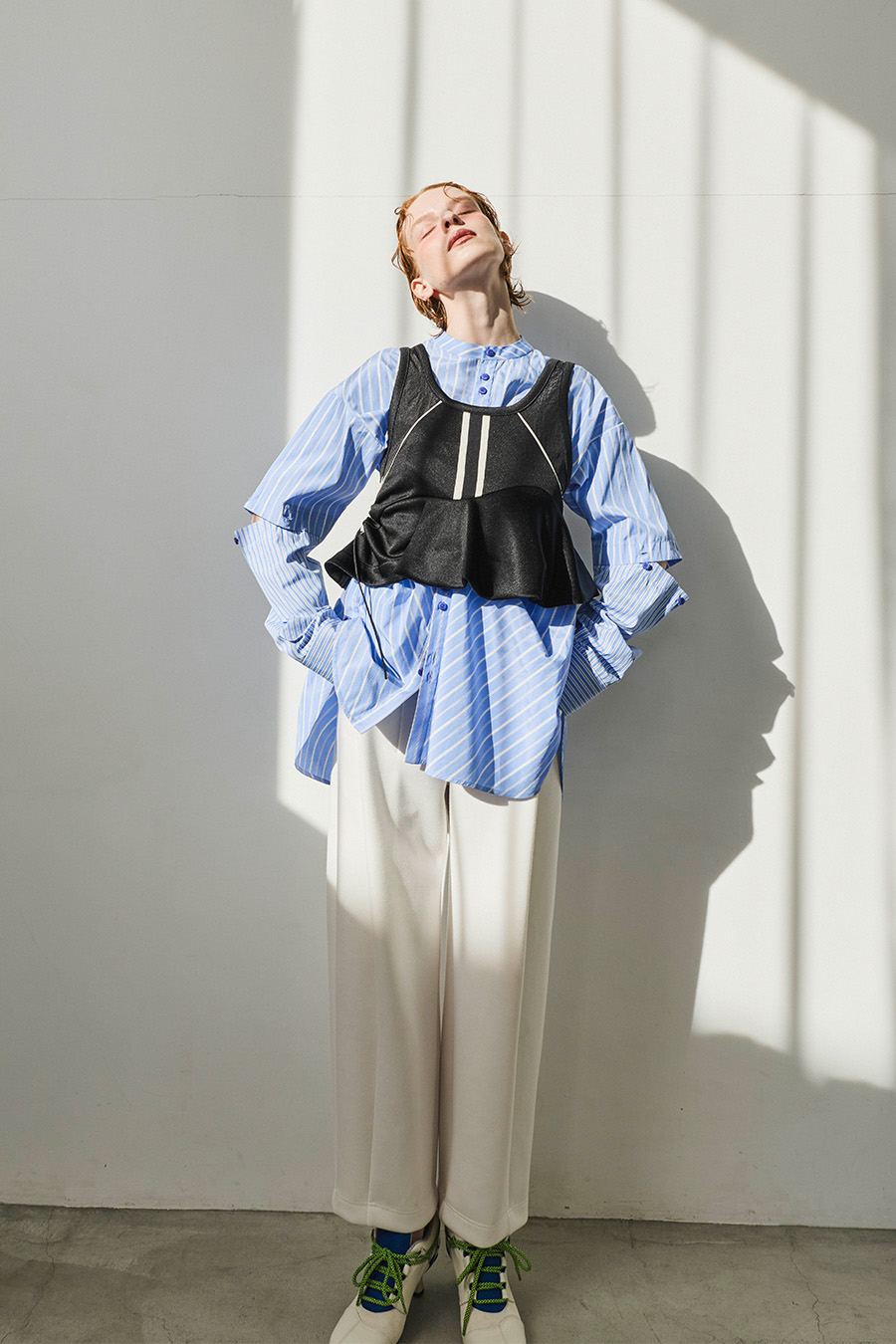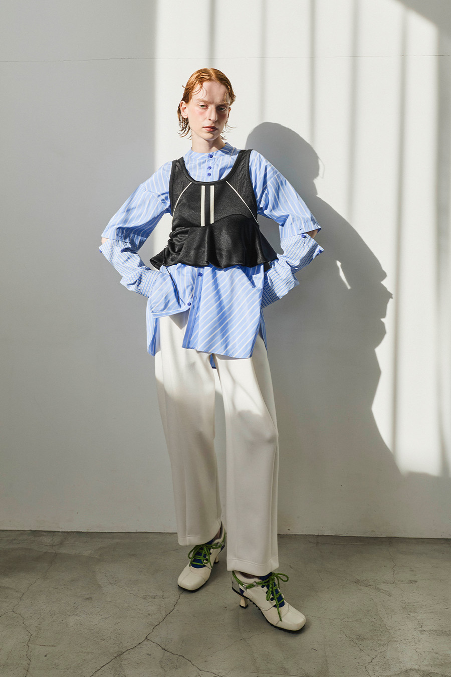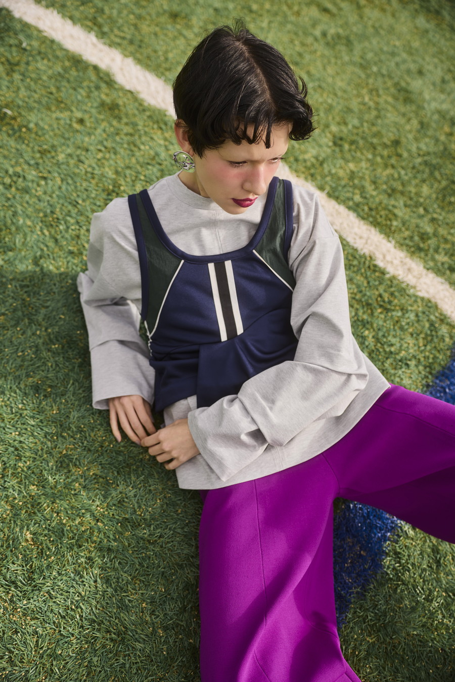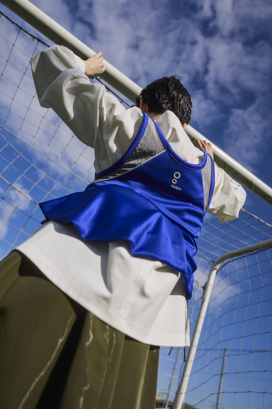 スポーティなトラックデザインを女性らしいギャザーフレアーデザインに落とし込んだタンク型ビスチェトップス。程良い伸縮性を兼ね備えたスポーツジャージ素材を使用しています。背中とアームホールを大きめに開けている為、オーバーサイズシャツやカットソー、ワンピースなど幅広いアイテムとのレイヤードを楽しんでいただける今シーズンイチオシのシリーズです。